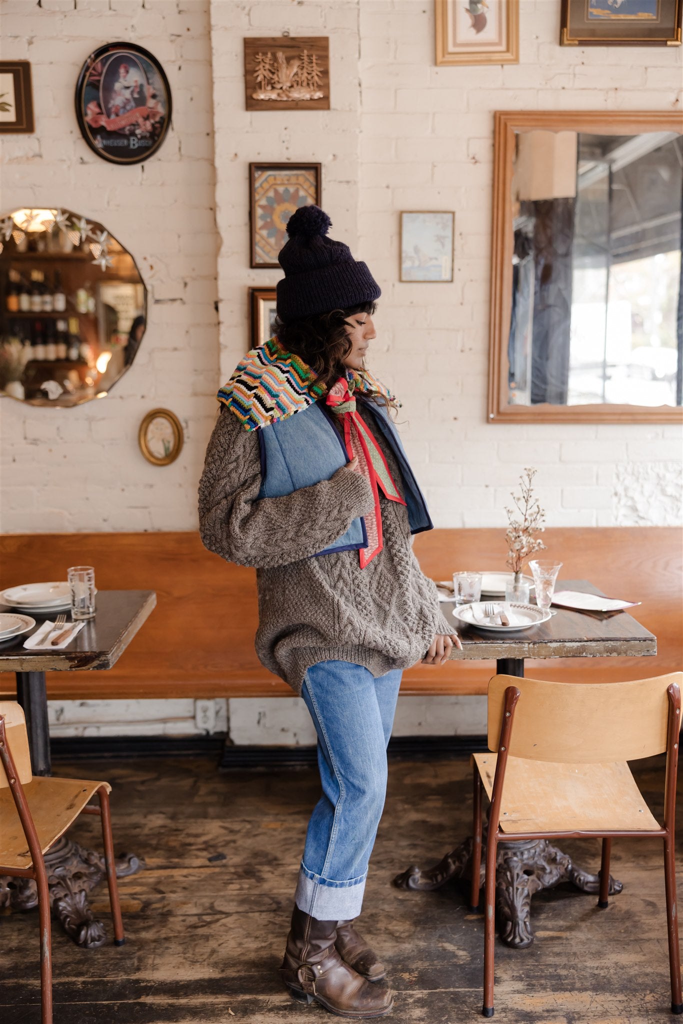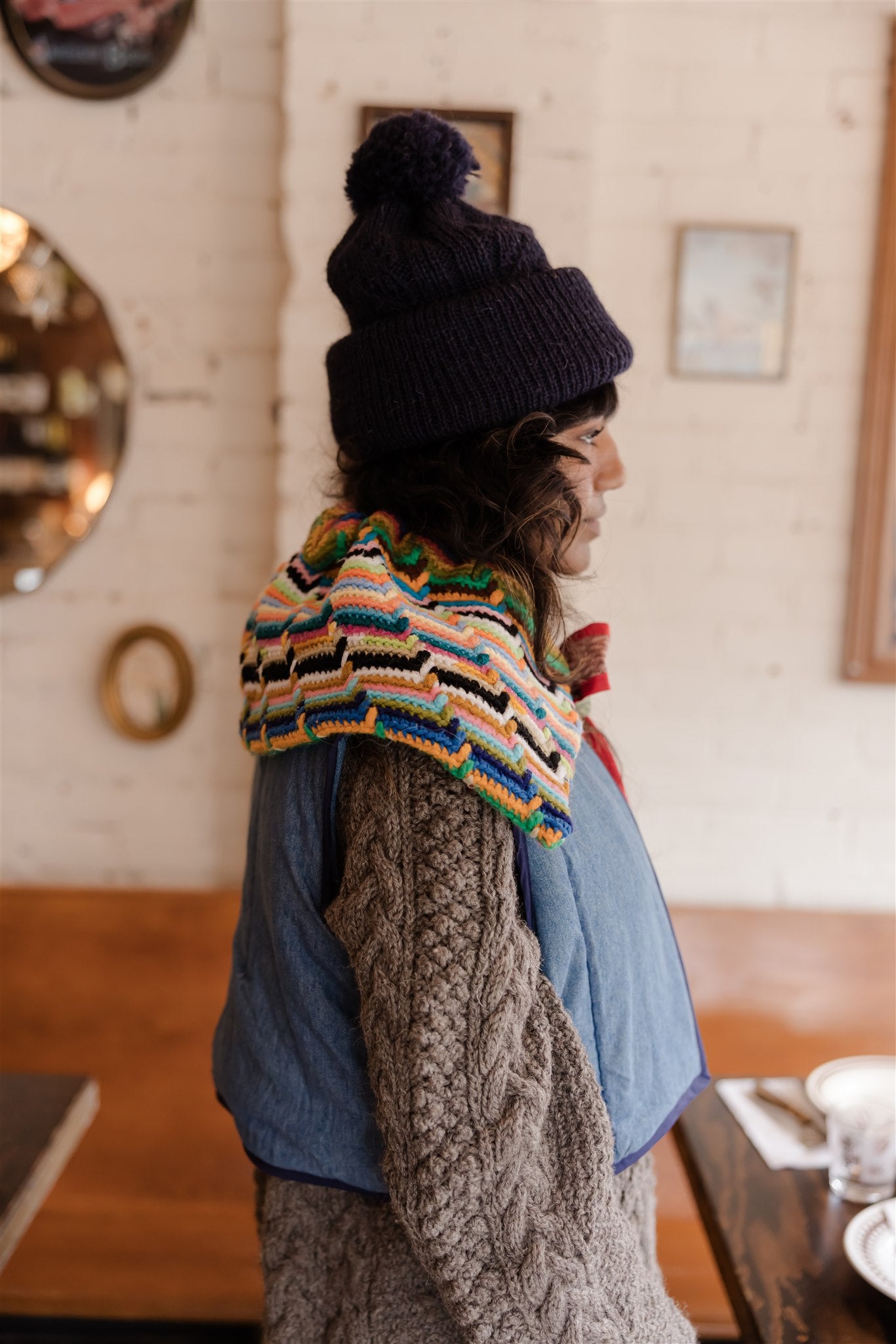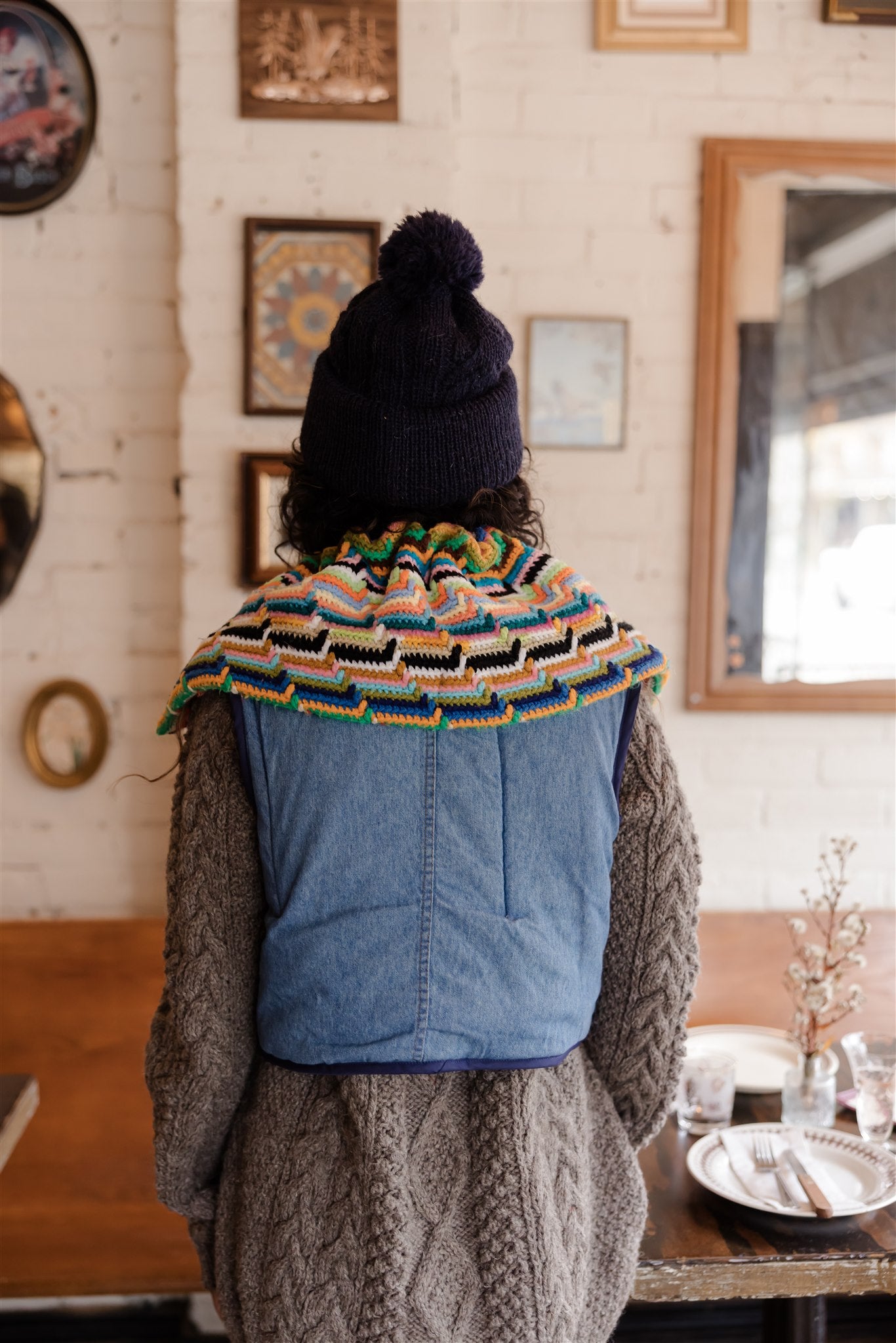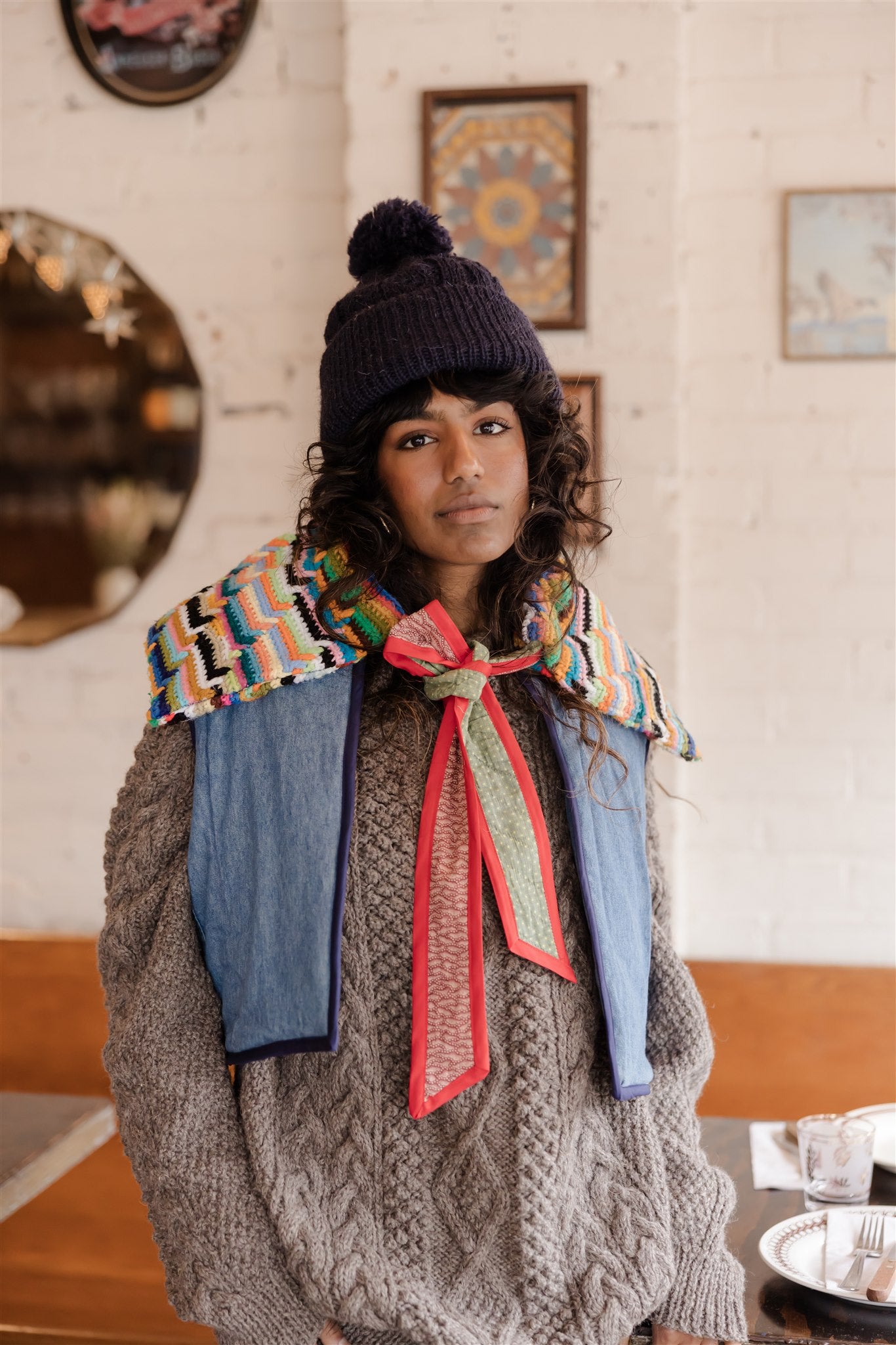 In a glimmer of winter whimsy, our enchanting Noëlle Collar arrives this season in a celebration of colour and craft. An avant garde accessory to style over dresses, vests, blouses and coats, Noëlle is composed in a spectacular archive of salvaged vintage crochet with a voluminous, adjustable shape. Complete with a double-sided quilted tie to wear loose or in a bow, this fibre-forward scarf substitution exudes an air of artistry when winter styling needs it most.