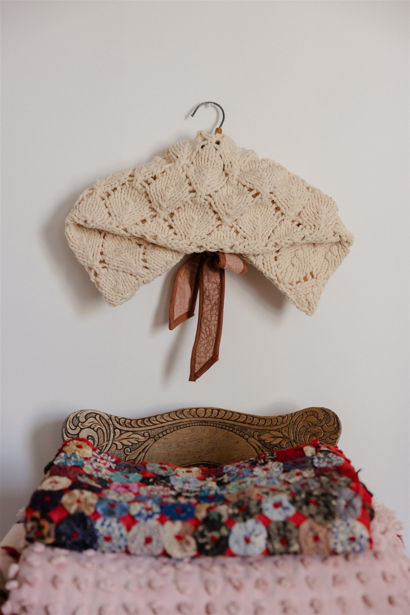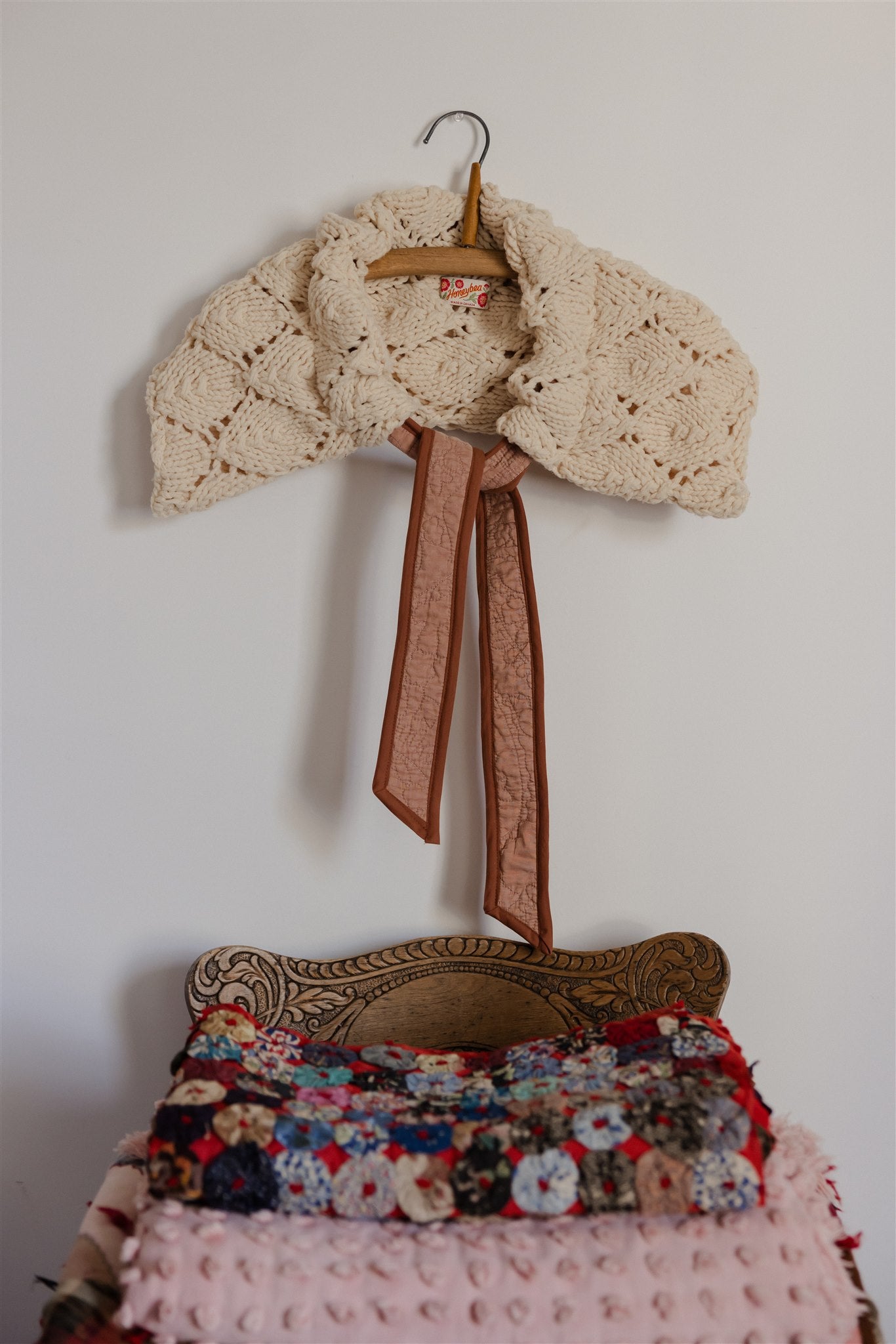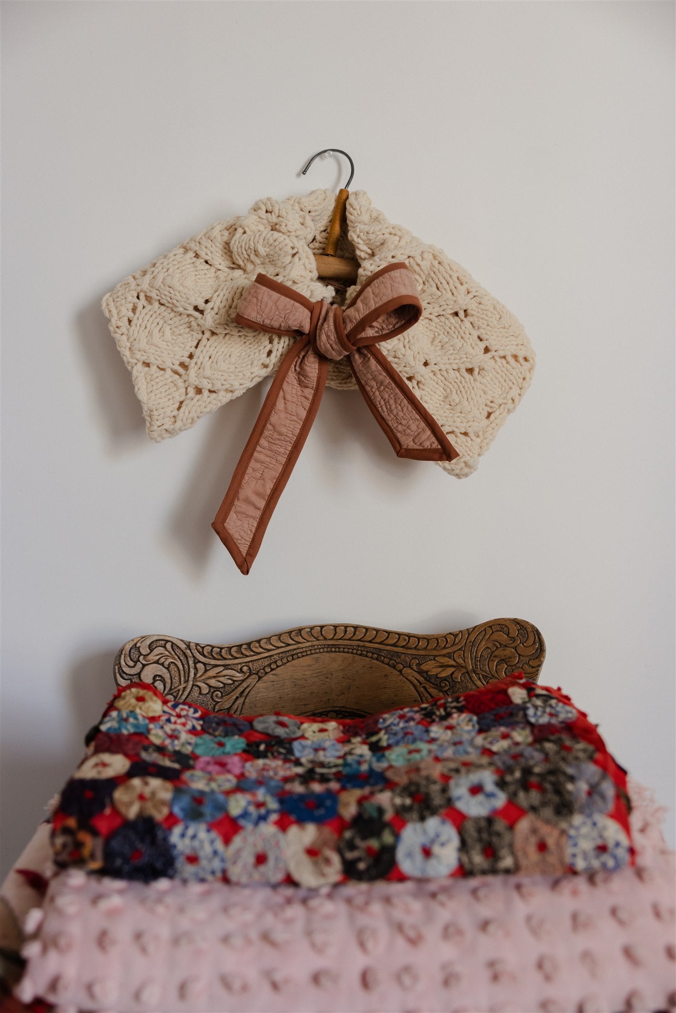 In a glimmer of winter whimsy, our enchanting Noëlle Collar arrives this season in a celebration of colour and craft. An avant garde accessory to style over dresses, vests, blouses and coats, Noëlle is composed in a spectacular archive of salvaged vintage crochet with a voluminous, adjustable shape. Complete with a double-sided quilted tie to wear loose or in a bow, this fibre-forward scarf substitution exudes an air of artistry when winter styling needs it most.