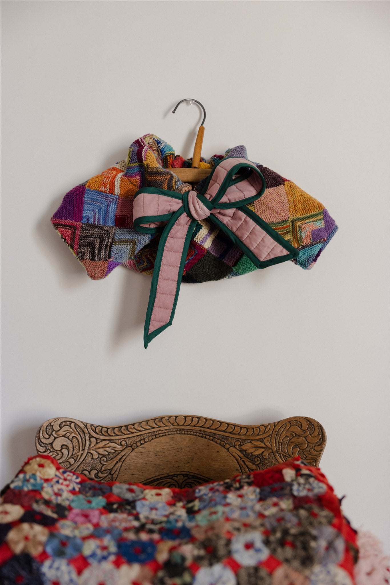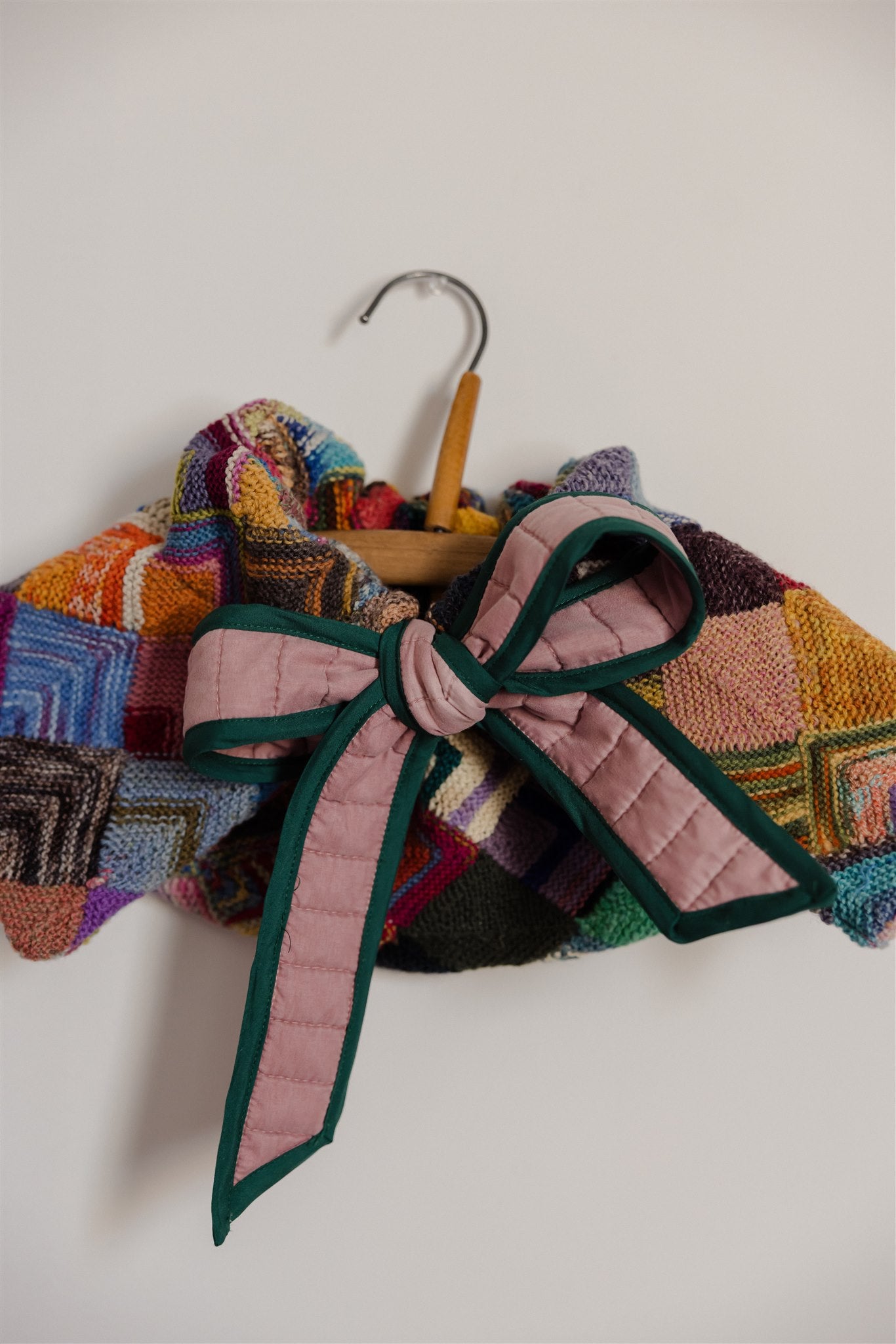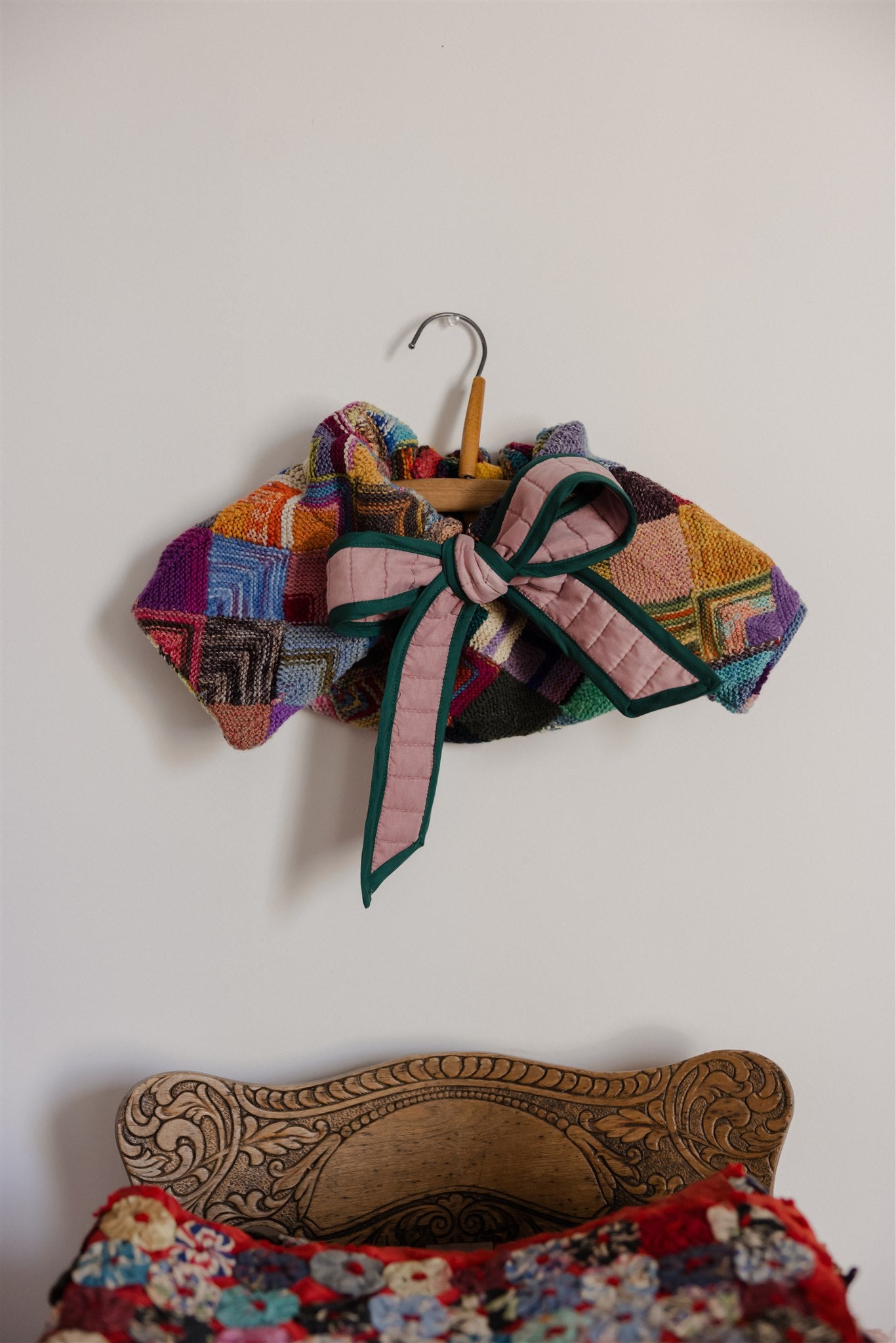 In a glimmer of winter whimsy, our enchanting Noëlle Collar arrives this season in a celebration of colour and craft. An avant garde accessory to style over dresses, vests, blouses and coats, Noëlle is composed in a spectacular archive of salvaged vintage crochet with a voluminous, adjustable shape. Complete with a double-sided quilted tie to wear loose or in a bow, this fibre-forward scarf substitution exudes an air of artistry when winter styling needs it most.
