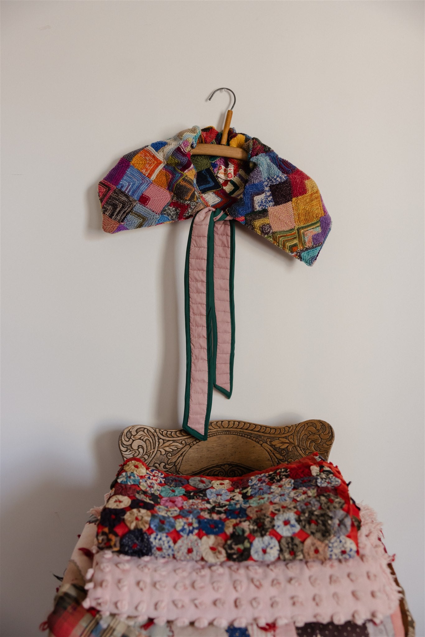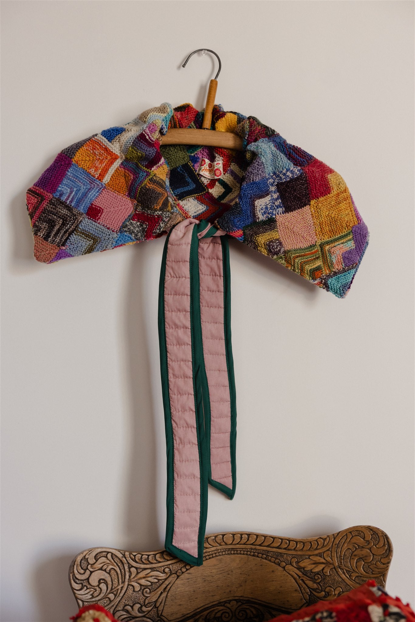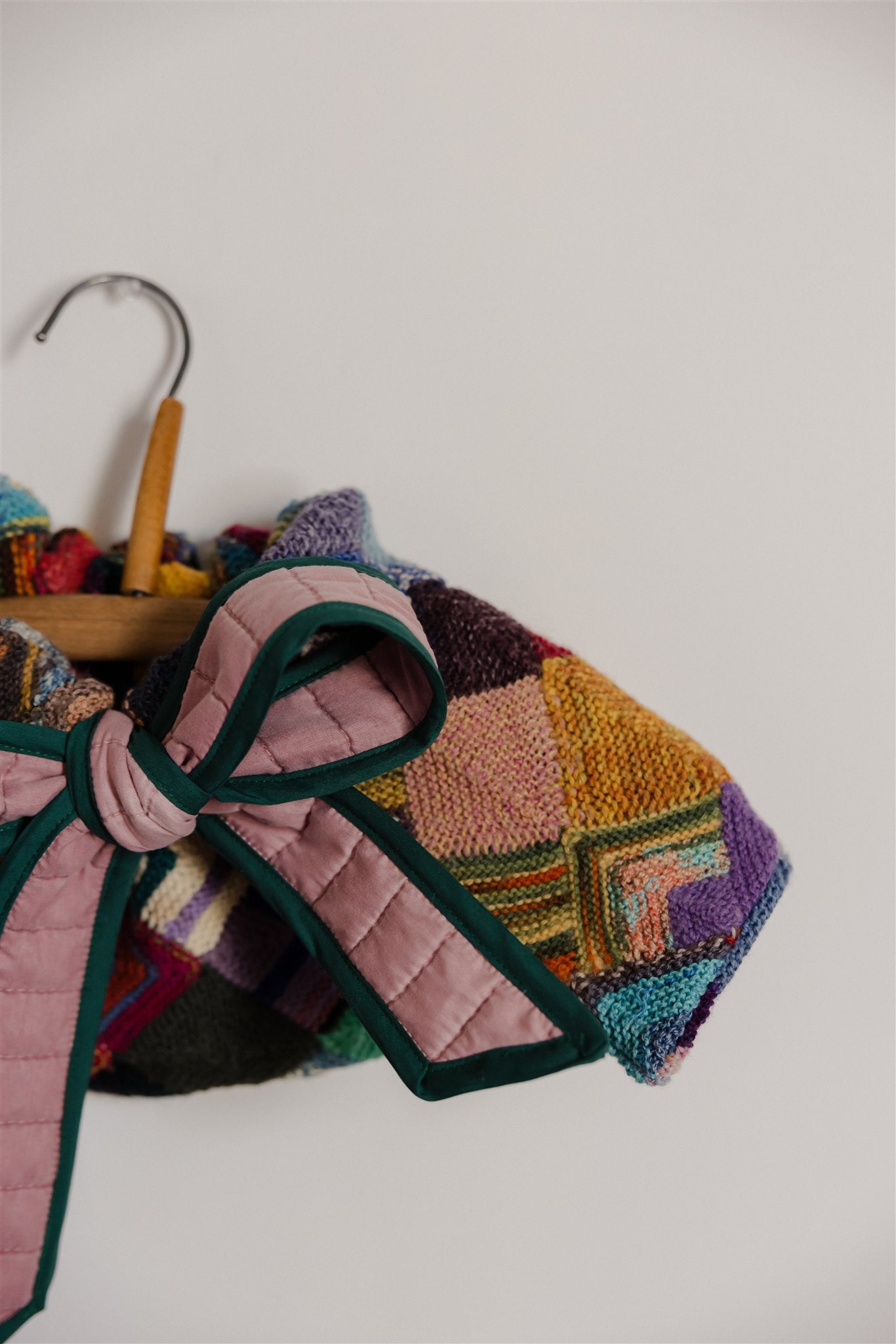 In a glimmer of winter whimsy, our enchanting Noëlle Collar arrives this season in a celebration of colour and craft. An avant garde accessory to style over dresses, vests, blouses and coats, Noëlle is composed in a spectacular archive of salvaged vintage crochet with a voluminous, adjustable shape. Complete with a double-sided quilted tie to wear loose or in a bow, this fibre-forward scarf substitution exudes an air of artistry when winter styling needs it most.