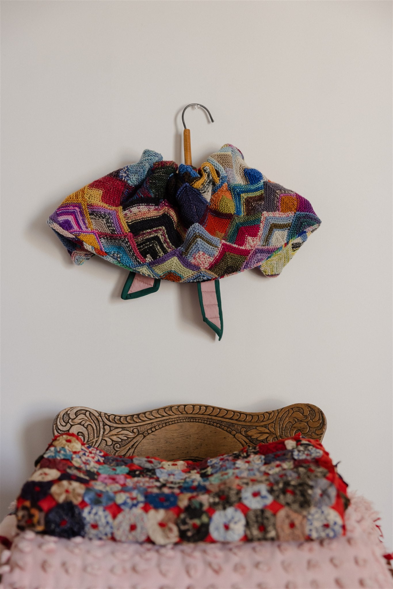 Made of premium, hand-picked vintage crochet blankets, each textile has been carefully selected for its yarn quality and handfeel, however, our fibre content remains unknown.