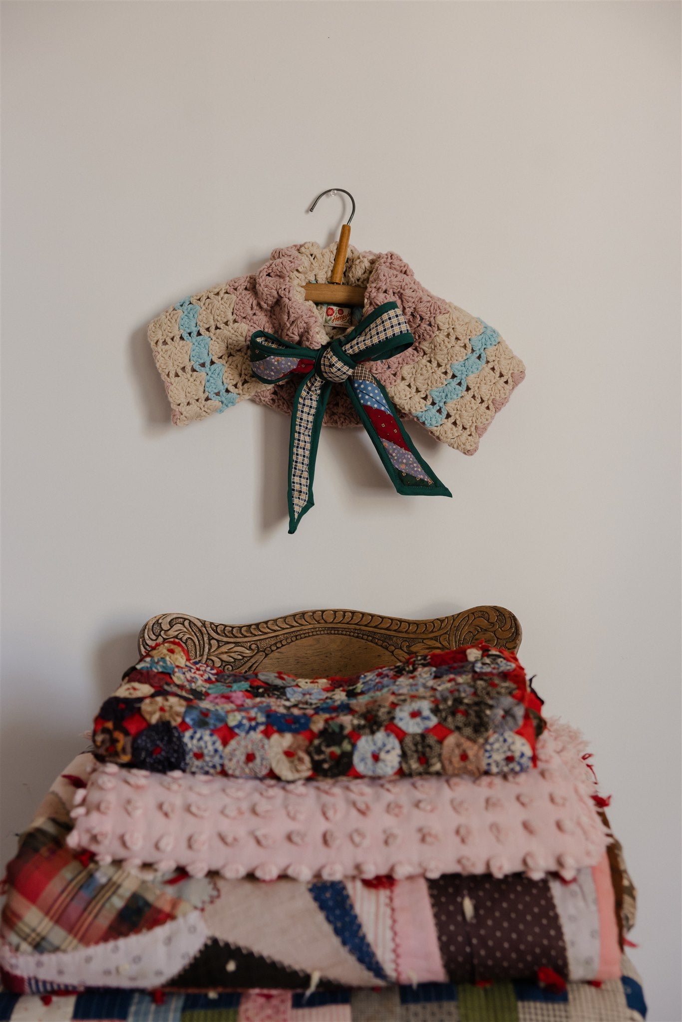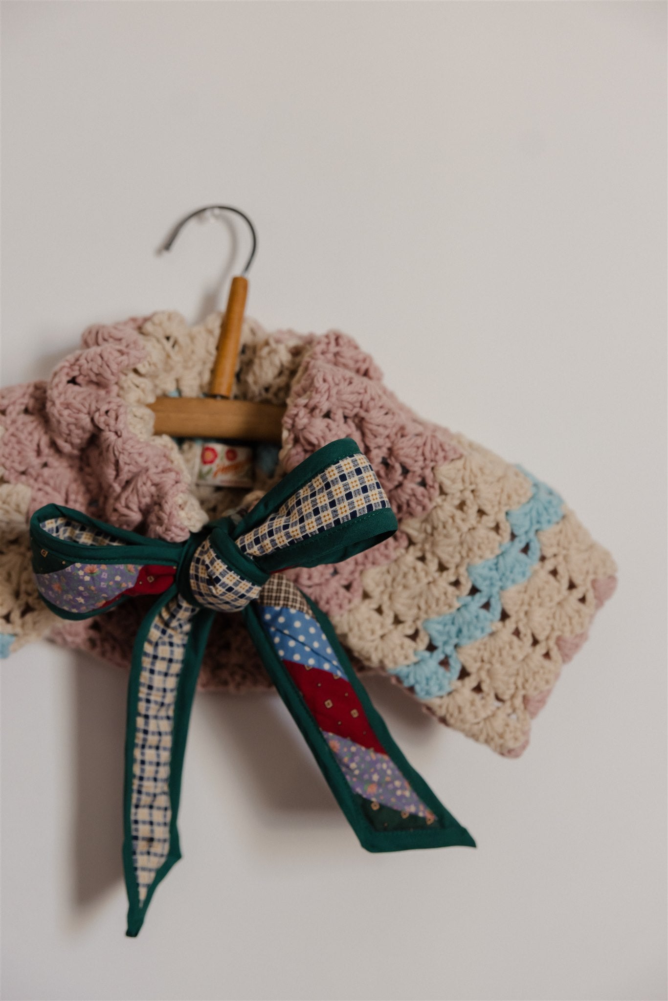 In a glimmer of winter whimsy, our enchanting Noëlle Collar arrives this season in a celebration of colour and craft. An avant garde accessory to style over dresses, vests, blouses and coats, Noëlle is composed in a spectacular archive of salvaged vintage crochet with a voluminous, adjustable shape. Complete with a double-sided quilted tie to wear loose or in a bow, this fibre-forward scarf substitution exudes an air of artistry when winter styling needs it most.