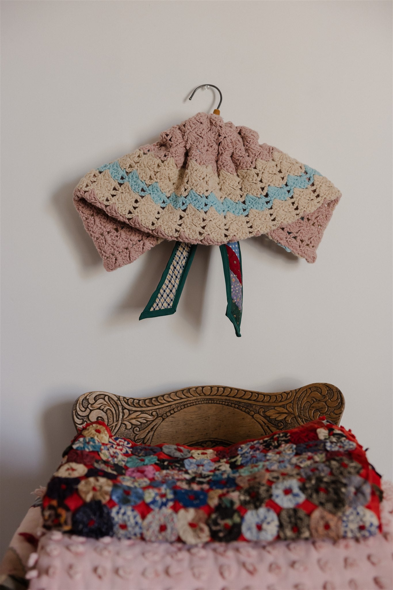 Made of premium, hand-picked vintage crochet blankets, each textile has been carefully selected for its yarn quality and handfeel, however, our fibre content remains unknown.