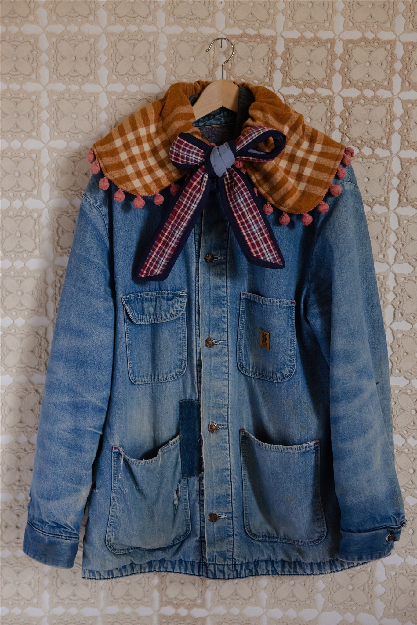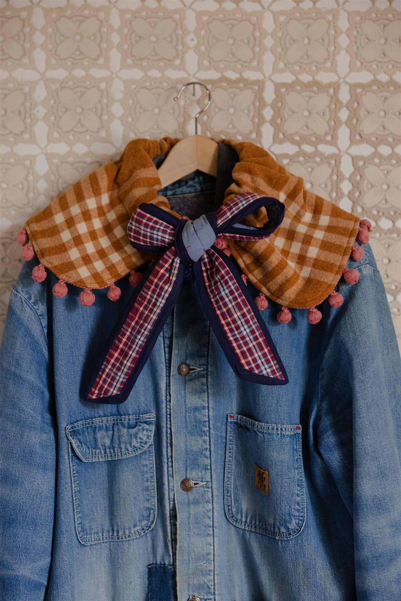 A free-spirited celebration of colour and craft, our Noëlle Collar has quickly become a coveted community favourite. An avant garde accessory to style over dresses, overalls, blouses and coats, this limited edition capsule collection is composed of vintage and heirloom wool blankets adorned with a very special archive of cotton pom poms, tassels and fringe for an added pop over spring denim and other timeless layers. Adjustable in design with a quilted drawstring tie, Noëlle is an ultra versatile, fibre-forward art piece that we have loved seeing you enjoy in endless iterations.
