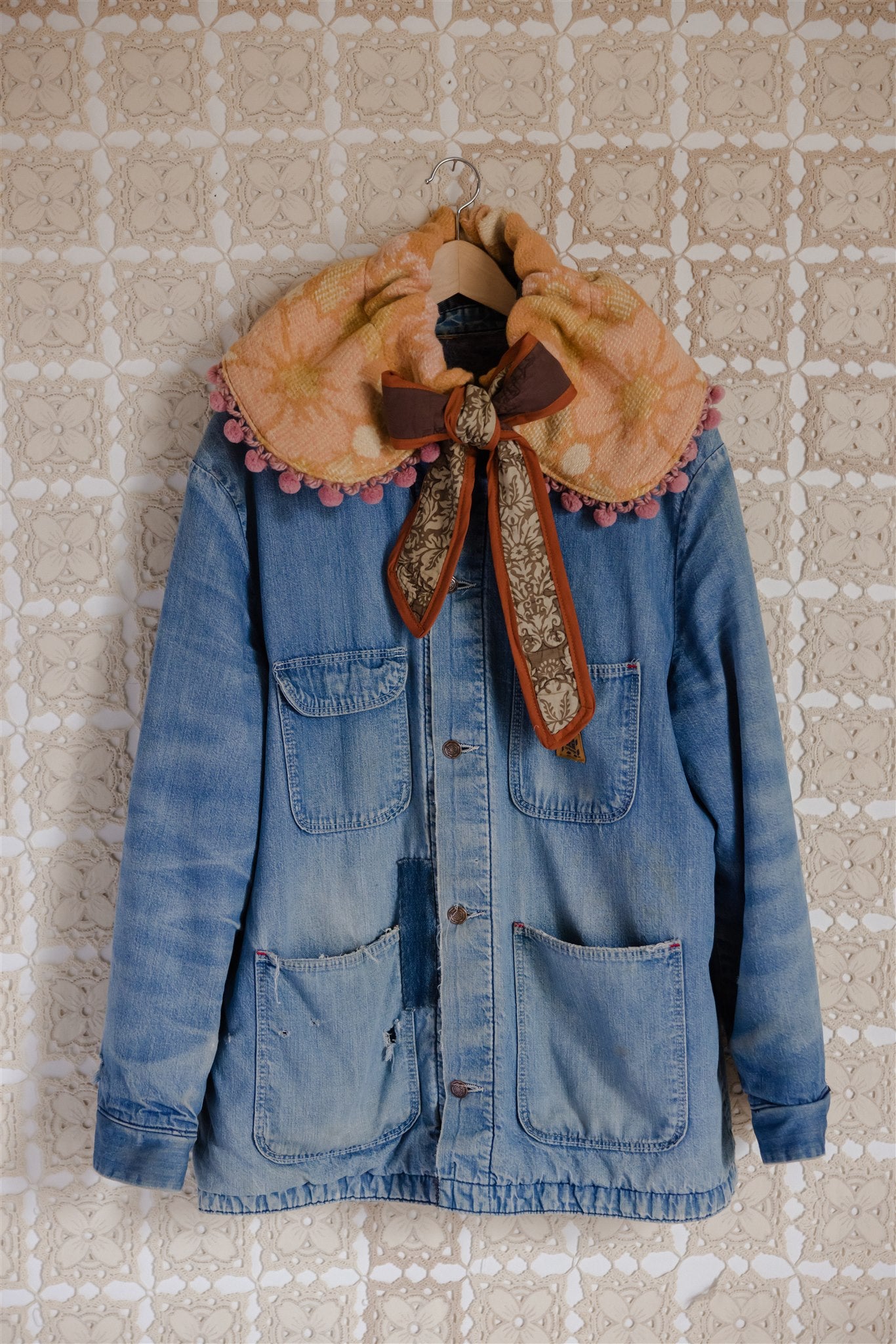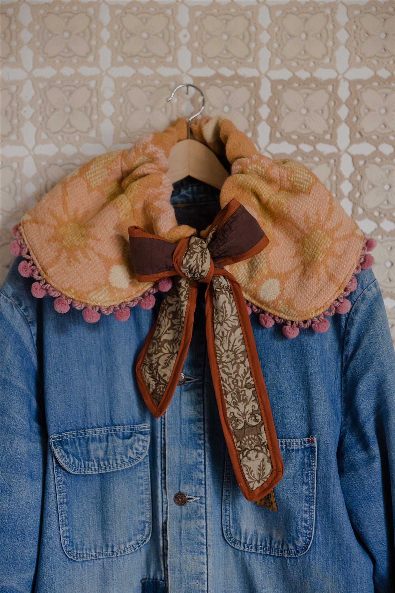 A free-spirited celebration of colour and craft, our Noëlle Collar has quickly become a coveted community favourite. An avant garde accessory to style over dresses, overalls, blouses and coats, this limited edition capsule collection is composed of vintage and heirloom wool blankets adorned with a very special archive of cotton pom poms, tassels and fringe for an added pop over spring denim and other timeless layers. Adjustable in design with a quilted drawstring tie, Noëlle is an ultra versatile, fibre-forward art piece that we have loved seeing you enjoy in endless iterations.