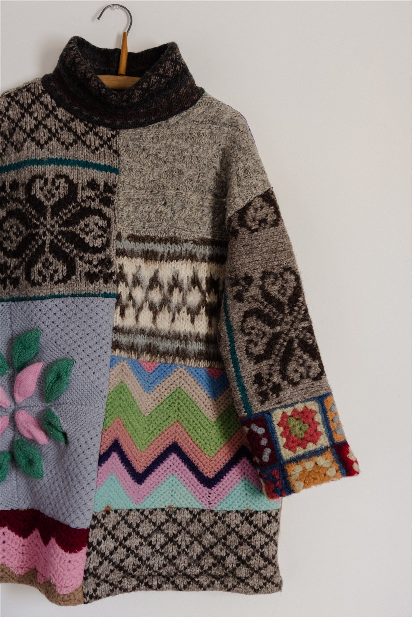 Our Patchwork Pullover was thoughtfully designed in one size silhouette to make this very limited collection as accessible as possible. Landing just above, or around the knee, a long knit was what we wanted while keeping it super wearable.