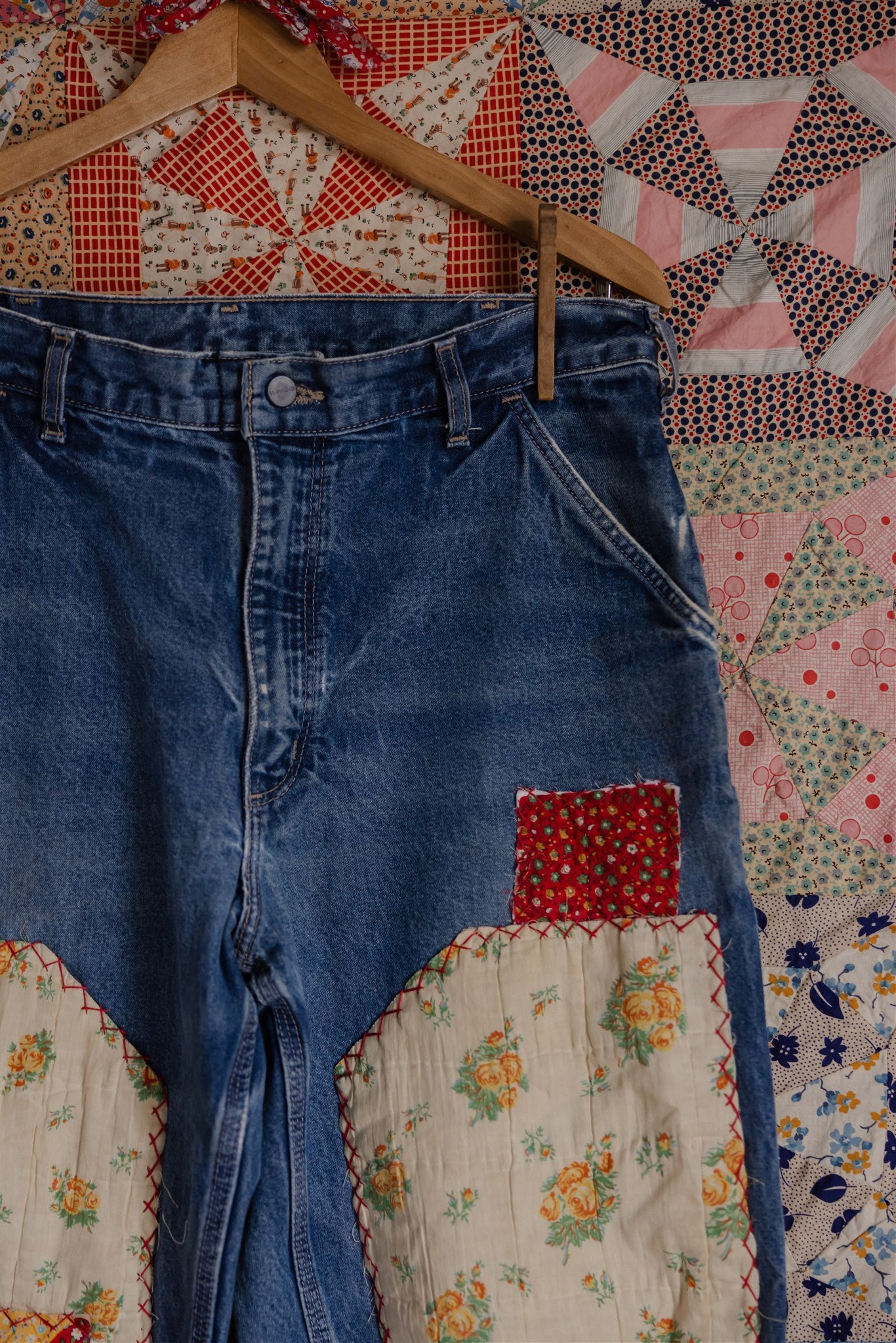 The best vintage denim just got better! Patched with the remnants of our beloved quilt and textile treasury and hand-stitched with pink embroidery floss, we have added our own special touch to the world’s greatest workwear. Weathered in all the right ways and ready to be lived in, wear rolled up and oversized with stacked heel boots and cinched with your favourite vintage belt or random textile string. Add cozy heirloom knits and a paper thin peasant blouse. The occasions and styling portfolio truly remain endless.