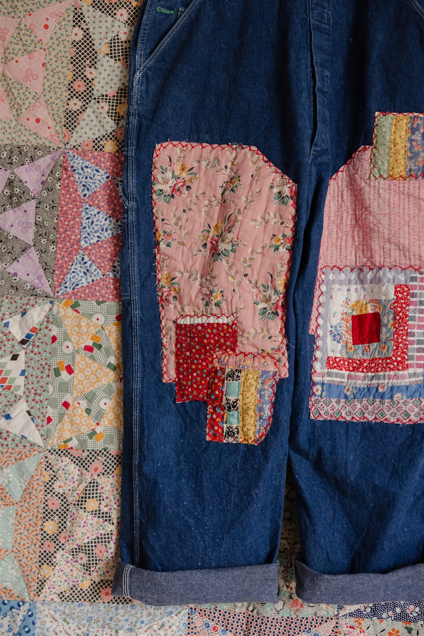 Forever the foundation of a well-rounded wardrobe, everyone needs a great pair of overalls! Patched with the remnants of our beloved quilt and textile treasury and hand-stitched with pink embroidery floss, we have added our own special touch to the world’s greatest workwear. Weathered in all the right ways and ready to be lived in, wear rolled up and oversized with stacked heel boots and your favourite vintage belt, cozy heirloom knits and a paper thin peasant blouse. The occasions and styling portfolio truly remain endless.