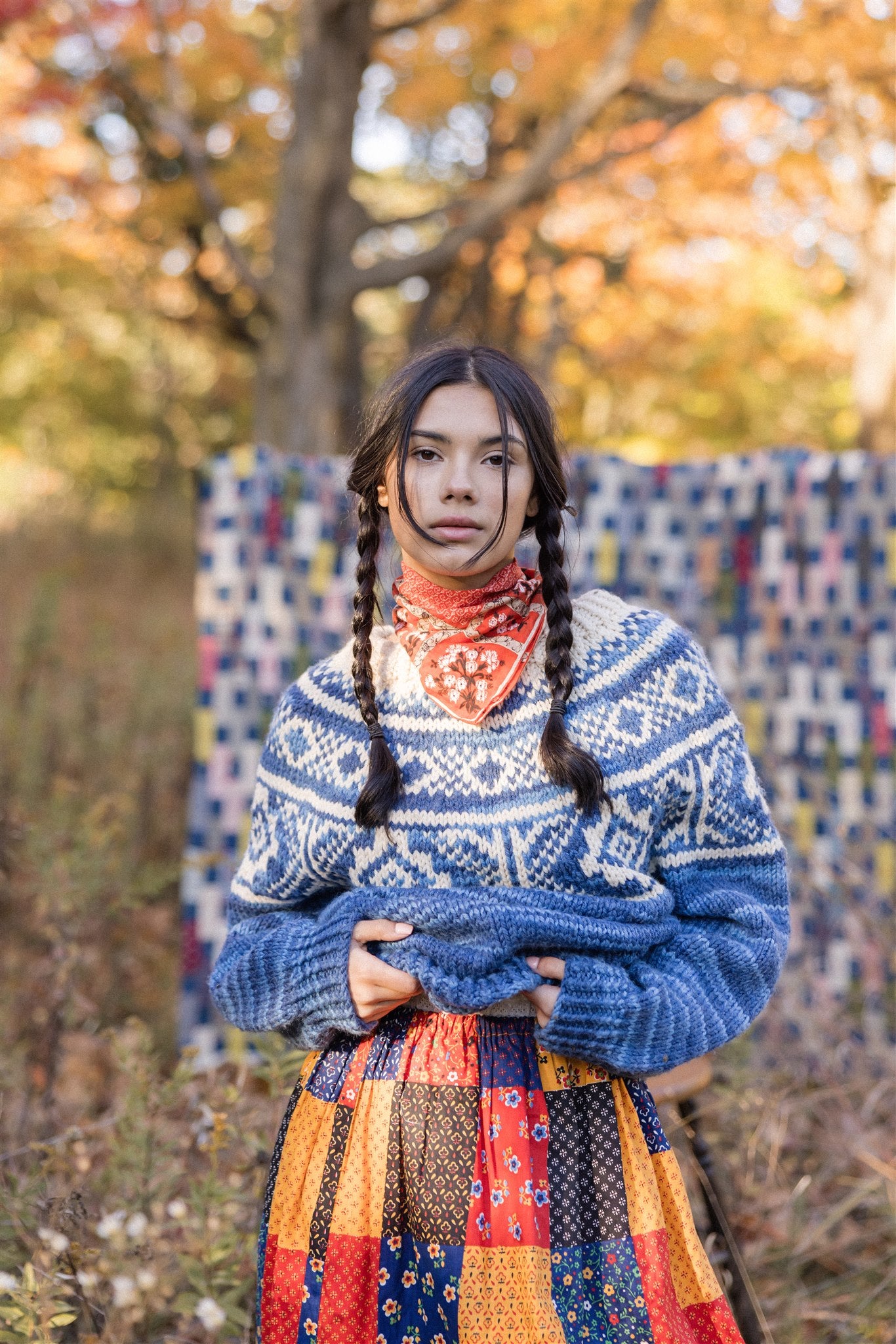 Cheerful printed patchwork in cherry red, marigold, indigo and royal blue.