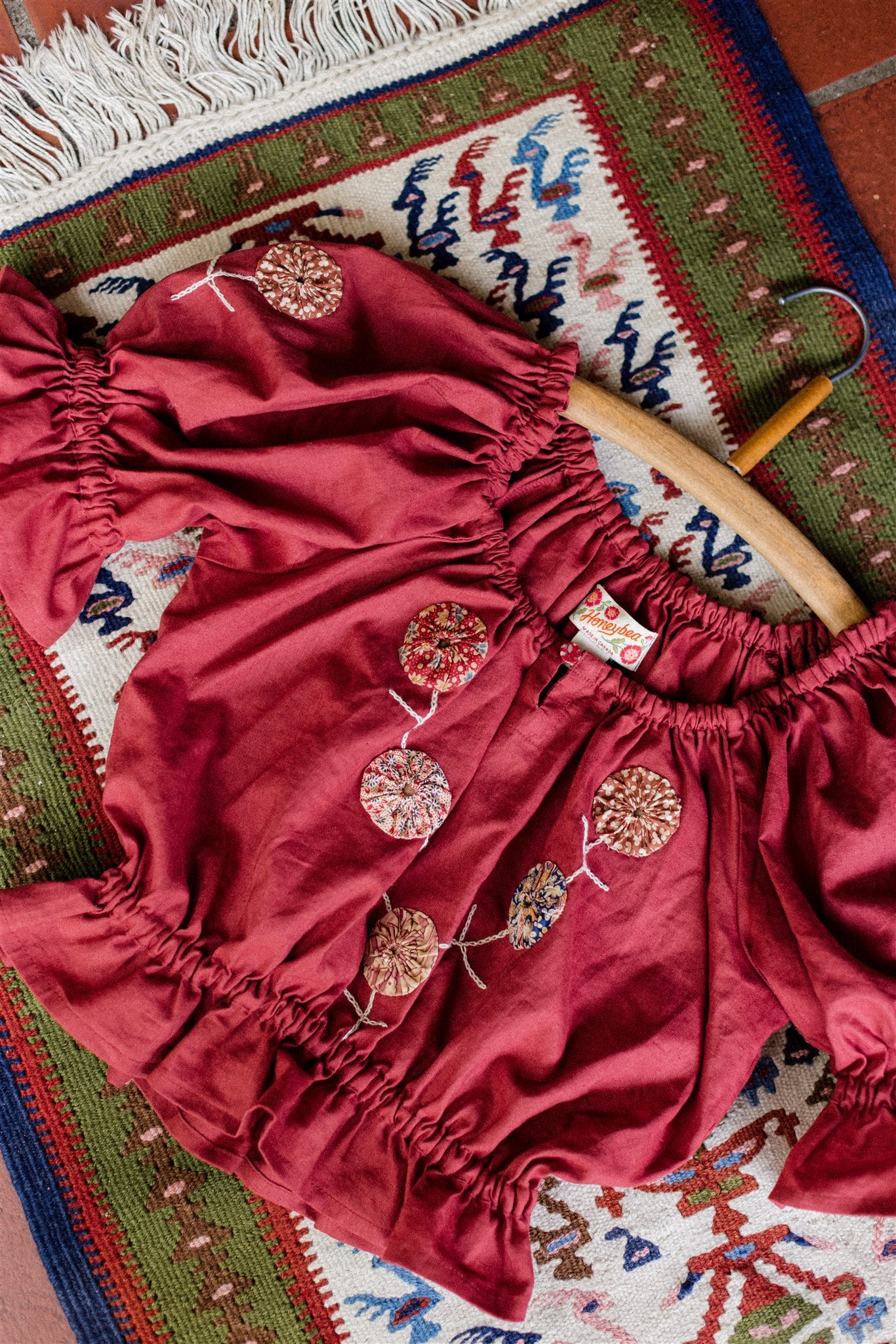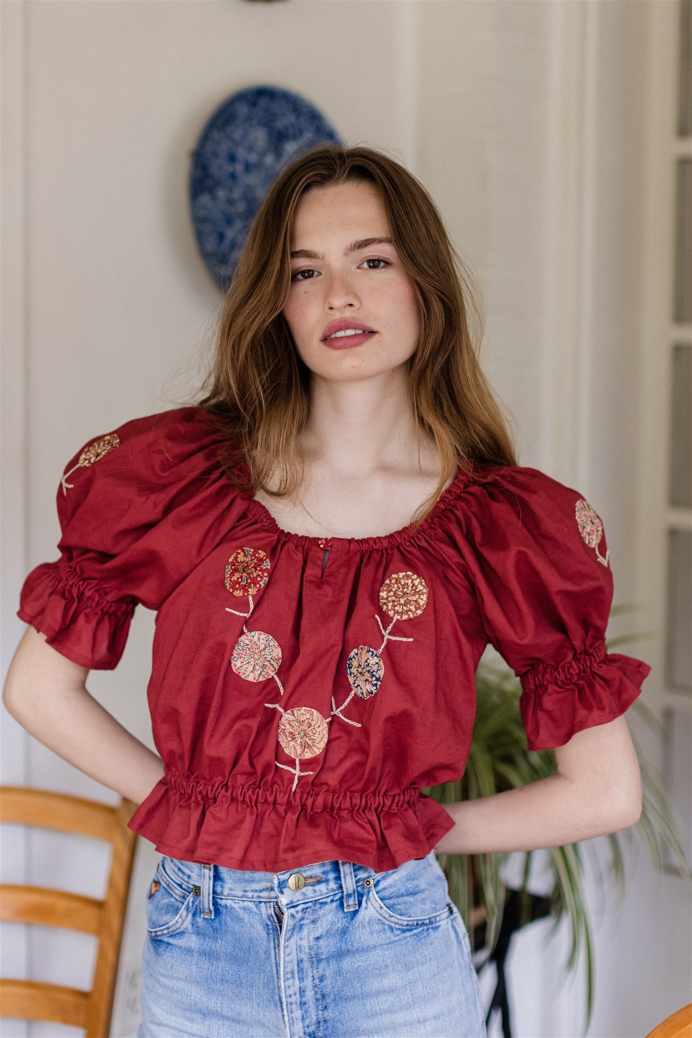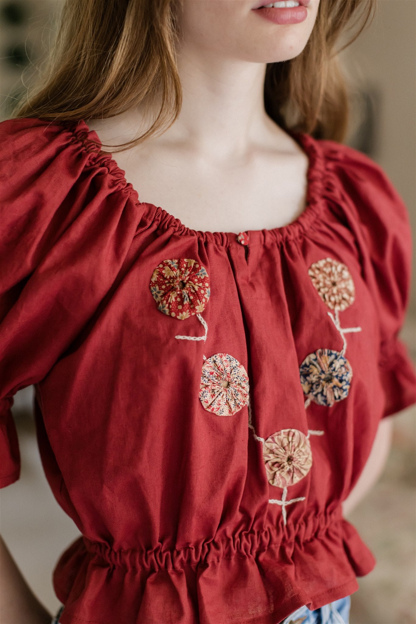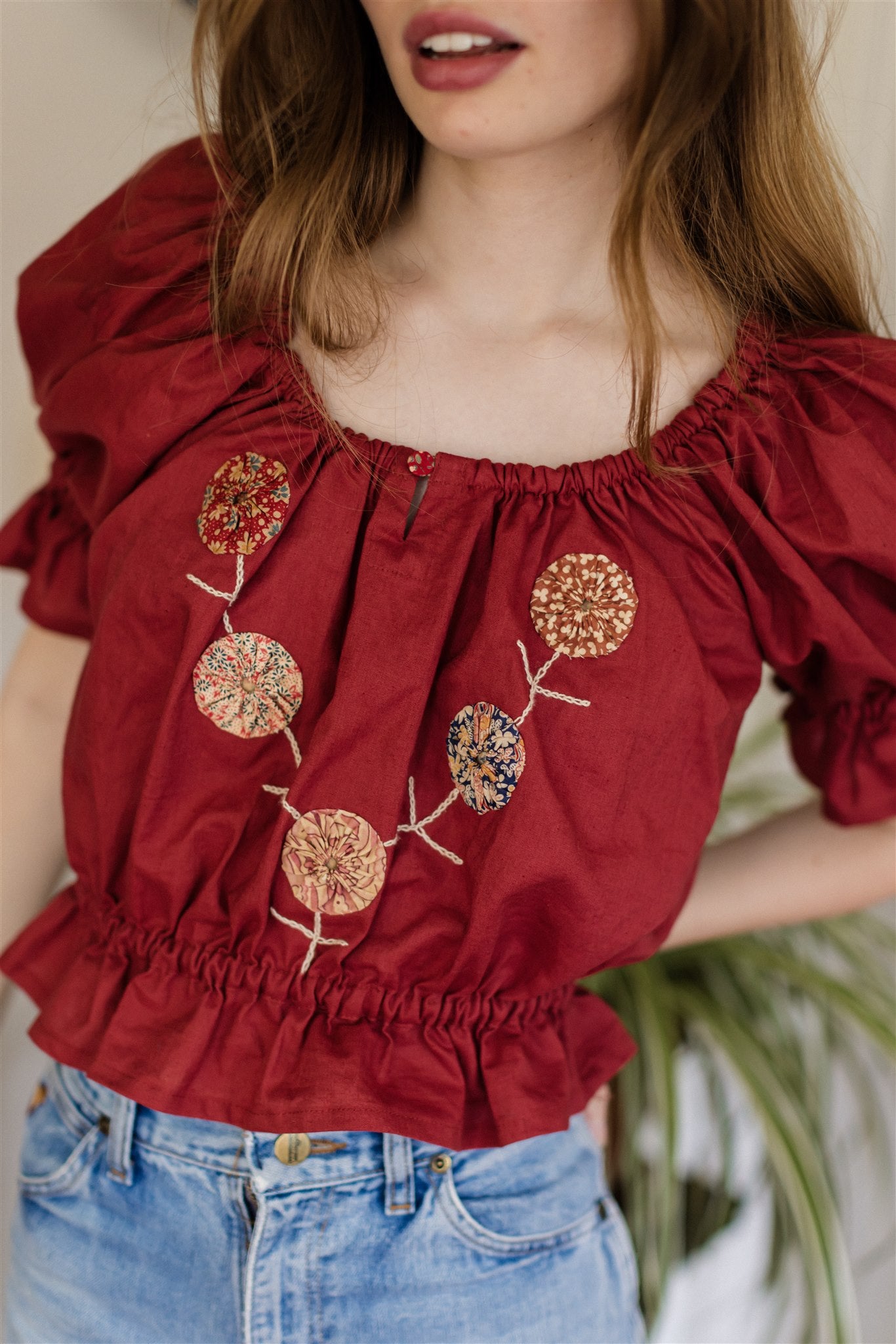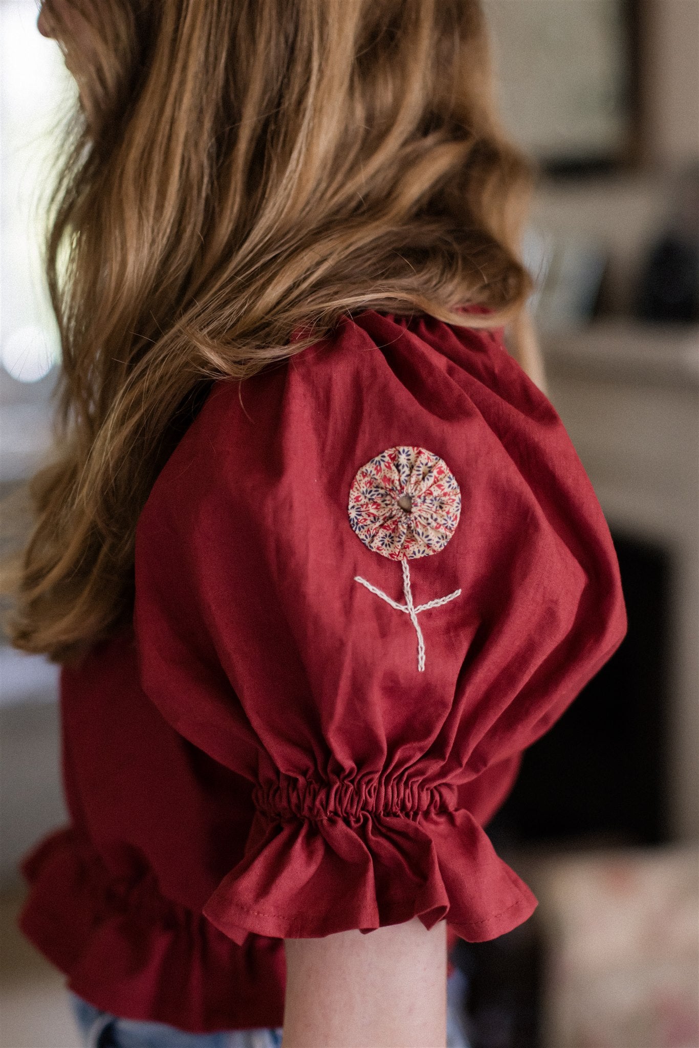 Our iconic Albany Blouse arrives in a limited edition of yo-yo appliqué in a distinguished farmhouse red from our favourite local fabric store. This robust, European cotton linen blend has the most spectacular structure and gets better with every wash, wrinkle and wear.