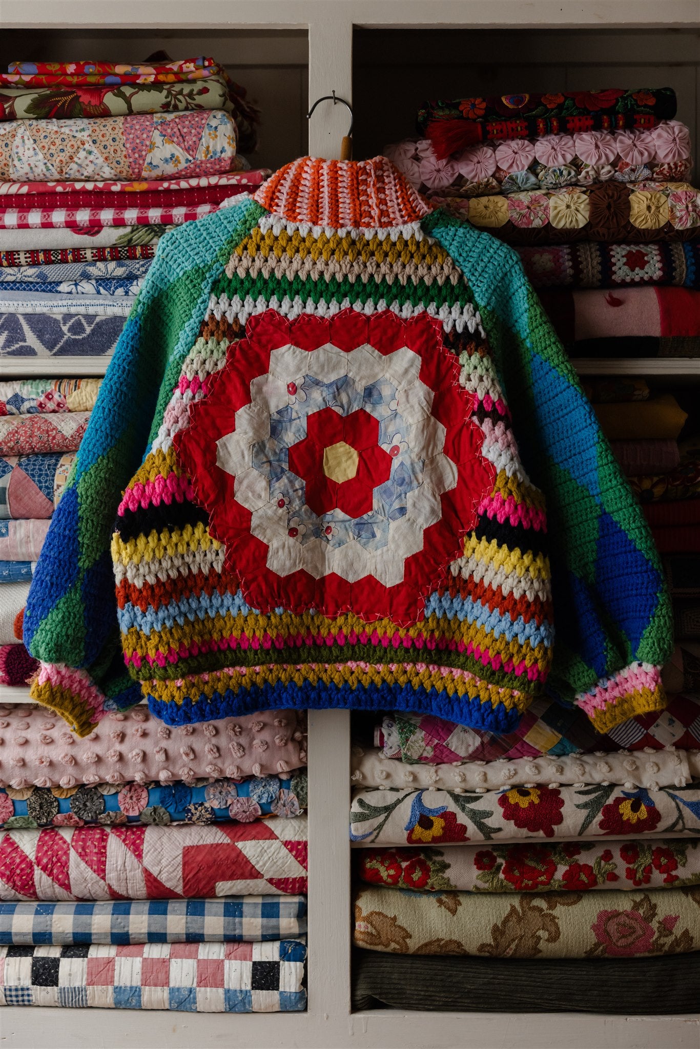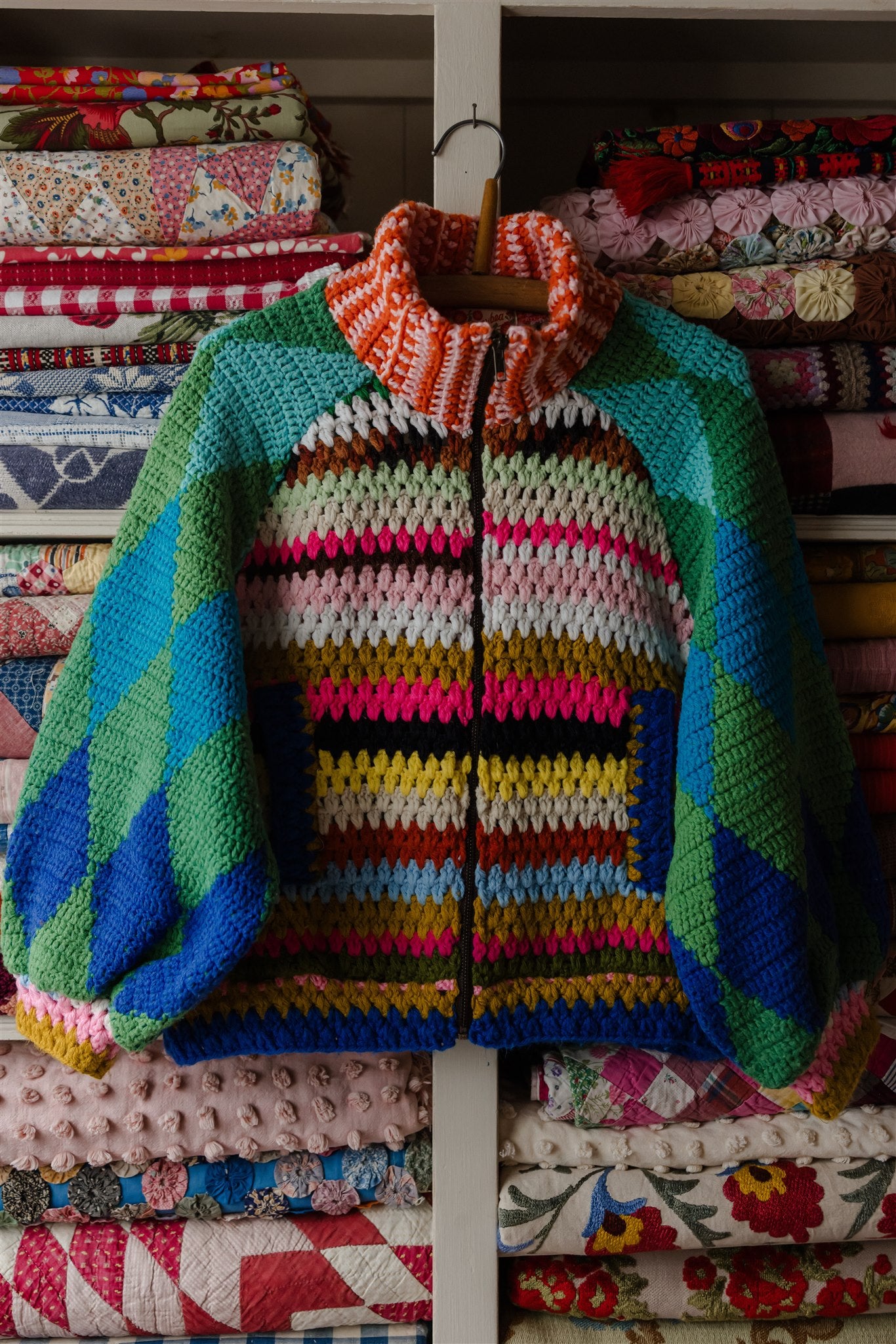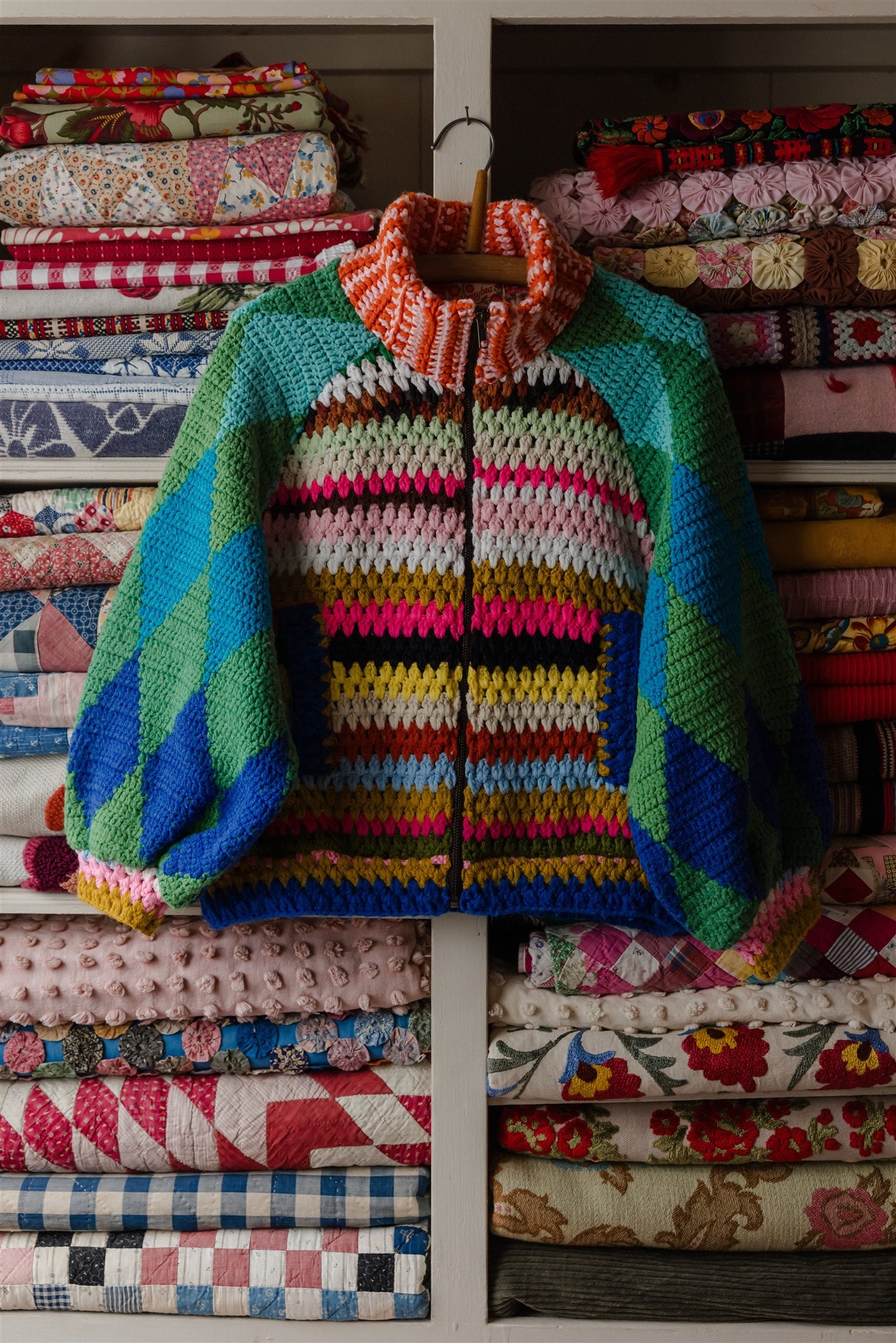 Blowing in the wind as if on a path of their own, this very special batch of Appalachian Knit Jackets was guided by the eleven calico quilt blocks that floated into our hands one fateful day. Beaming with a humble warmth that wants to reach out and welcome you in, each delicately hand-cut and hand-stitched hexagon led the design process through colour, composition and vibe, and we couldn’t have enjoyed our time together more. Ready for spring with its hearty brass hardware, our iconic high-collar zip up and its endless styling portfolio has evolved into a beloved lifestyle staple and salvaged textile art piece among our community around the world. Complete with snug welt pockets and the lush textures, timeworn tones and profound love and warmth that only the real deal can possess, each sacred and slowcrafted piece speaks from its own, goodhearted soul.