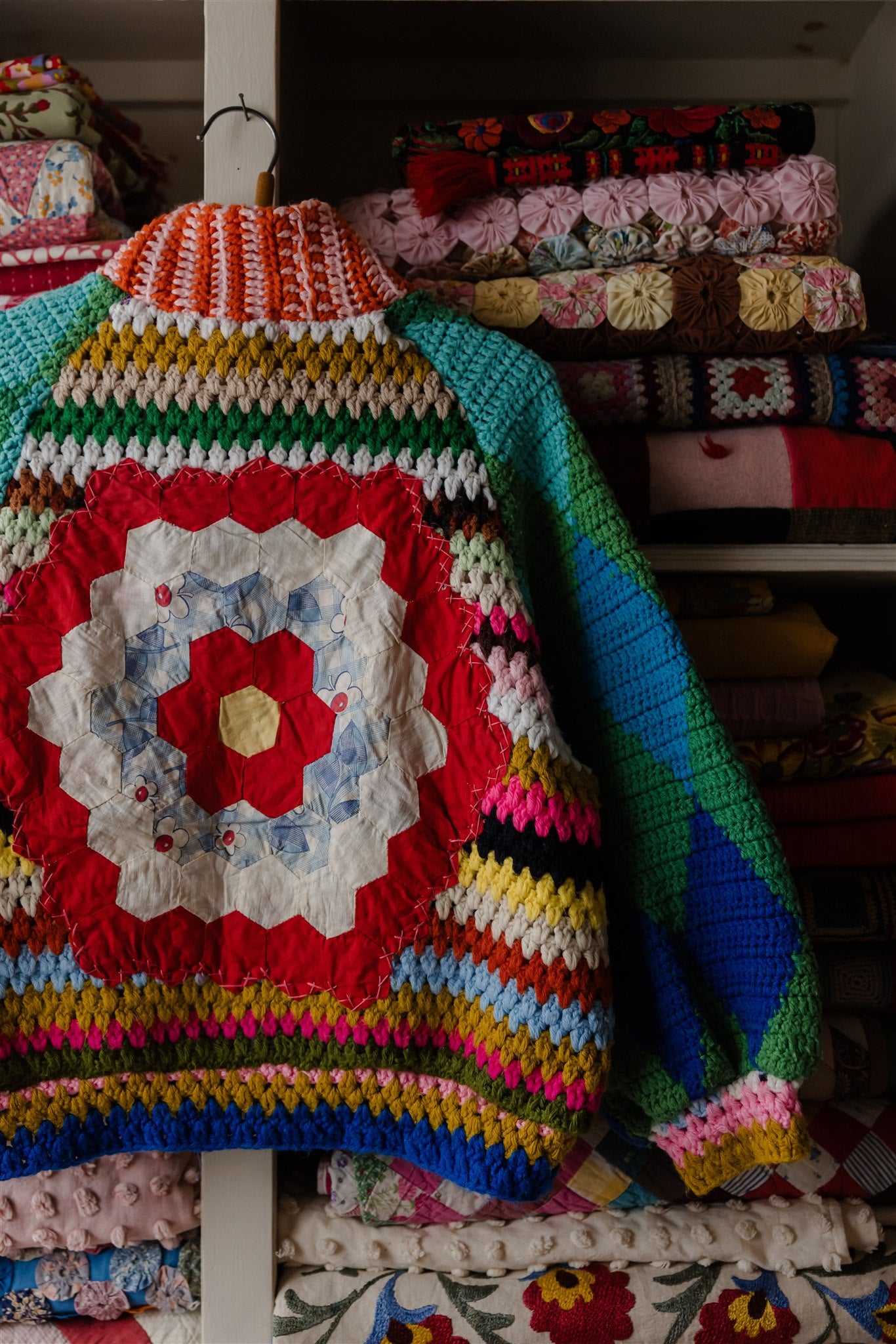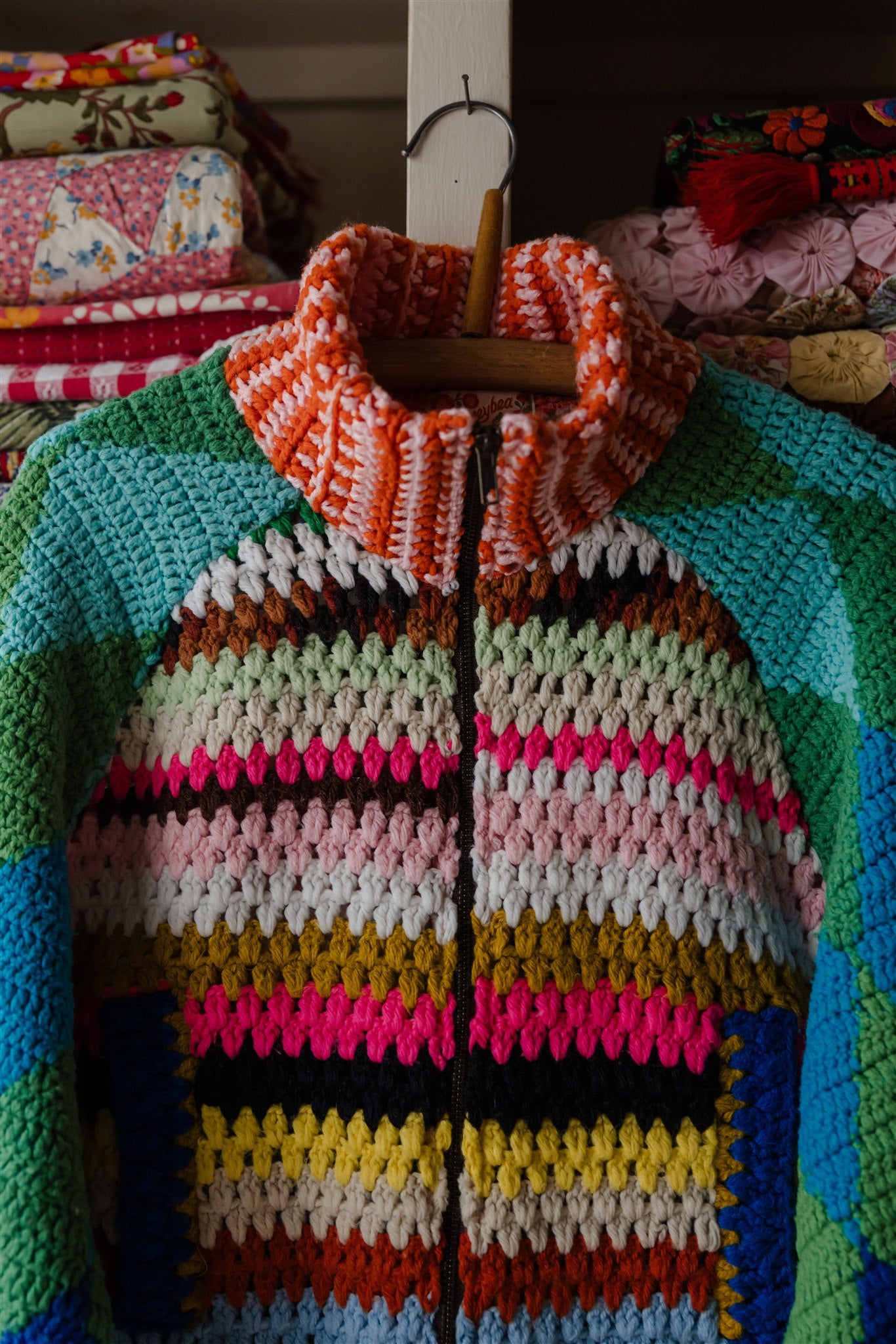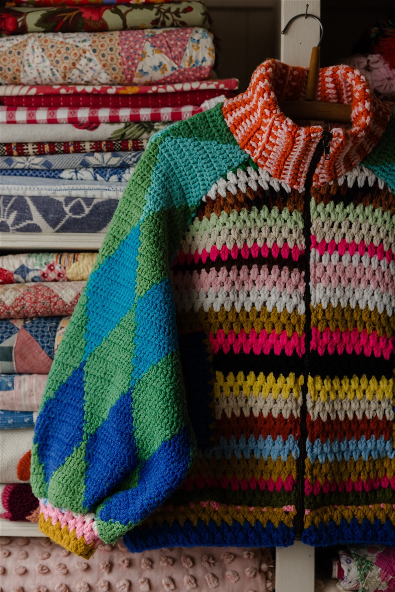 Blowing in the wind as if on a path of their own, this very special batch of Appalachian Knit Jackets was guided by the eleven calico quilt blocks that floated into our hands one fateful day. Beaming with a humble warmth that wants to reach out and welcome you in, each delicately hand-cut and hand-stitched hexagon led the design process through colour, composition and vibe, and we couldn’t have enjoyed our time together more. Ready for spring with its hearty brass hardware, our iconic high-collar zip up and its endless styling portfolio has evolved into a beloved lifestyle staple and salvaged textile art piece among our community around the world. Complete with snug welt pockets and the lush textures, timeworn tones and profound love and warmth that only the real deal can possess, each sacred and slowcrafted piece speaks from its own, goodhearted soul.