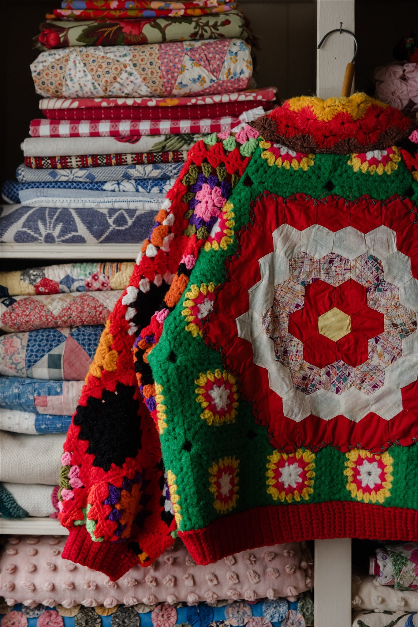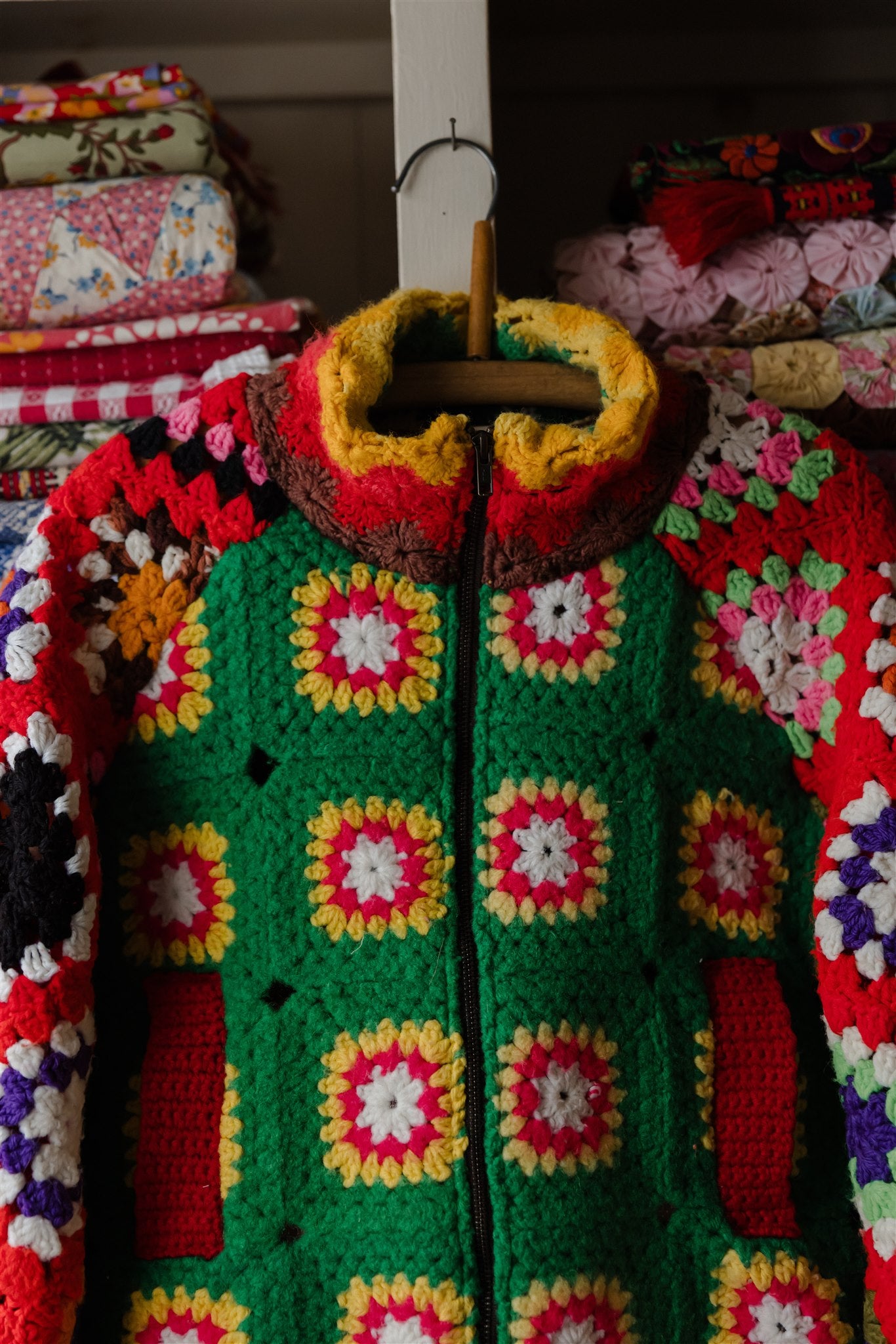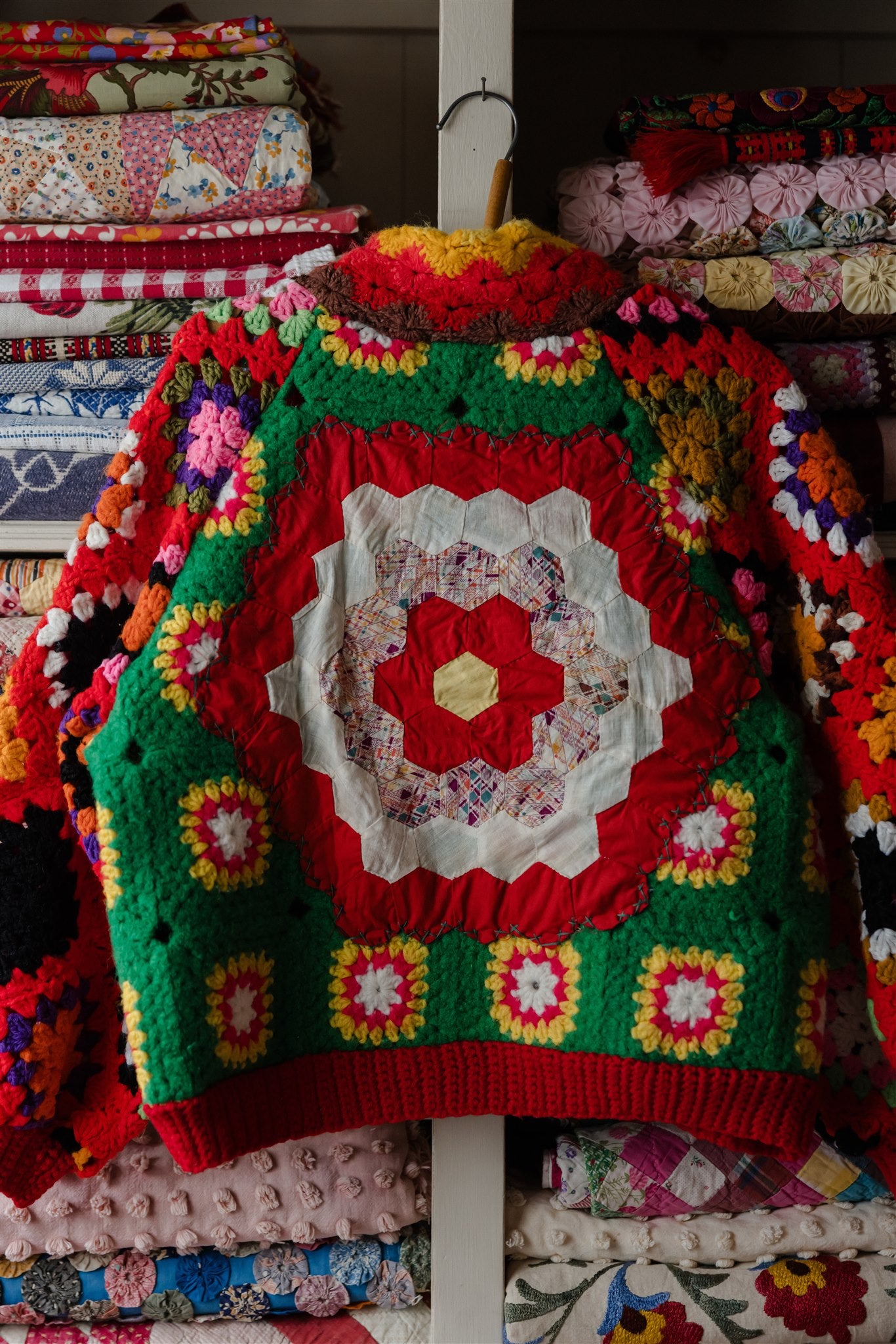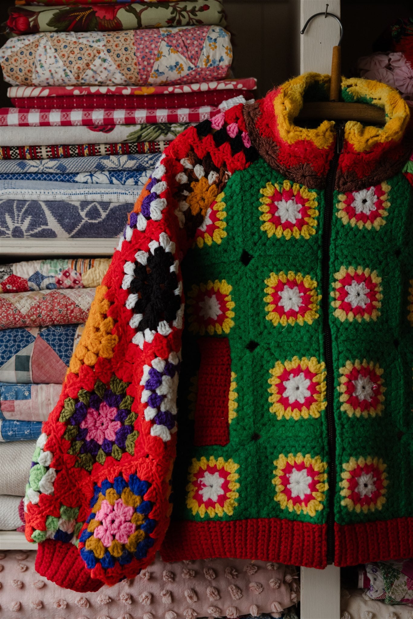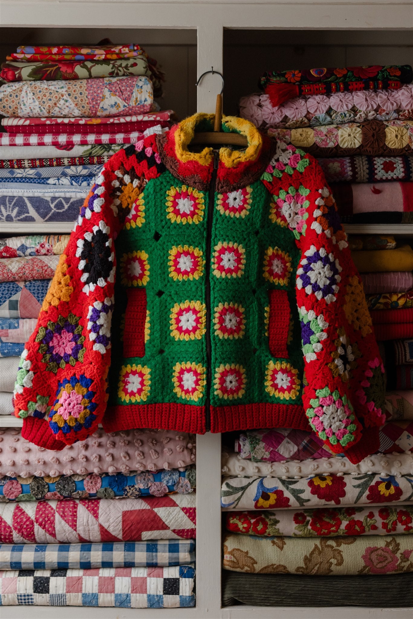Blowing in the wind as if on a path of their own, this very special batch of Appalachian Knit Jackets was guided by the eleven calico quilt blocks that floated into our hands one fateful day. Beaming with a humble warmth that wants to reach out and welcome you in, each delicately hand-cut and hand-stitched hexagon led the design process through colour, composition and vibe, and we couldn’t have enjoyed our time together more. Ready for spring with its hearty brass hardware, our iconic high-collar zip up and its endless styling portfolio has evolved into a beloved lifestyle staple and salvaged textile art piece among our community around the world. Complete with snug welt pockets and the lush textures, timeworn tones and profound love and warmth that only the real deal can possess, each sacred and slowcrafted piece speaks from its own, goodhearted soul.