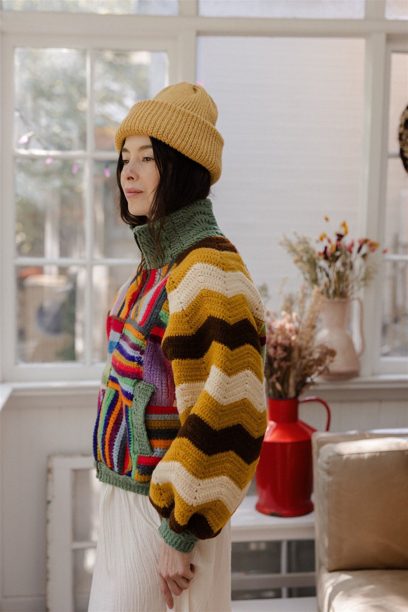 100% repurposed knit and crocheted blankets in wool and acrylic blends.
