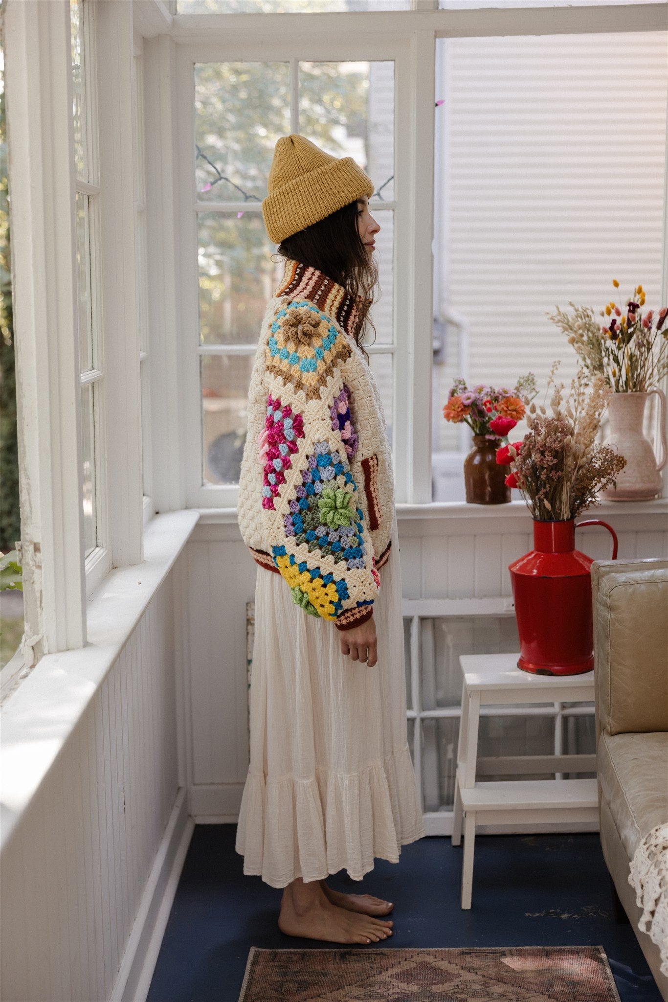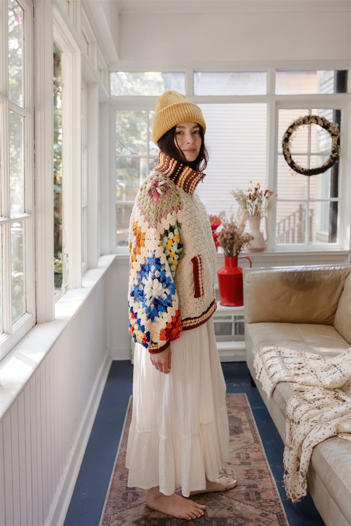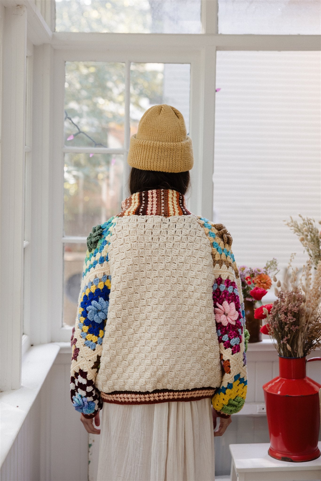 100% repurposed knit and crocheted blankets in wool and acrylic blends.