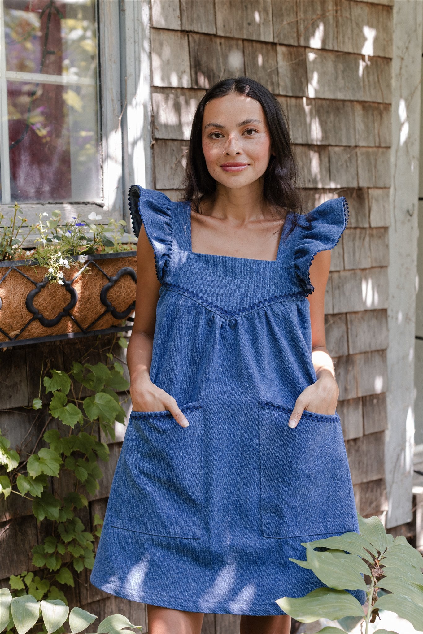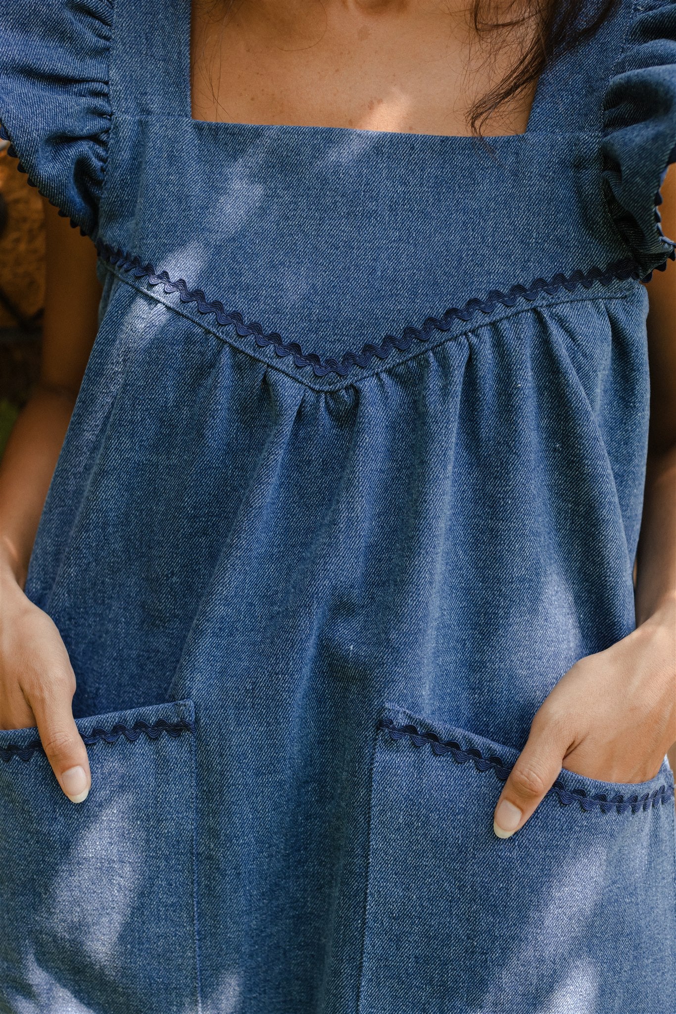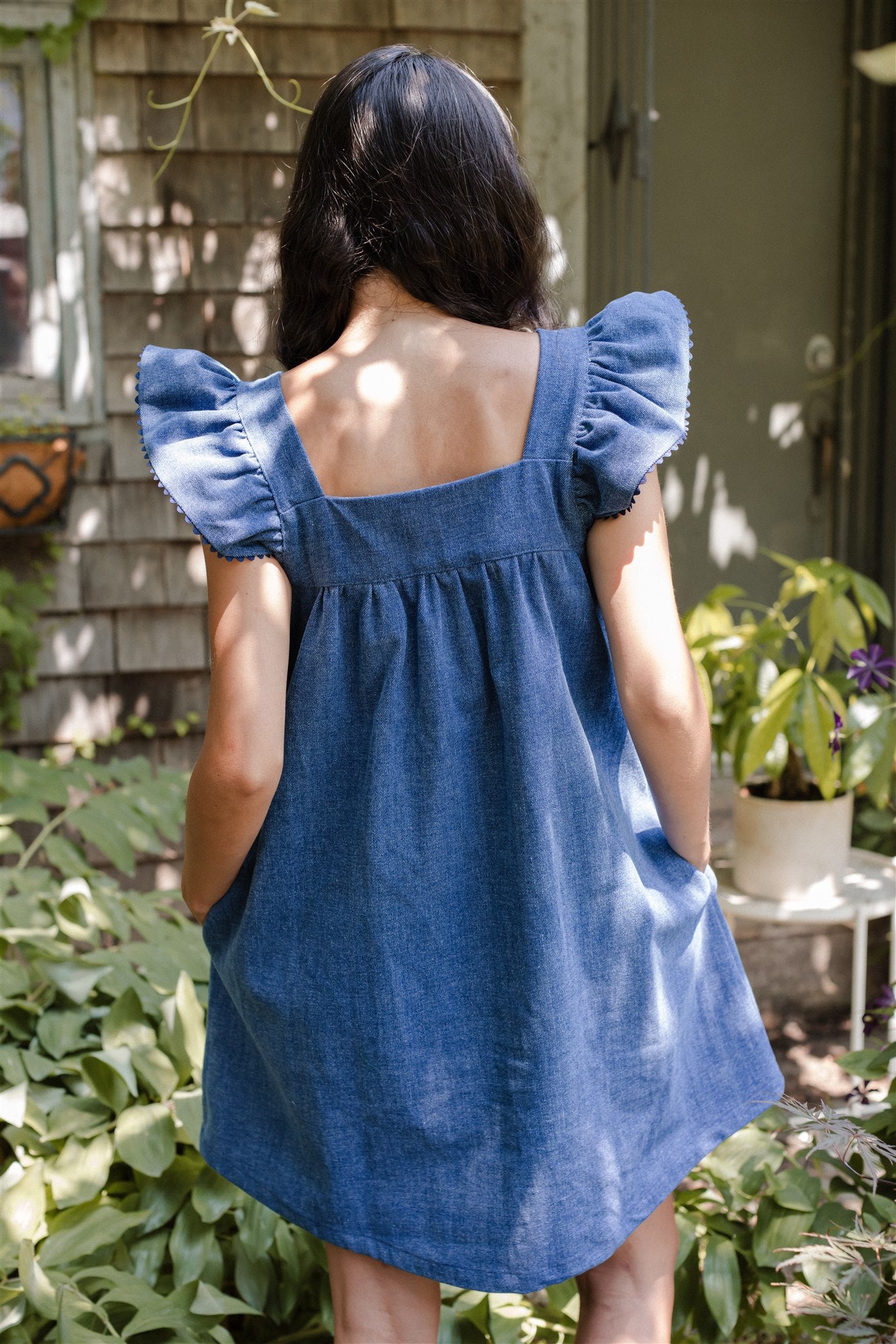 The wardrobe workhorse we have been needing, our blue jean Chore Dress is reminiscent of an iconic denim apron that hung at the ready on the back of the pantry door. Impeccably understated with a subtle hit of cobalt blue rickrack, a pretty ruffled sleeve and that real, gritty weight to coin her an immediate classic. Pair tall boots with her deep utility pockets and get out there.