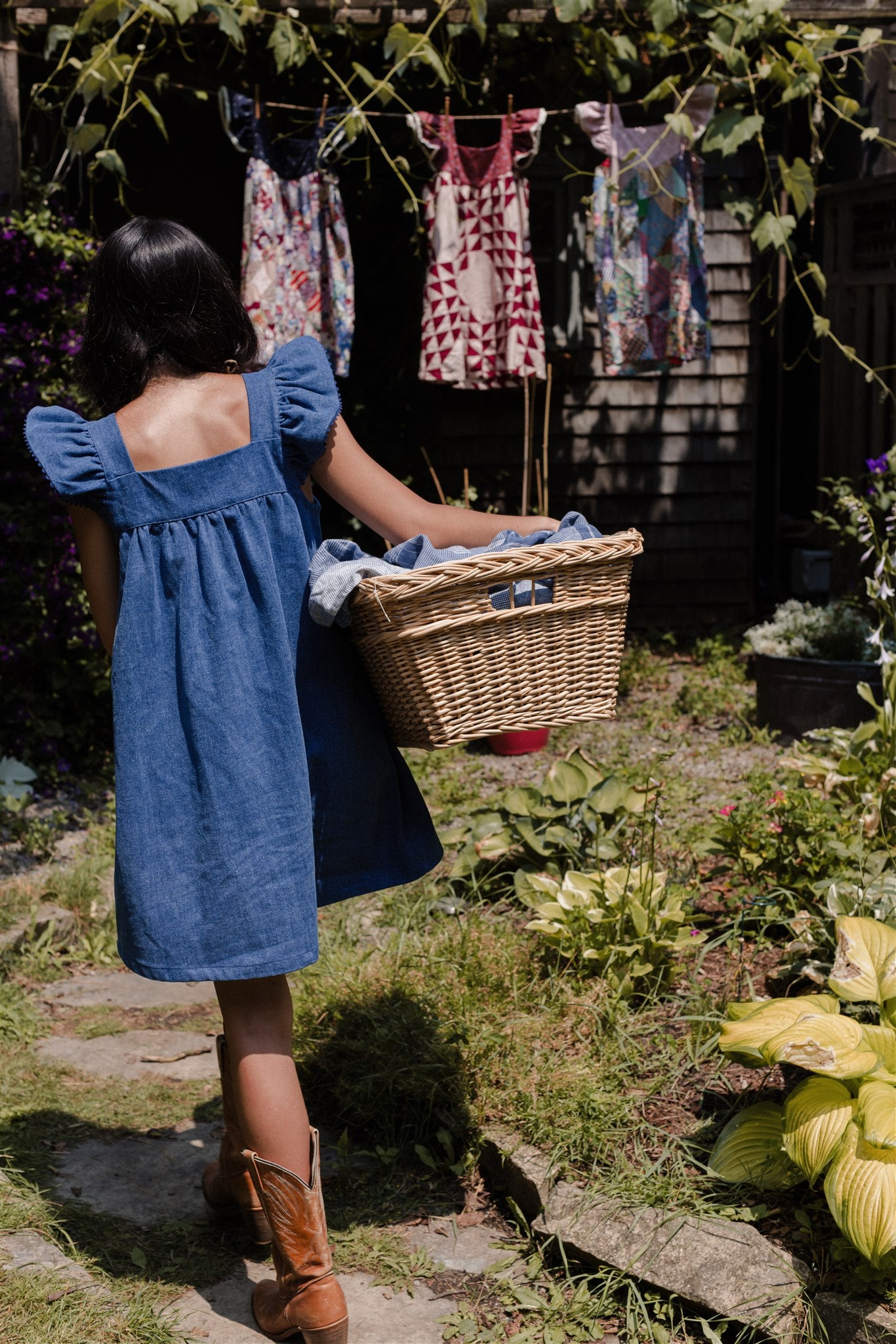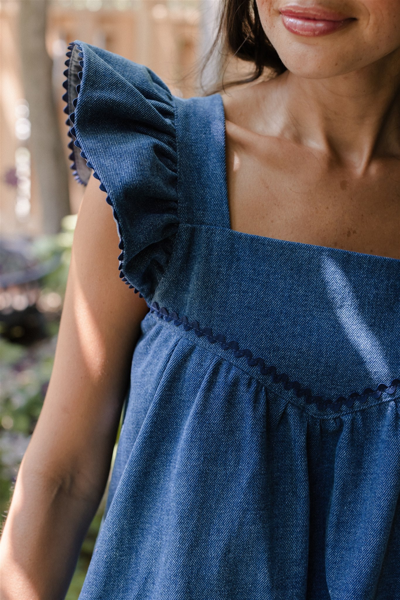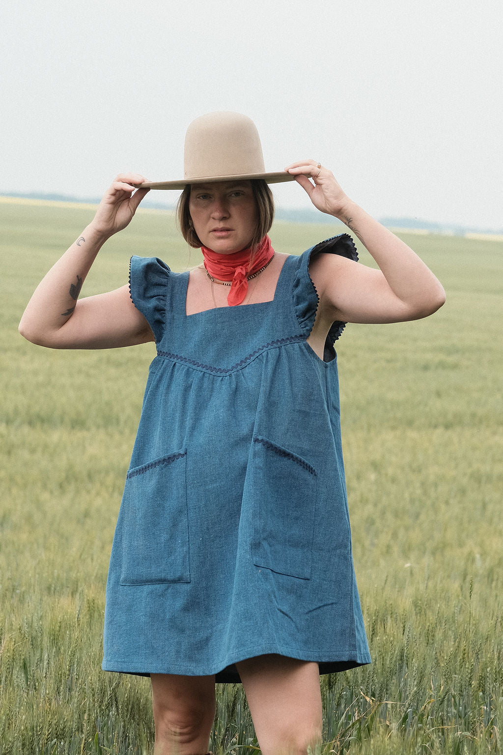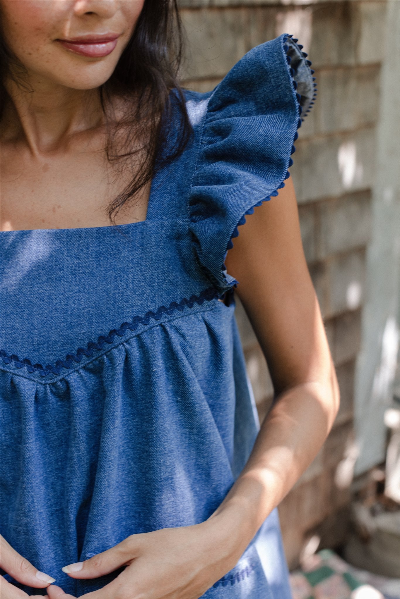 The wardrobe workhorse we have been needing, our blue jean Chore Dress is reminiscent of an iconic denim apron that hung at the ready on the back of the pantry door. Impeccably understated with a subtle hit of cobalt blue rickrack, a pretty ruffled sleeve and that real, gritty weight to coin her an immediate classic. Pair tall boots with her deep utility pockets and get out there.