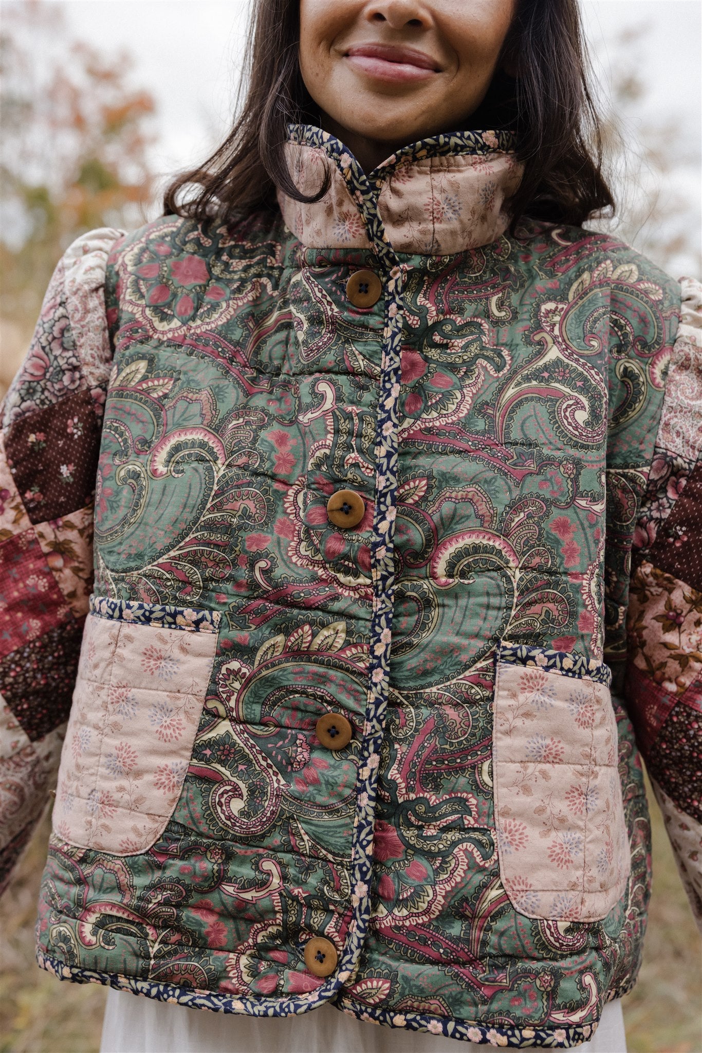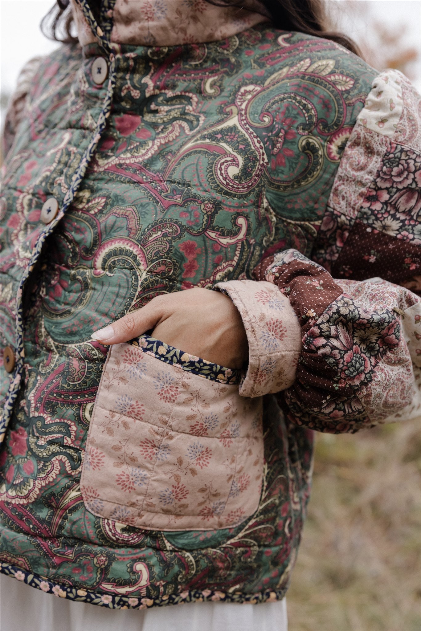 With a beautiful bell shape and sunny disposition, our darling Clementine returns to greet the season in a medley of earth tone florals and timeworn patchwork. Beloved for her cheerful heirloom details and well-structured silhouette, Clementine is known for her endearing row of oversized buttons and puffy quilted sleeves roomy enough to layer over cozy cotton dresses, baggy denim overalls and chunky knit pullovers when layer season is at is best.
