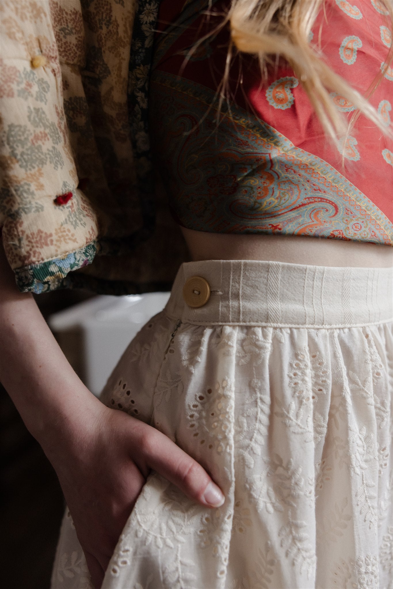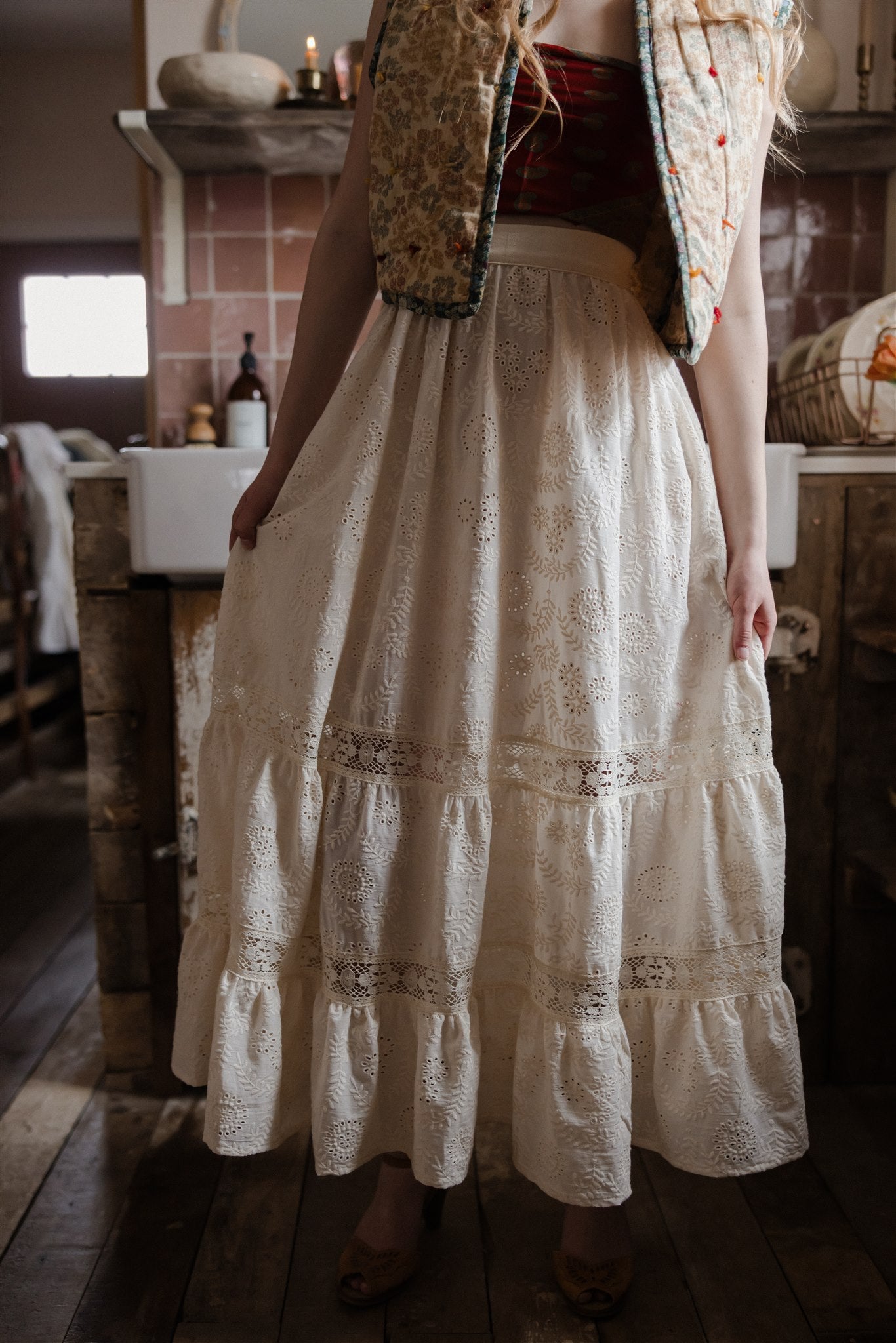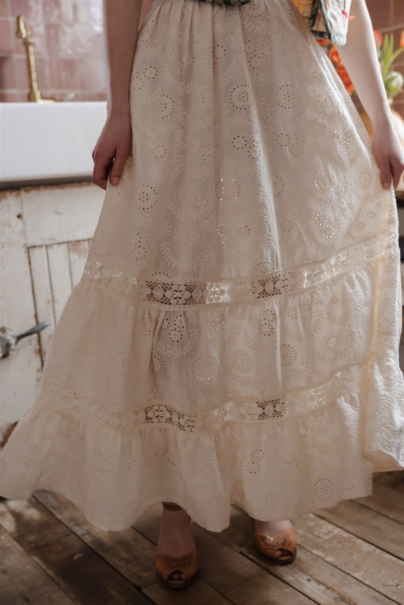 Old world elegance meets prairie fields in our ethereal Florence Plough. All about the details in a cascade of light-as-air eyelet framed in authentic antique lace, this exquisitely beautiful, wear-everywhere skirt is designed with a flattering high waist and sleek side seam pockets to style up or down. A true wardrobe treasure to be paired with everything from paper thin peasant blouses to knee-high campus boots and an oversized barn coat, reach for Florence for days spent antiquing, indulging in long café mornings or with a sling-back red heel for al fresco dinners with friends.