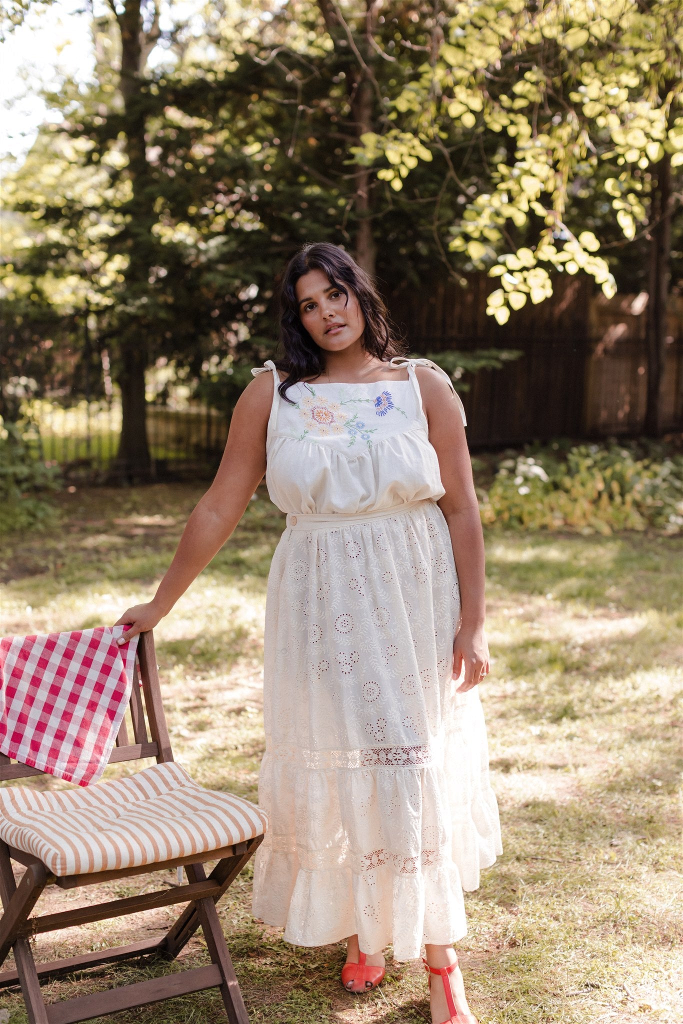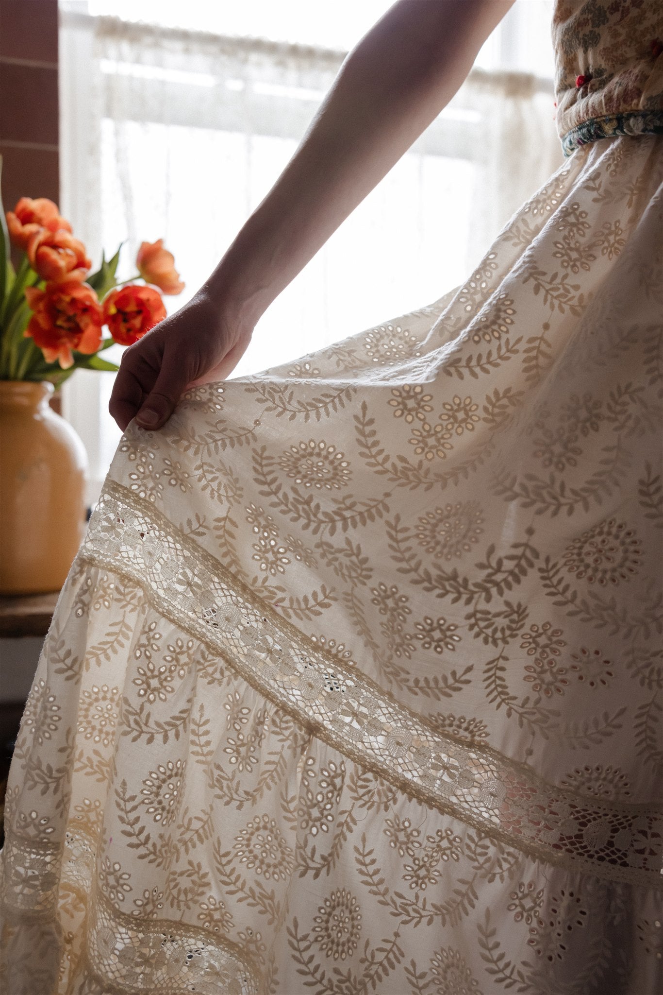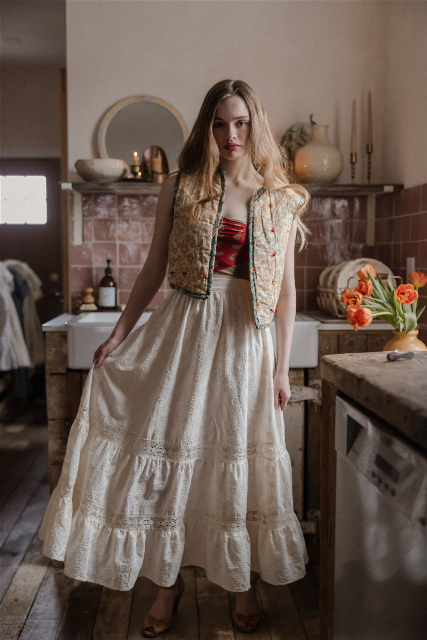 Old world elegance meets prairie fields in our ethereal Florence Plough. All about the details in a cascade of light-as-air eyelet framed in authentic antique lace, this exquisitely beautiful, wear-everywhere skirt is designed with a flattering high waist and sleek side seam pockets to style up or down. A true wardrobe treasure to be paired with everything from paper thin peasant blouses to knee-high campus boots and an oversized barn coat, reach for Florence for days spent antiquing, indulging in long café mornings or with a sling-back red heel for al fresco dinners with friends.