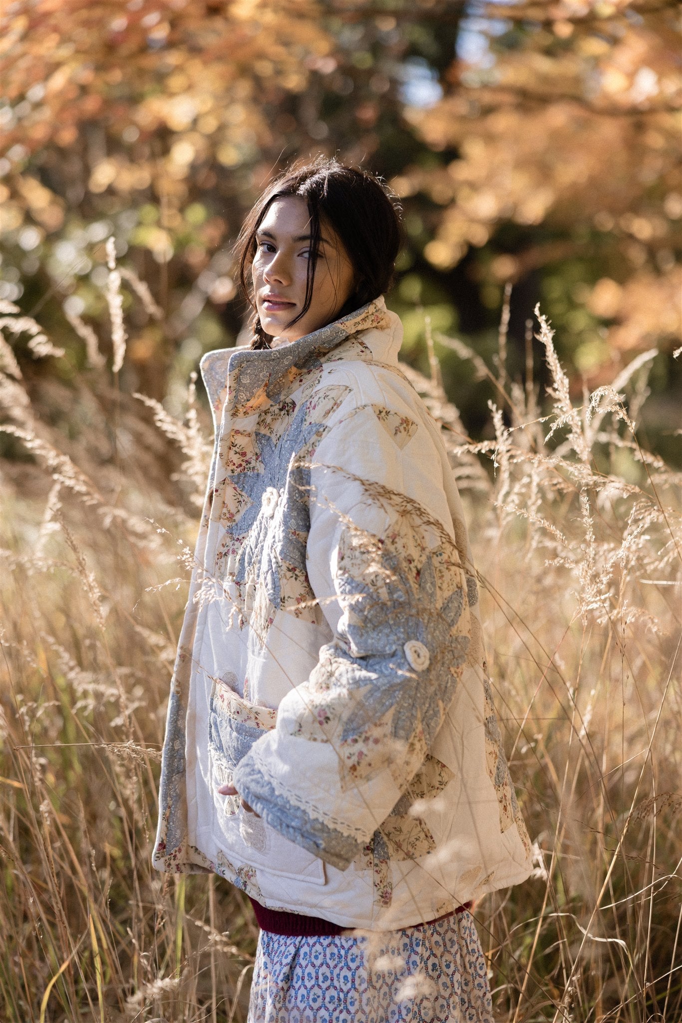 The ultimate grab-and-go layer piece, our Field Jacket is equipped with big pockets, a cozy oversized collar and a loop to live by the door. Combined in a quilted mosaic of soft nostalgic prints and lofty weathered patchwork, this ultra effortless handcrafted coat is one simple and elevated step above wearing the blanket it is made of. Designed in small, curated batches and lined in a supple lavender cotton, enjoy its comfort and warmth for cool morning walks with the dog or kids, hands-free to the market with a list in the pocket or away for a long weekend with family and friends. Low fuss and high function that styles beautifully with a belt, our Field jacket is at the ready for every outing.