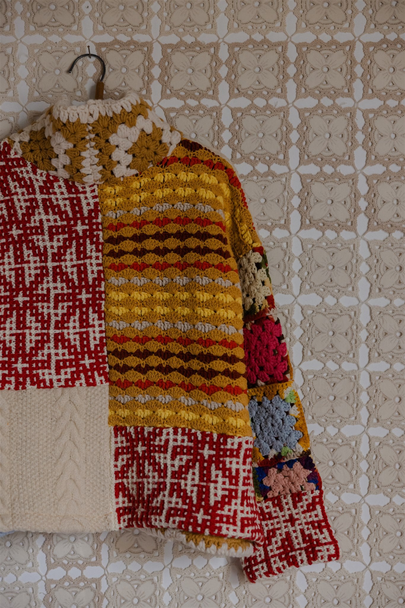 Made of premium, hand-picked vintage crochet blankets, each textile has been carefully selected for its premium yarn quality and hand-feel, however, our fibre content remains unknown. If you have an allergy to wool you may want to steer clear or plan to wear a layer underneath which there is certainly room for.