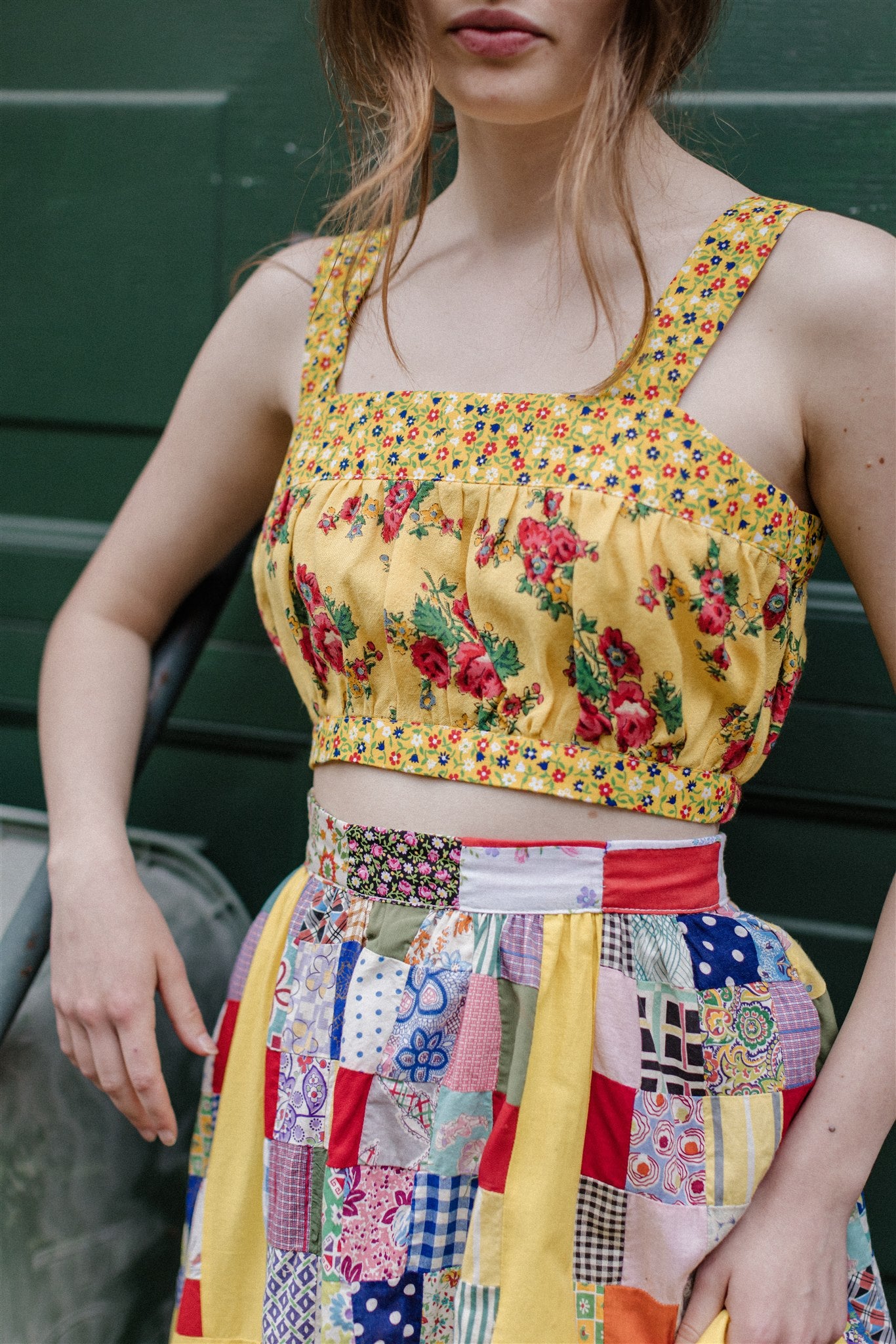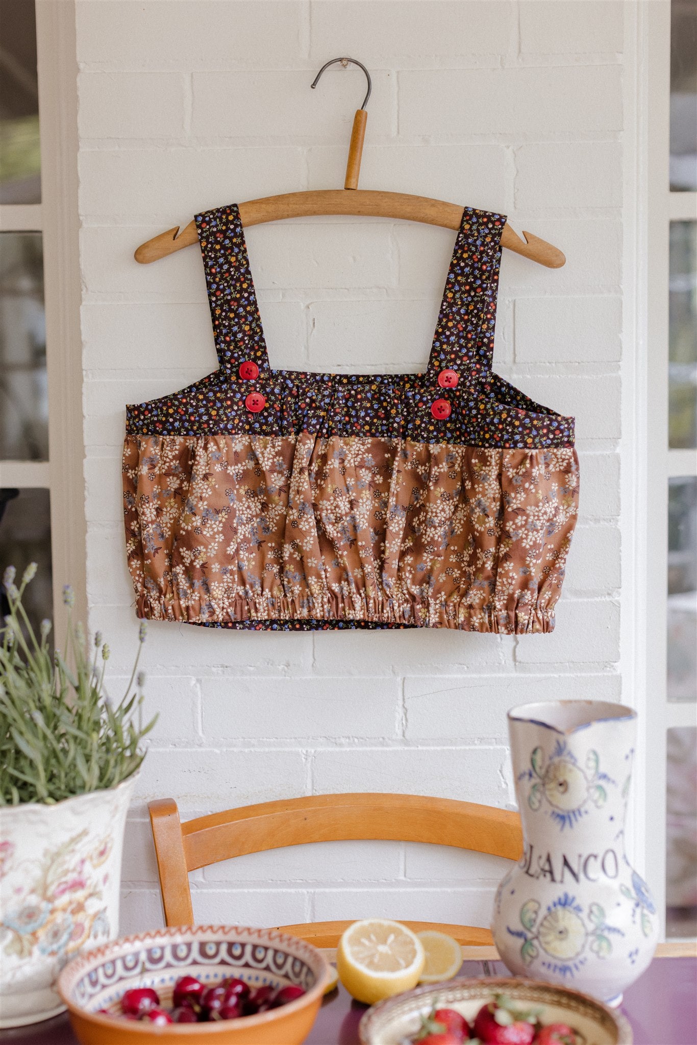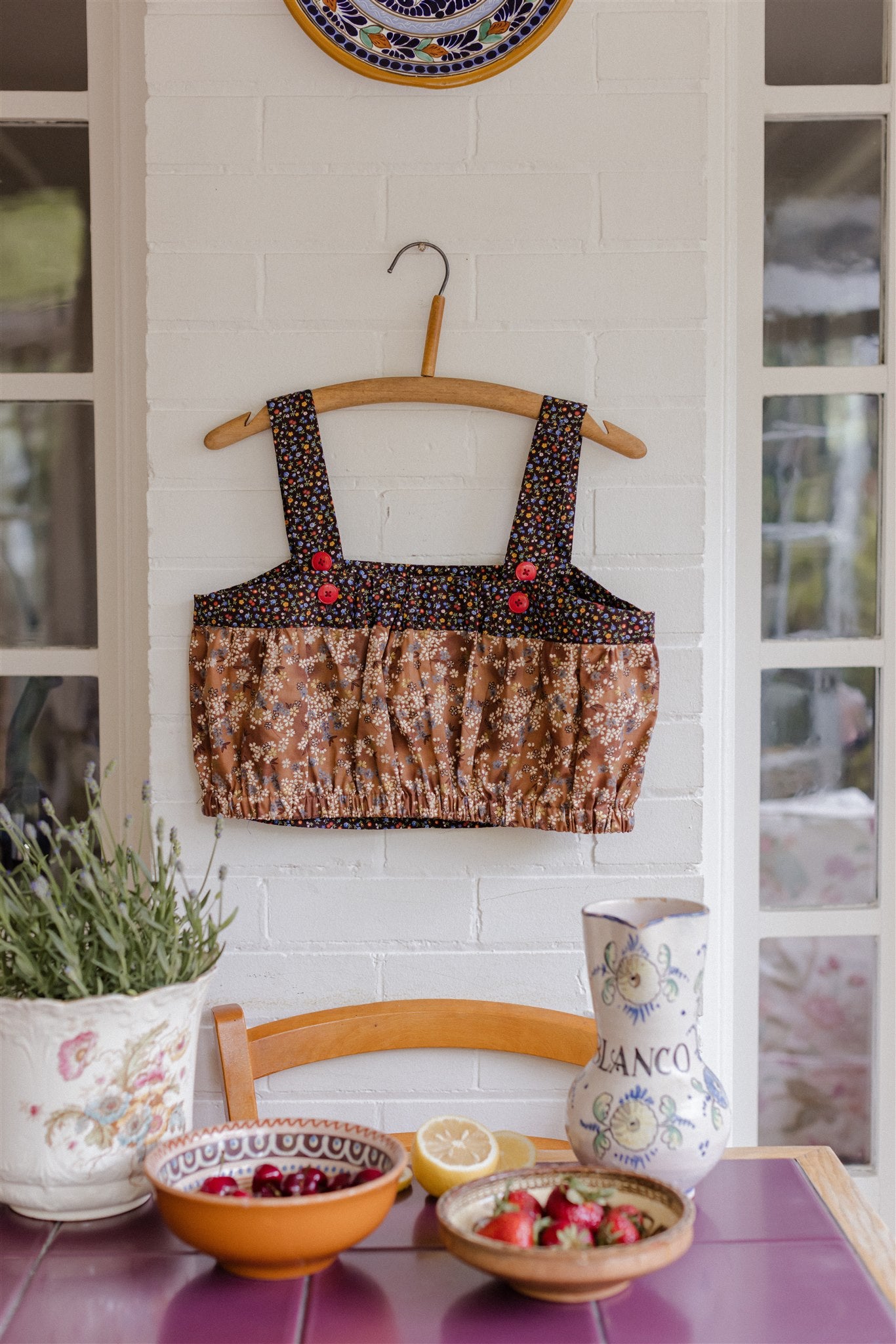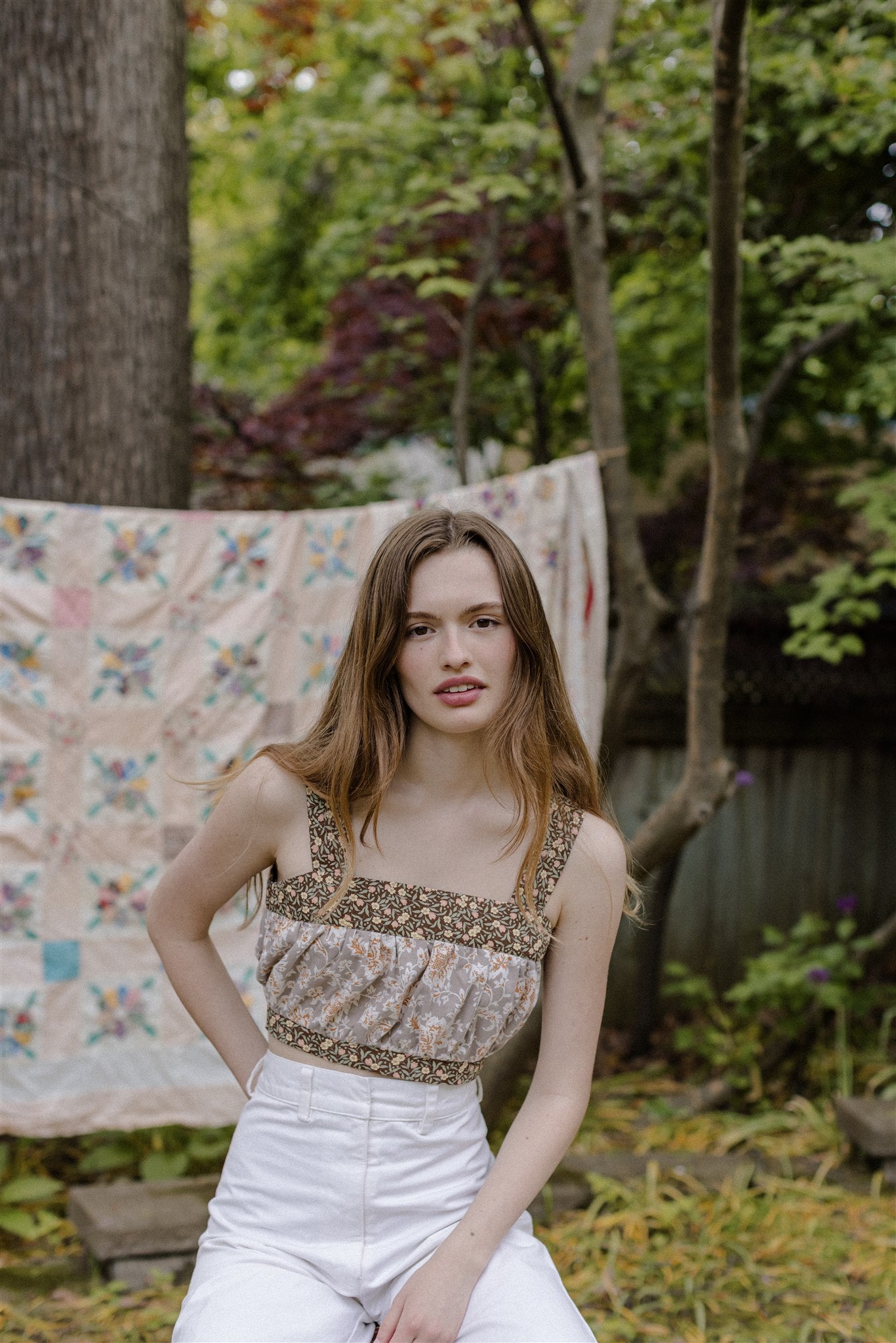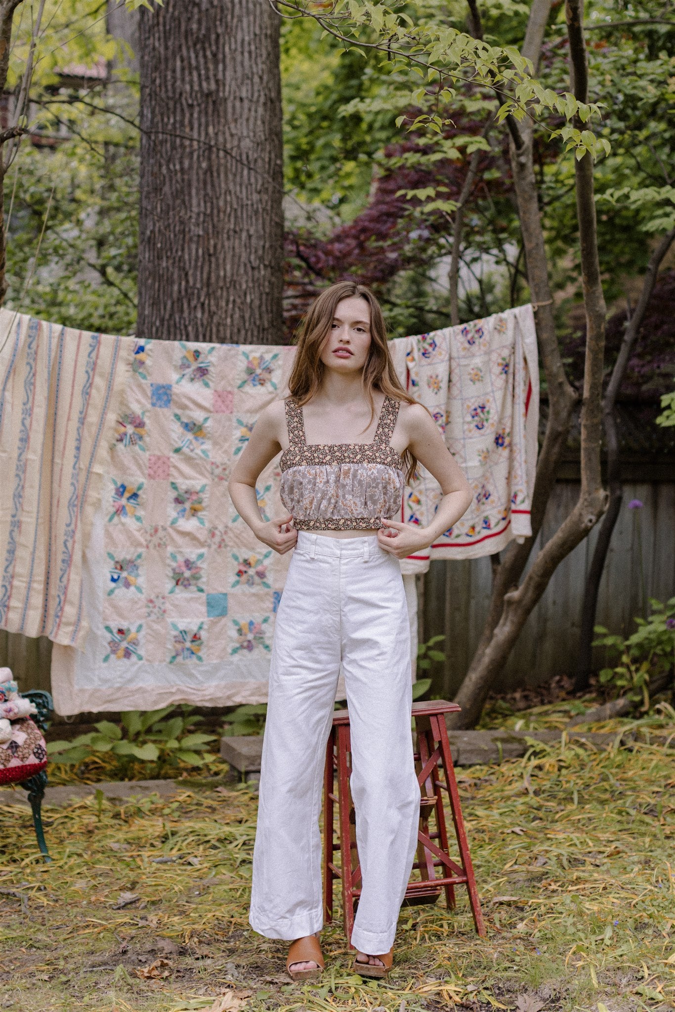Quite possibly my favourite Honeybea piece of all time, the Zinnia Top is an endlessly versatile go-to with long skirts, white sailor pants, vintage overalls and high-waisted denim. Inspired by 1940s farmwear with wide straps and a boxy cut, it sits just above the bottom of the ribcage and is made for the perfect midriff moment. Cut and sewn in a once in a lifetime stash of gritty vintage gold and designed with an elasticated back for easy wearing and a flexible fit, we have introduced an adjustable strap with two big buttons in the back to make this small but mighty beauty even better than ever.