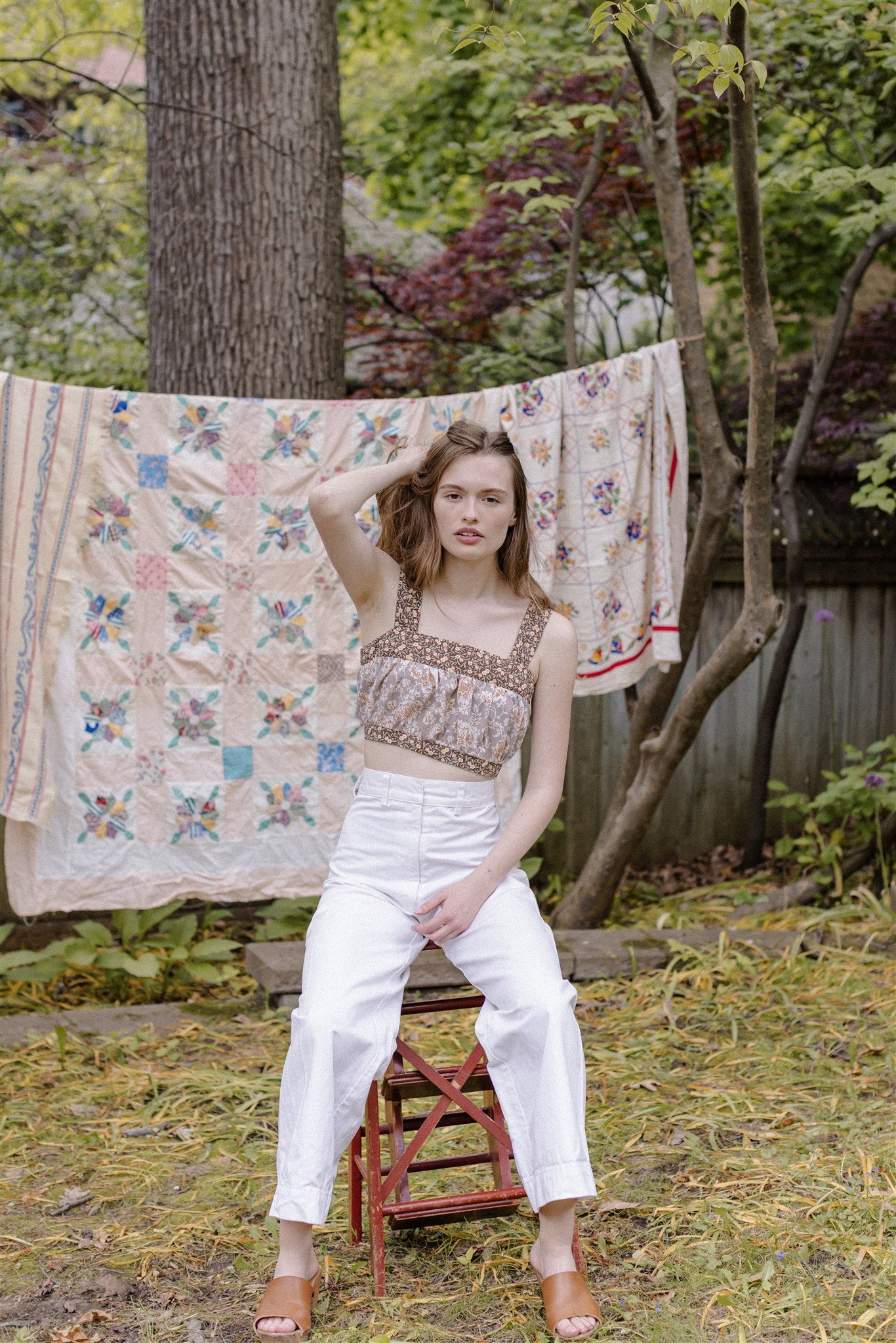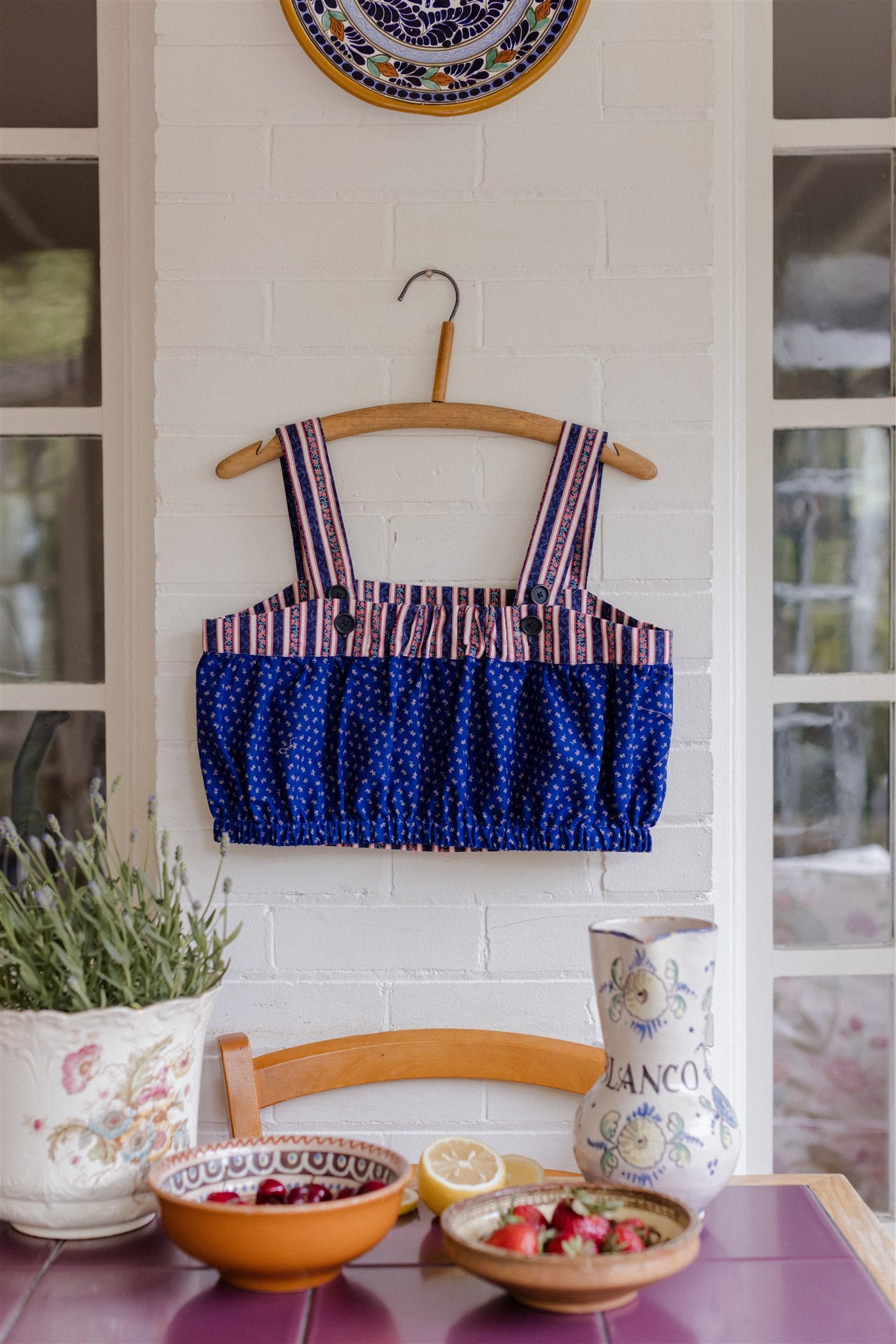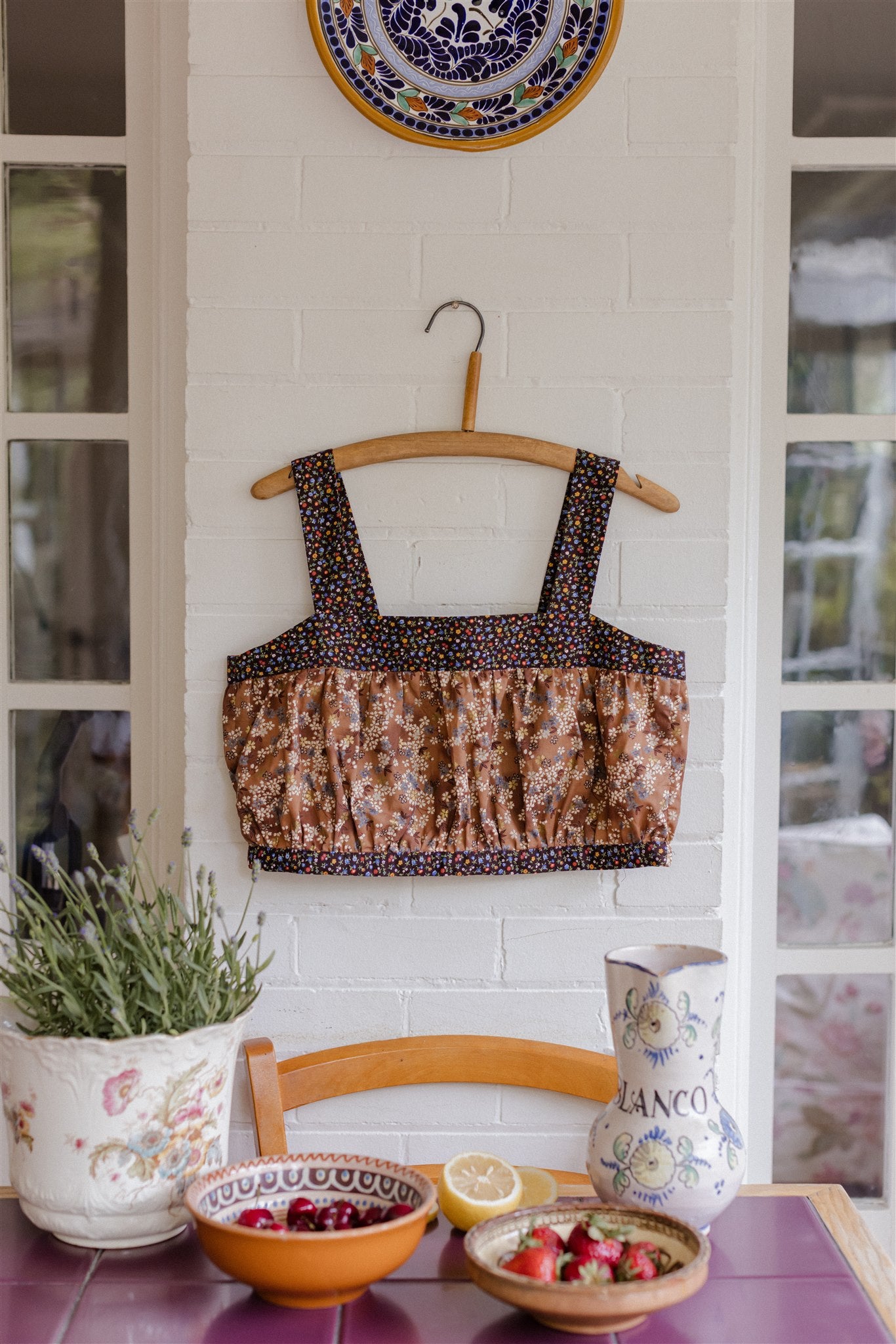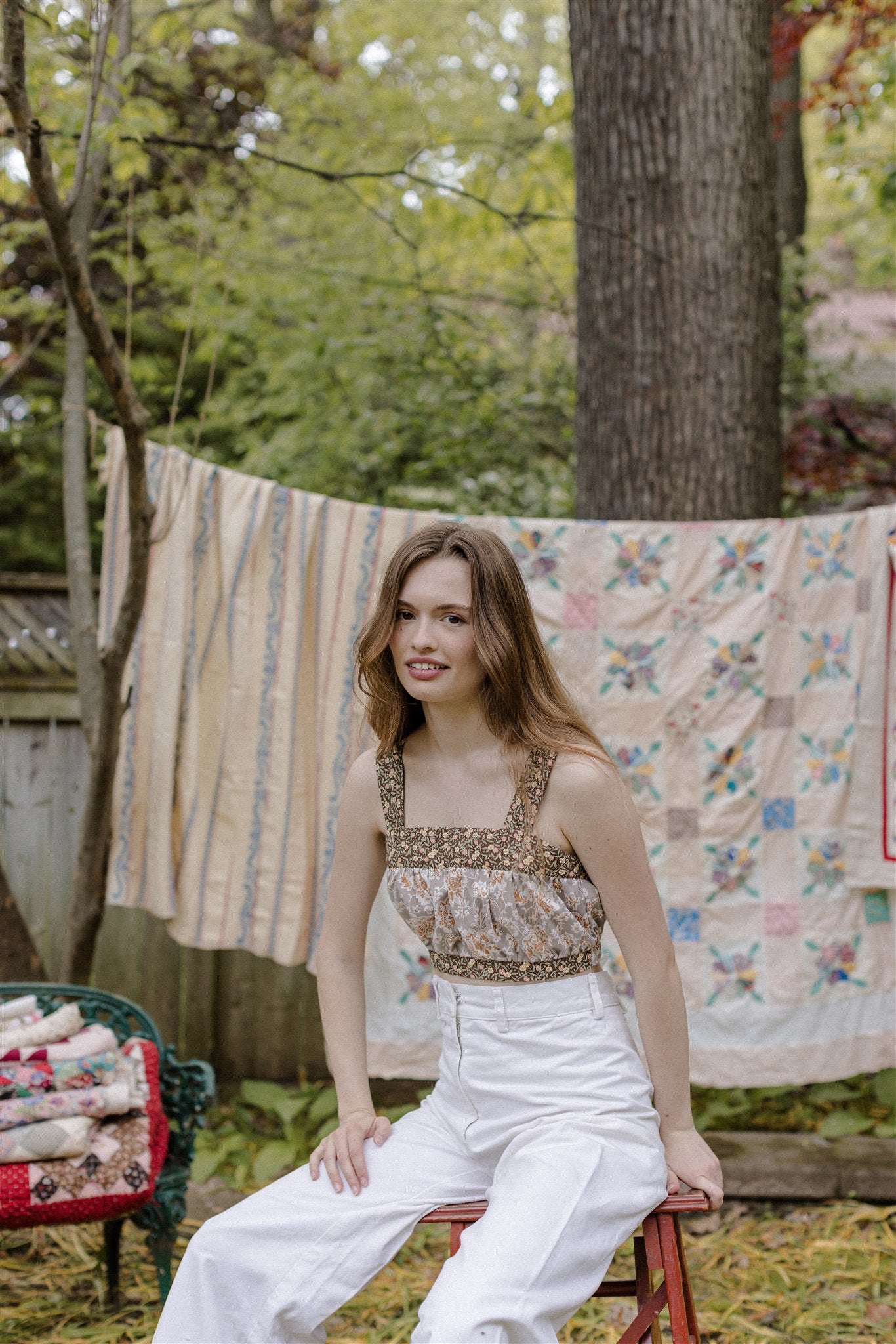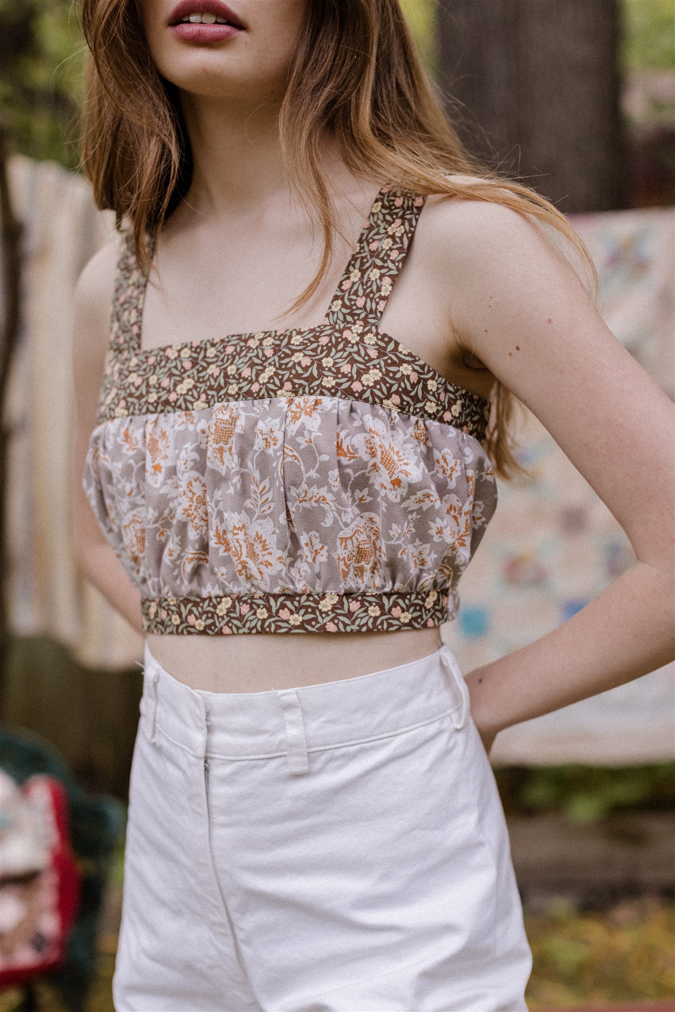 Quite possibly my favourite Honeybea piece of all time, the Zinnia Top is an endlessly versatile go-to with long skirts, white sailor pants, vintage overalls and high-waisted denim. Inspired by 1940s farmwear with wide straps and a boxy cut, it sits just above the bottom of the ribcage and is made for the perfect midriff moment. Cut and sewn in a once in a lifetime stash of gritty vintage gold and designed with an elasticated back for easy wearing and a flexible fit, we have introduced an adjustable strap with two big buttons in the back to make this small but mighty beauty even better than ever.