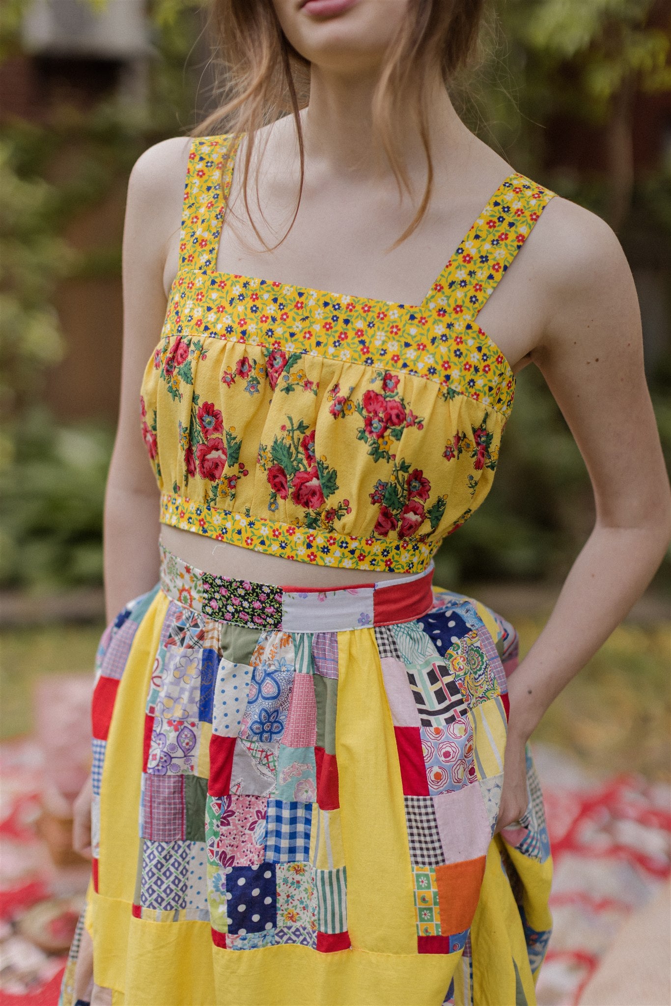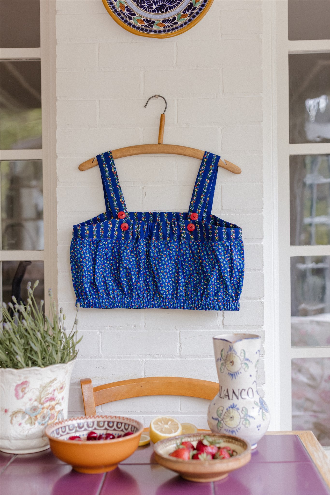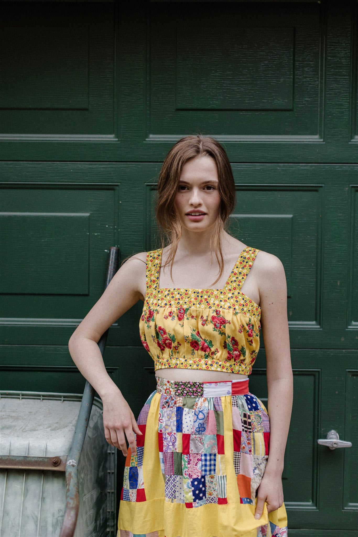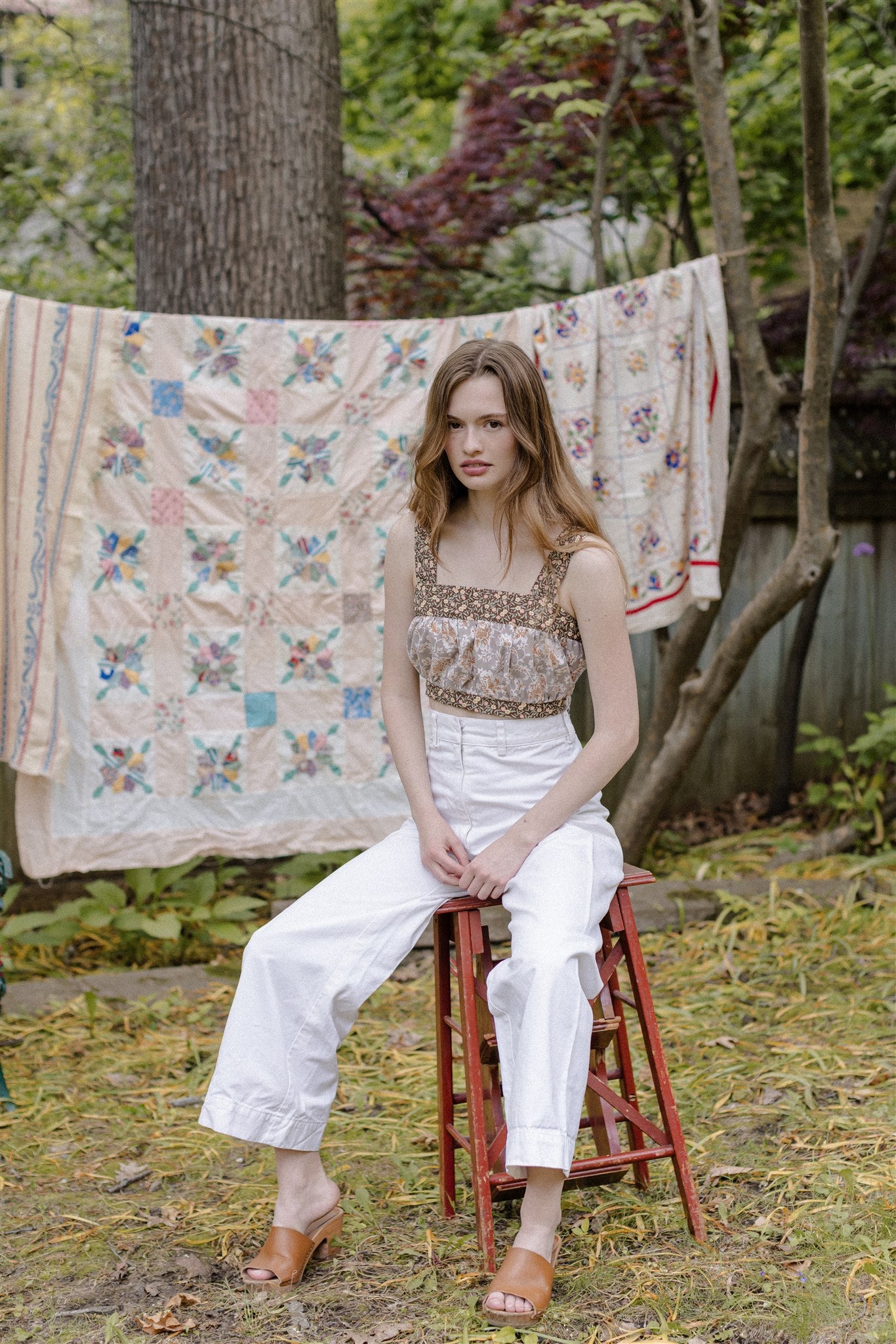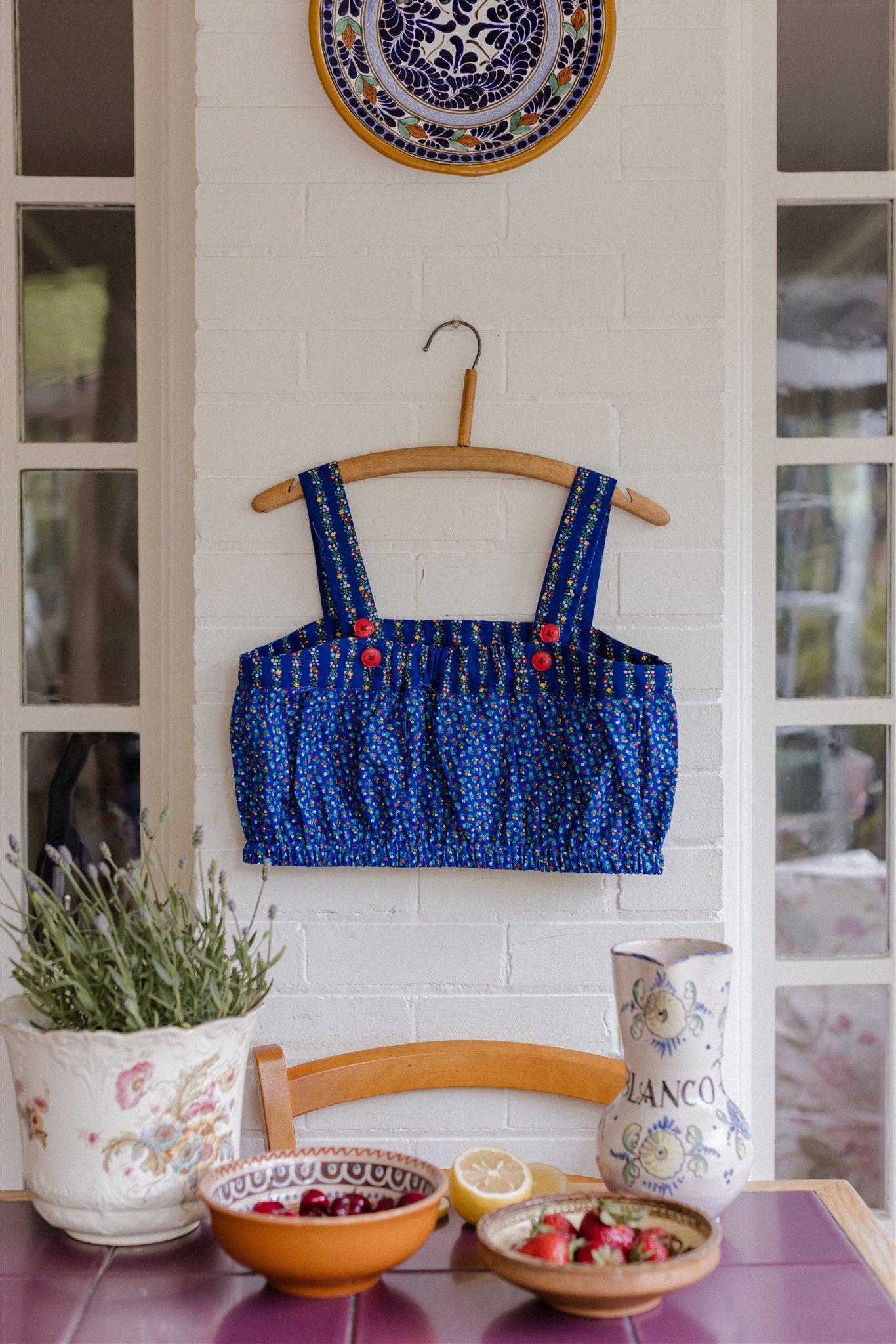 Quite possibly my favourite Honeybea piece of all time, the Zinnia Top is an endlessly versatile go-to with long skirts, white sailor pants, vintage overalls and high-waisted denim. Inspired by 1940s farmwear with wide straps and a boxy cut, it sits just above the bottom of the ribcage and is made for the perfect midriff moment. Cut and sewn in a once in a lifetime stash of gritty vintage gold and designed with an elasticated back for easy wearing and a flexible fit, we have introduced an adjustable strap with two big buttons in the back to make this small but mighty beauty even better than ever.