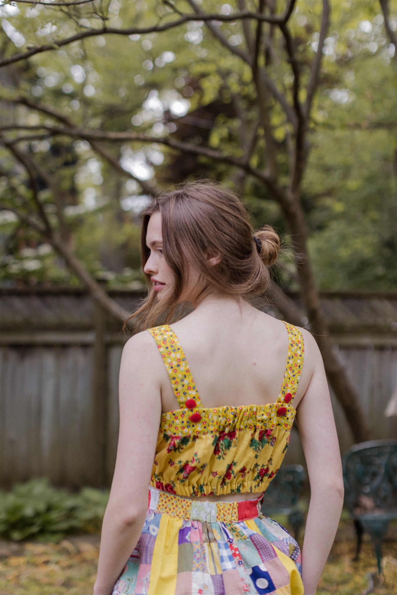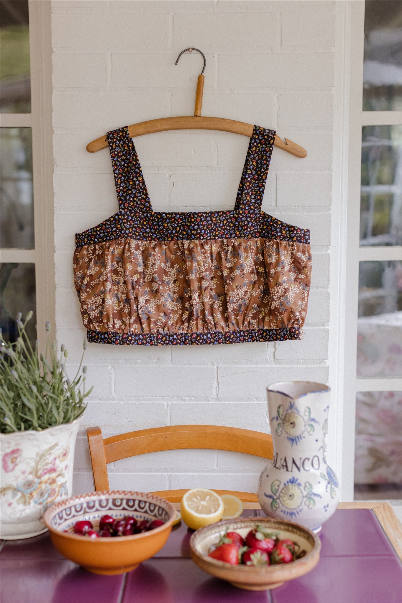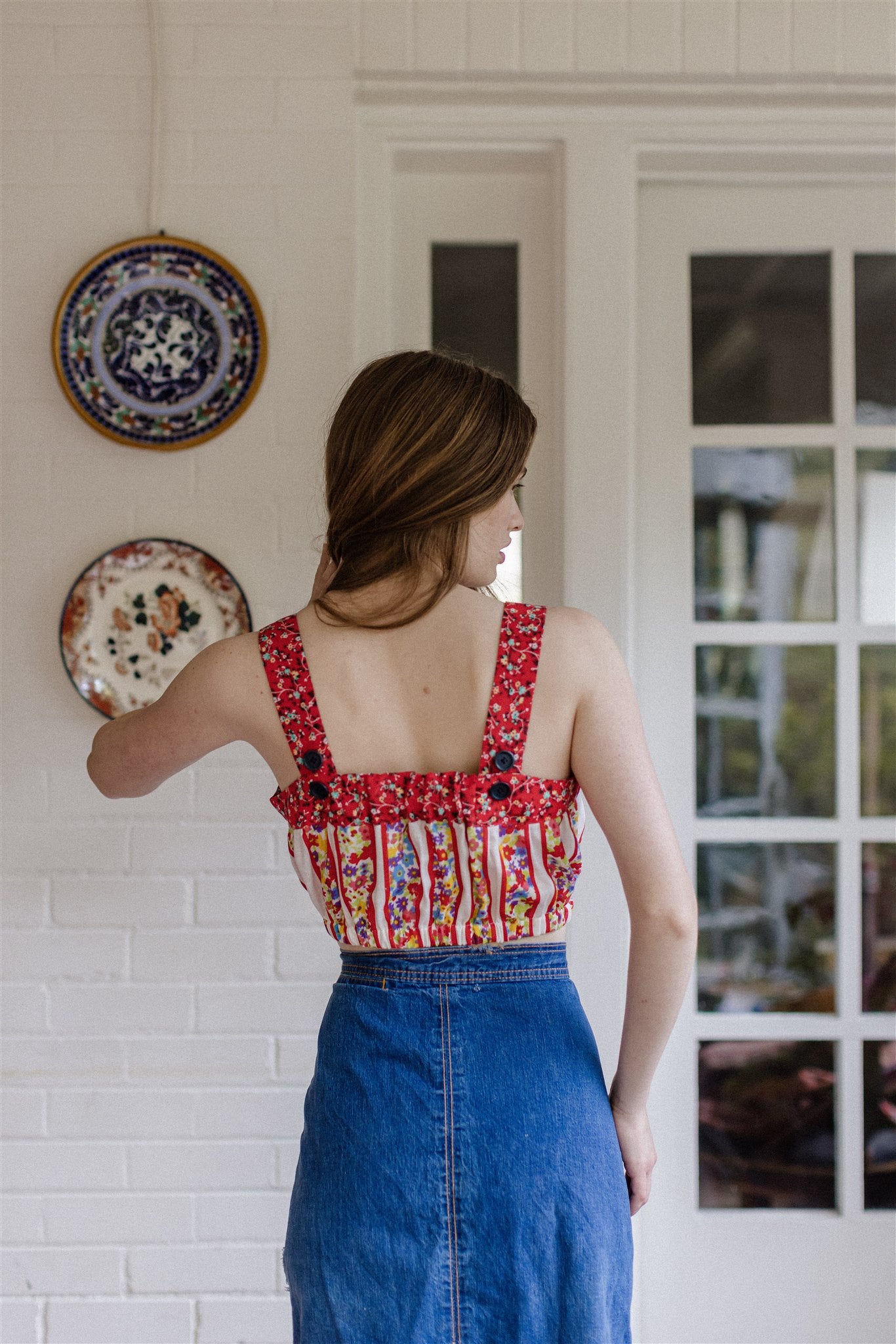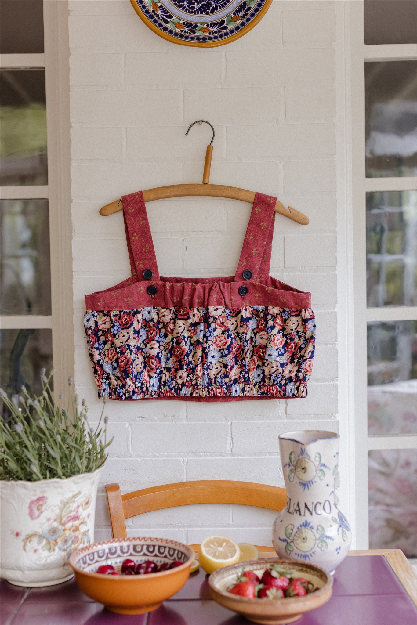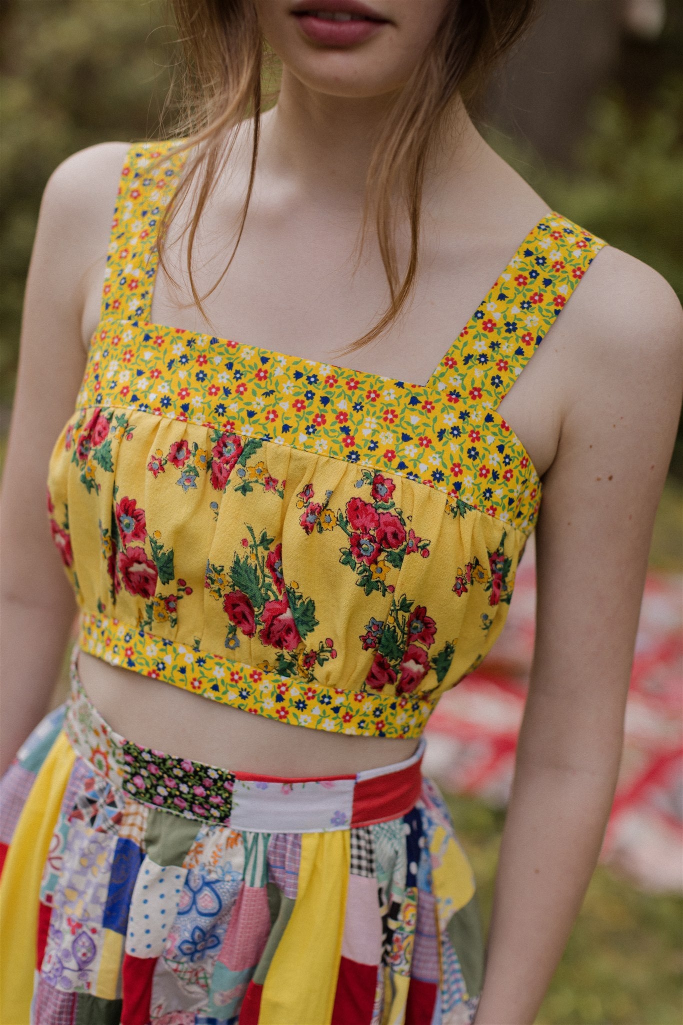 Quite possibly my favourite Honeybea piece of all time, the Zinnia Top is an endlessly versatile go-to with long skirts, white sailor pants, vintage overalls and high-waisted denim. Inspired by 1940s farmwear with wide straps and a boxy cut, it sits just above the bottom of the ribcage and is made for the perfect midriff moment. Cut and sewn in a once in a lifetime stash of gritty vintage gold and designed with an elasticated back for easy wearing and a flexible fit, we have introduced an adjustable strap with two big buttons in the back to make this small but mighty beauty even better than ever.
