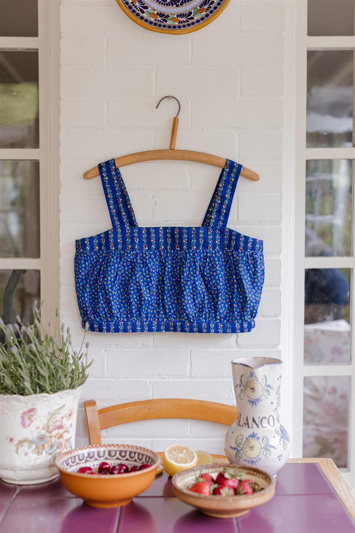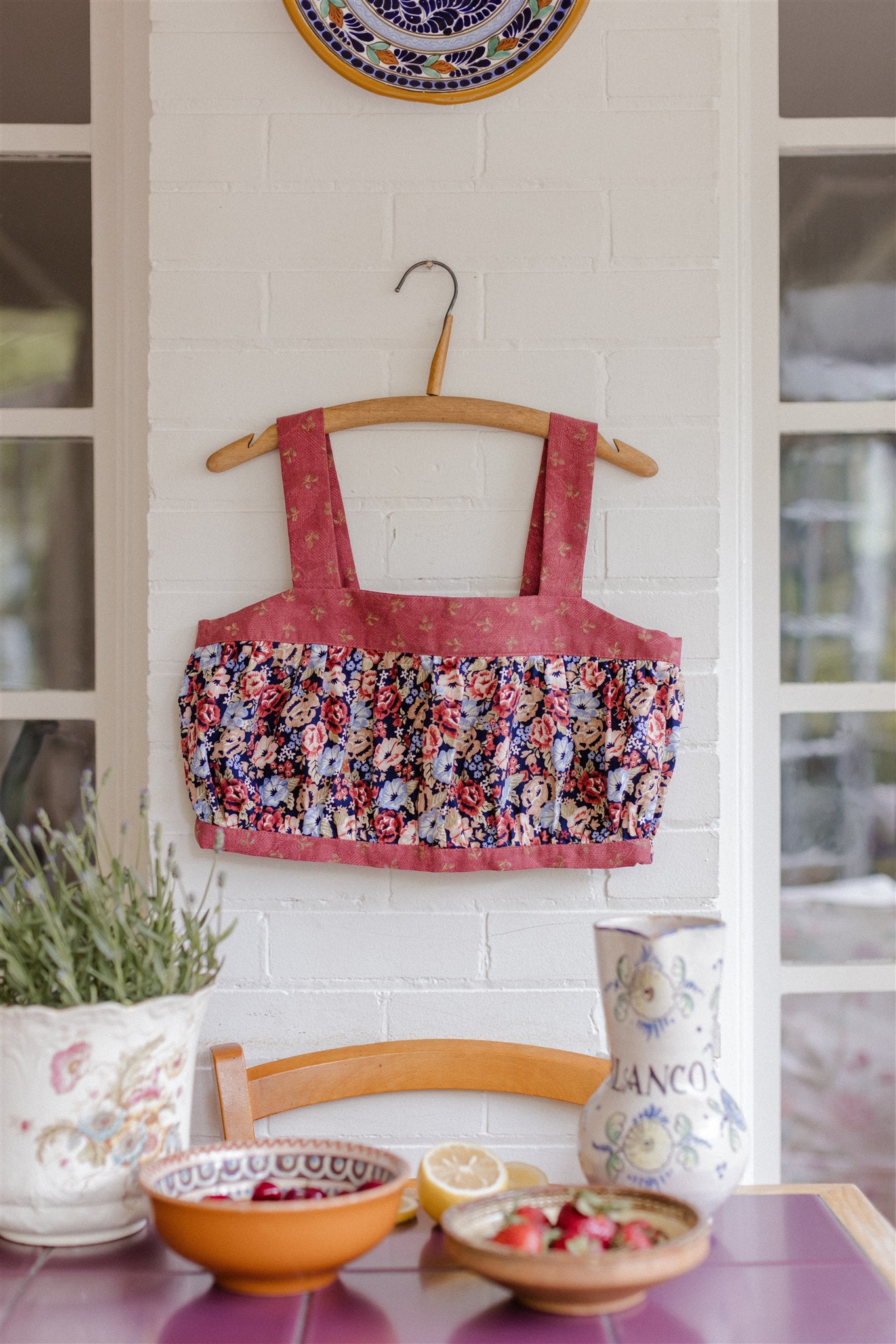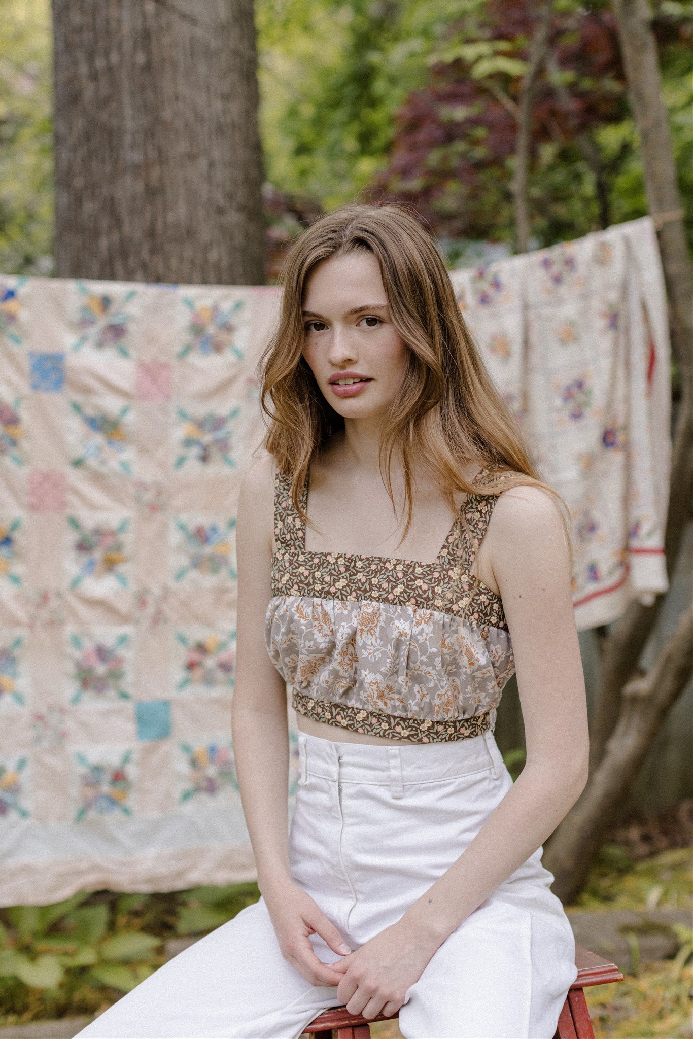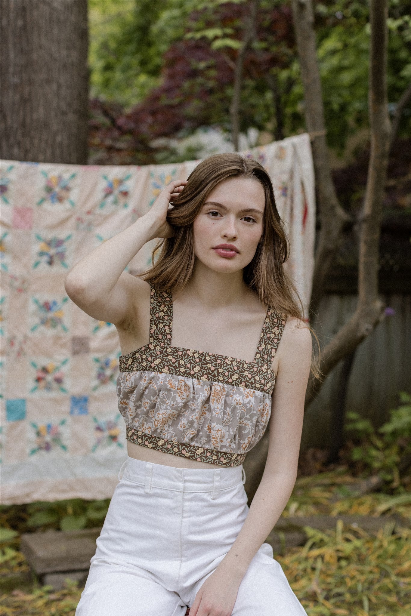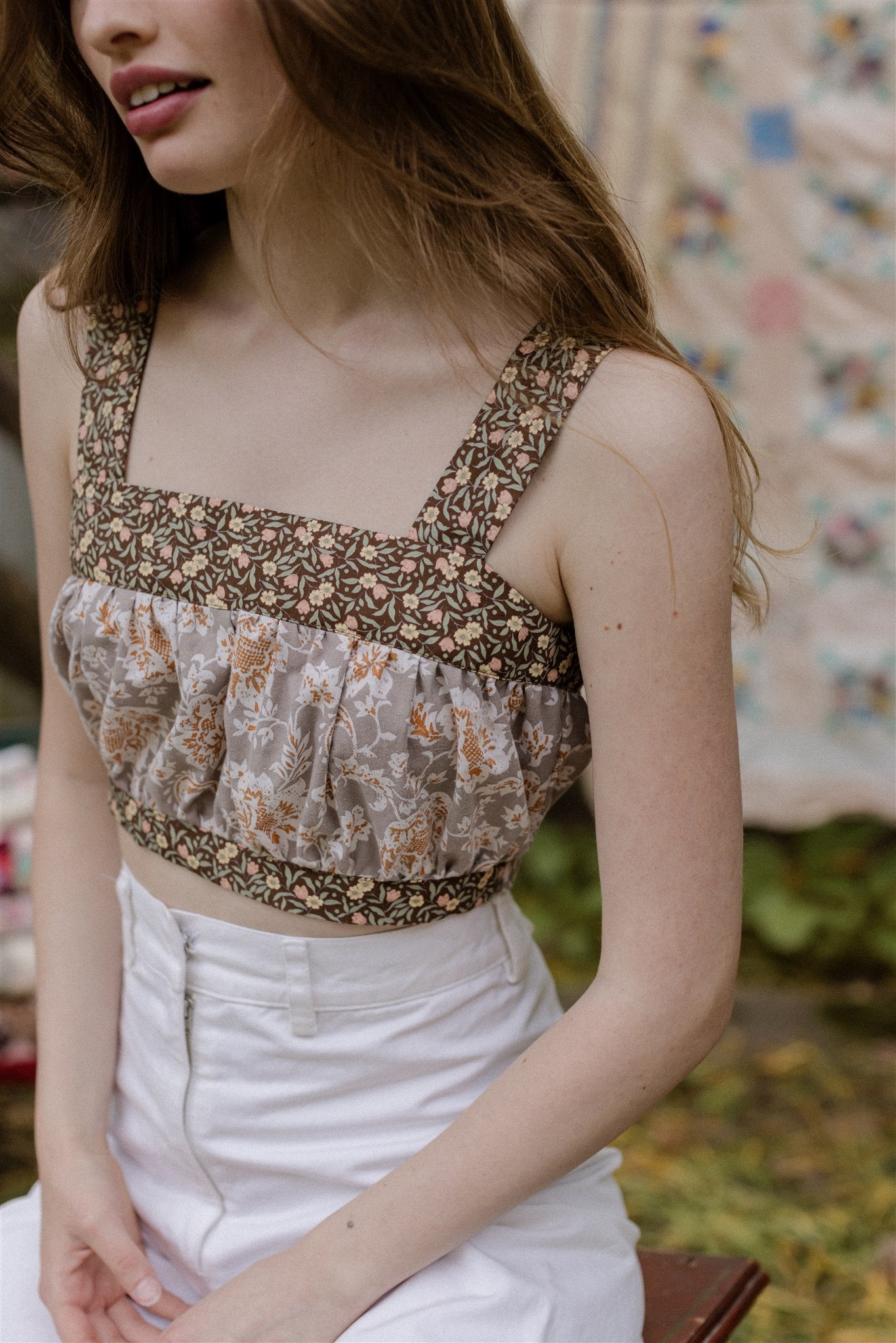Quite possibly my favourite Honeybea piece of all time, the Zinnia Top is an endlessly versatile go-to with long skirts, white sailor pants, vintage overalls and high-waisted denim. Inspired by 1940s farmwear with wide straps and a boxy cut, it sits just above the bottom of the ribcage and is made for the perfect midriff moment. Cut and sewn in a once in a lifetime stash of gritty vintage gold and designed with an elasticated back for easy wearing and a flexible fit, we have introduced an adjustable strap with two big buttons in the back to make this small but mighty beauty even better than ever.