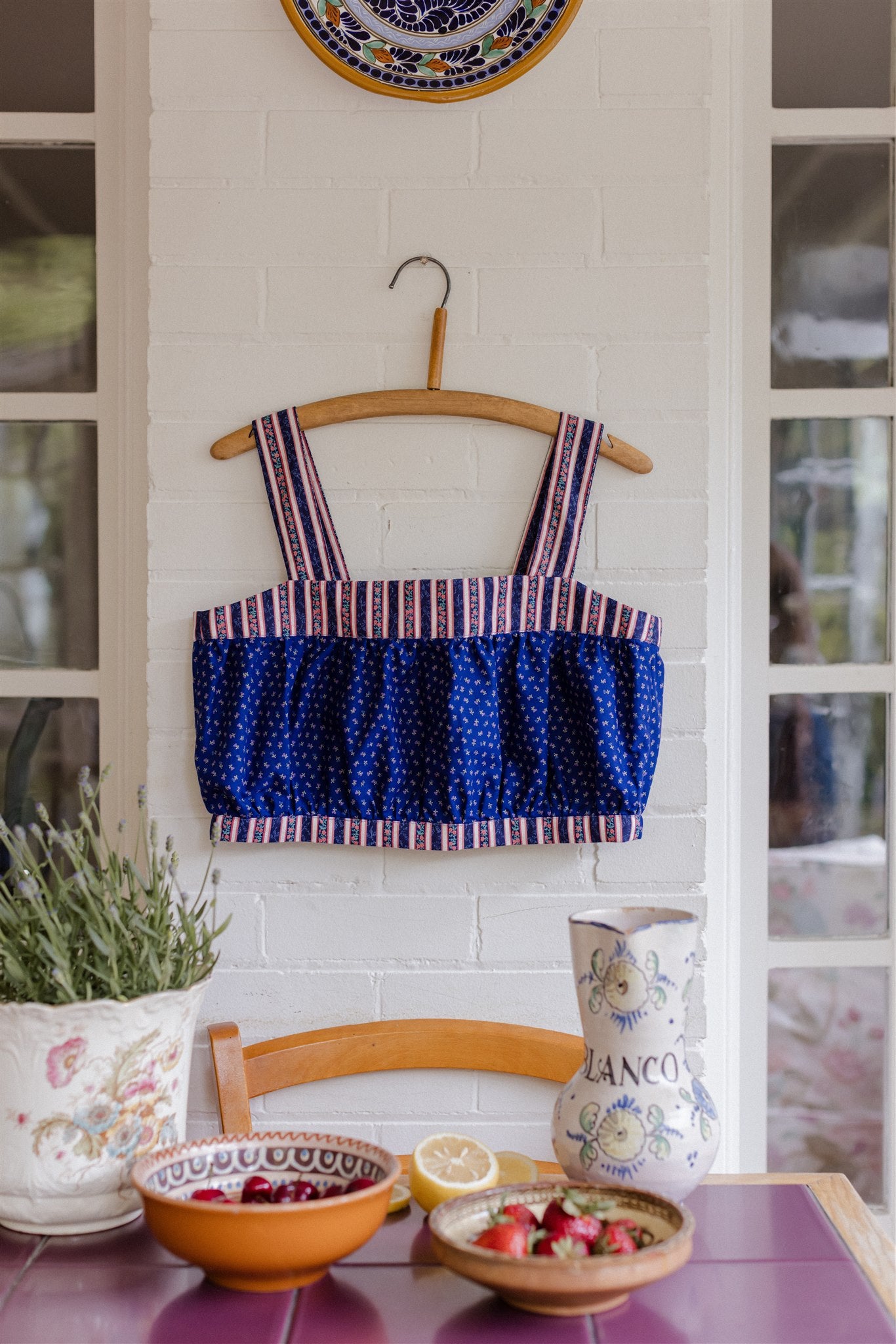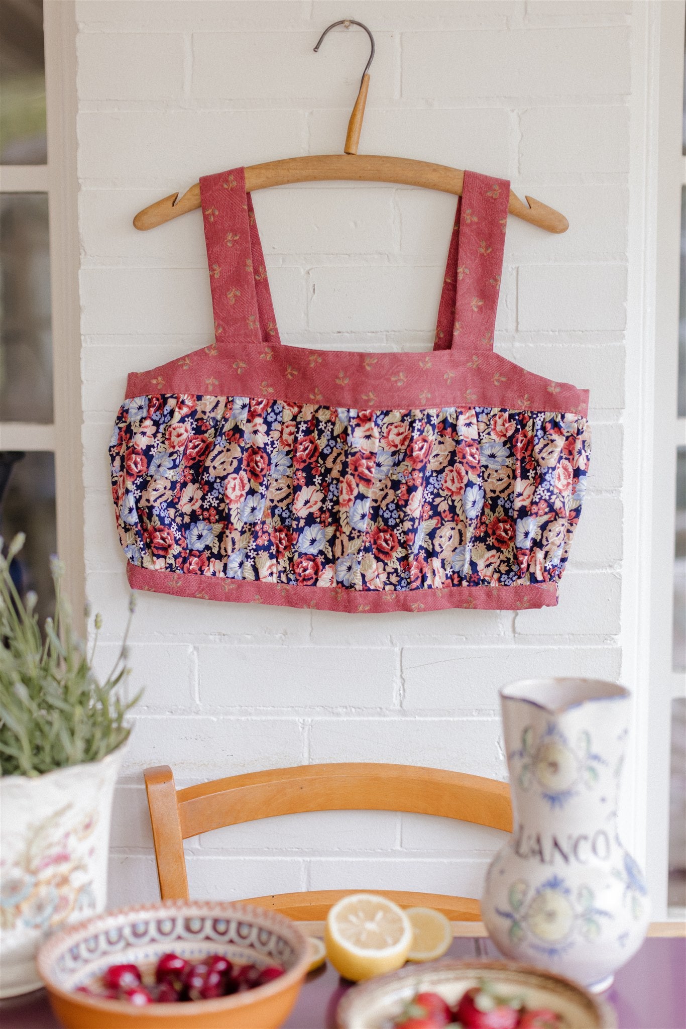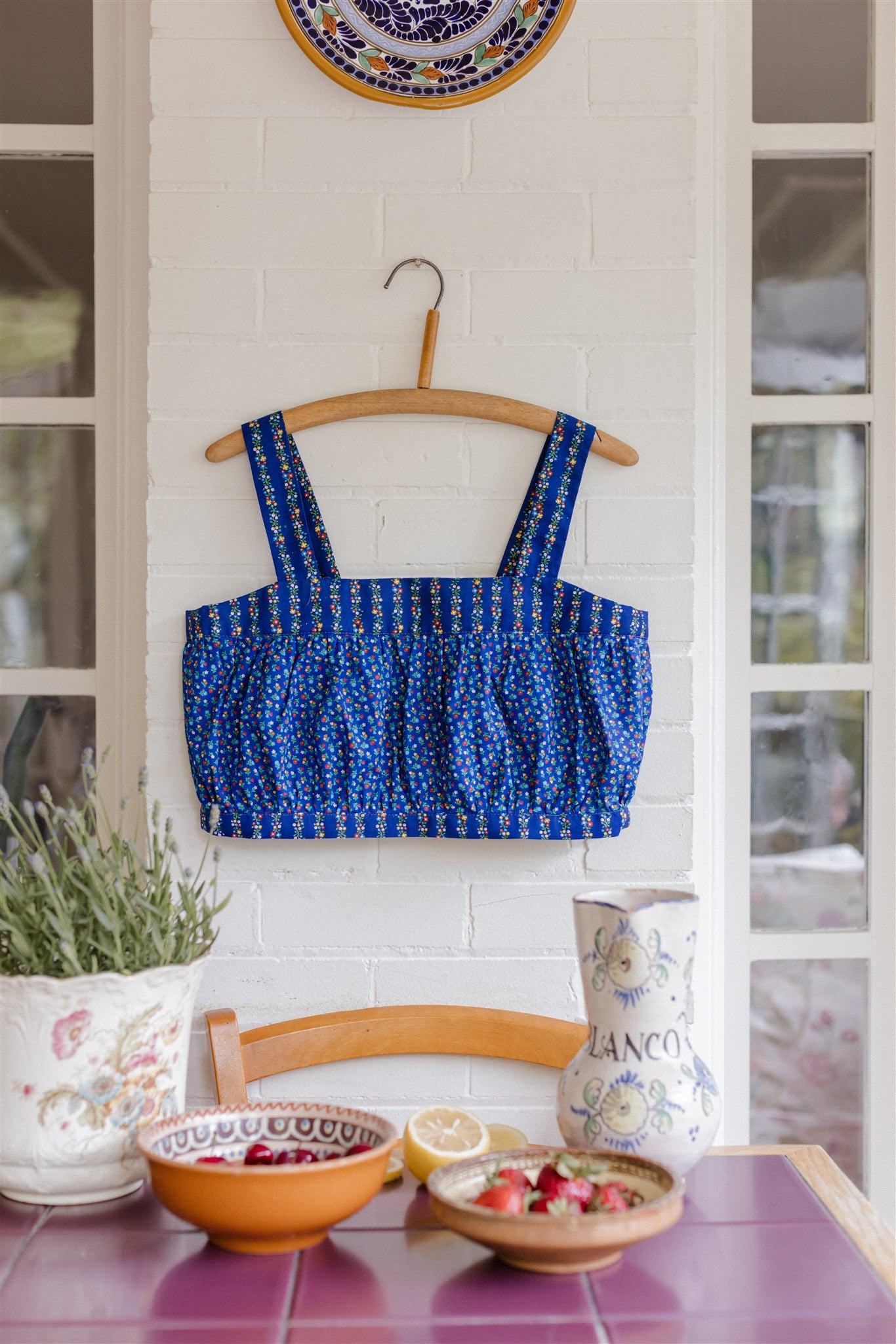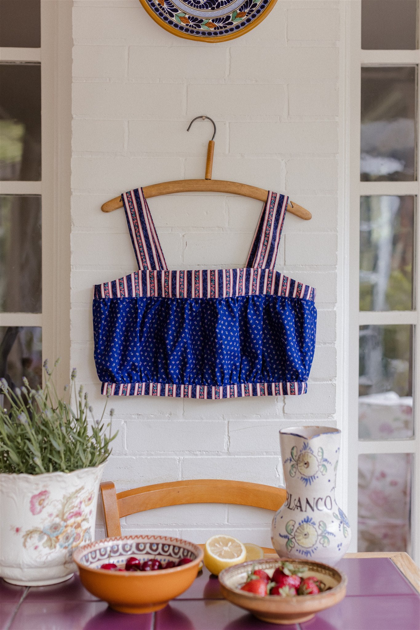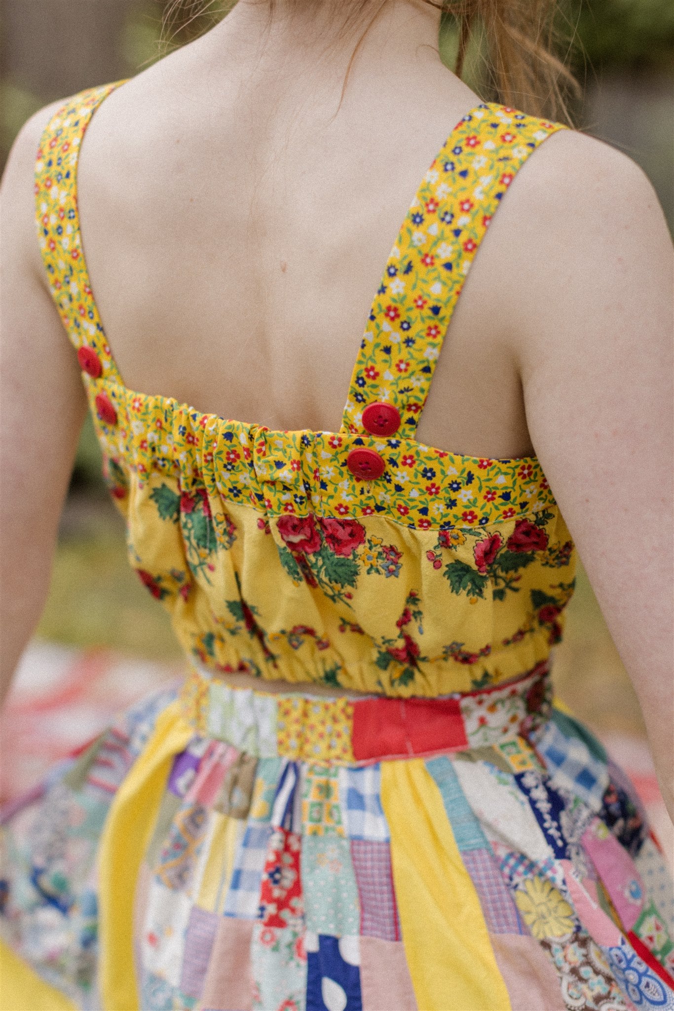 Quite possibly my favourite Honeybea piece of all time, the Zinnia Top is an endlessly versatile go-to with long skirts, white sailor pants, vintage overalls and high-waisted denim. Inspired by 1940s farmwear with wide straps and a boxy cut, it sits just above the bottom of the ribcage and is made for the perfect midriff moment. Cut and sewn in a once in a lifetime stash of gritty vintage gold and designed with an elasticated back for easy wearing and a flexible fit, we have introduced an adjustable strap with two big buttons in the back to make this small but mighty beauty even better than ever.