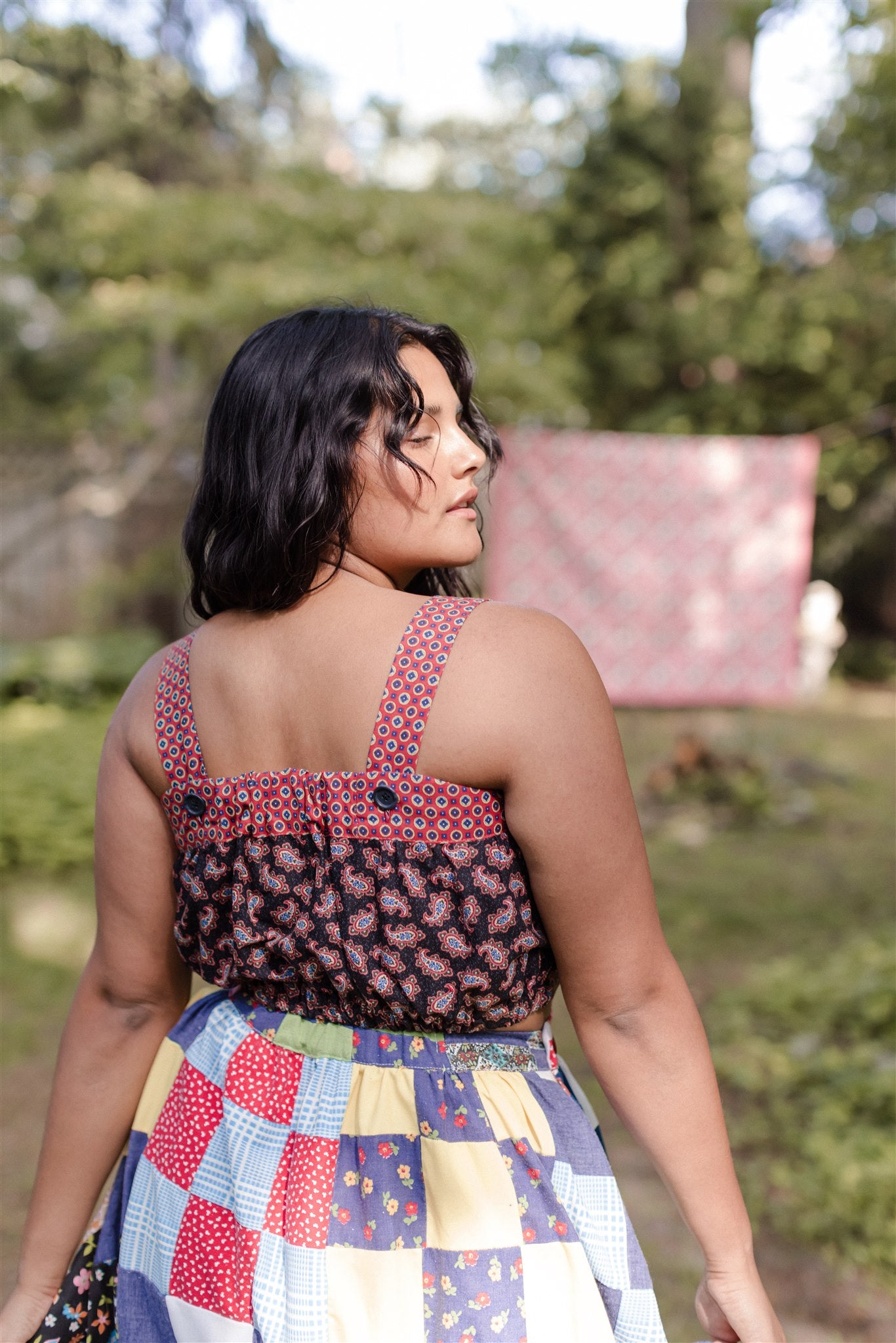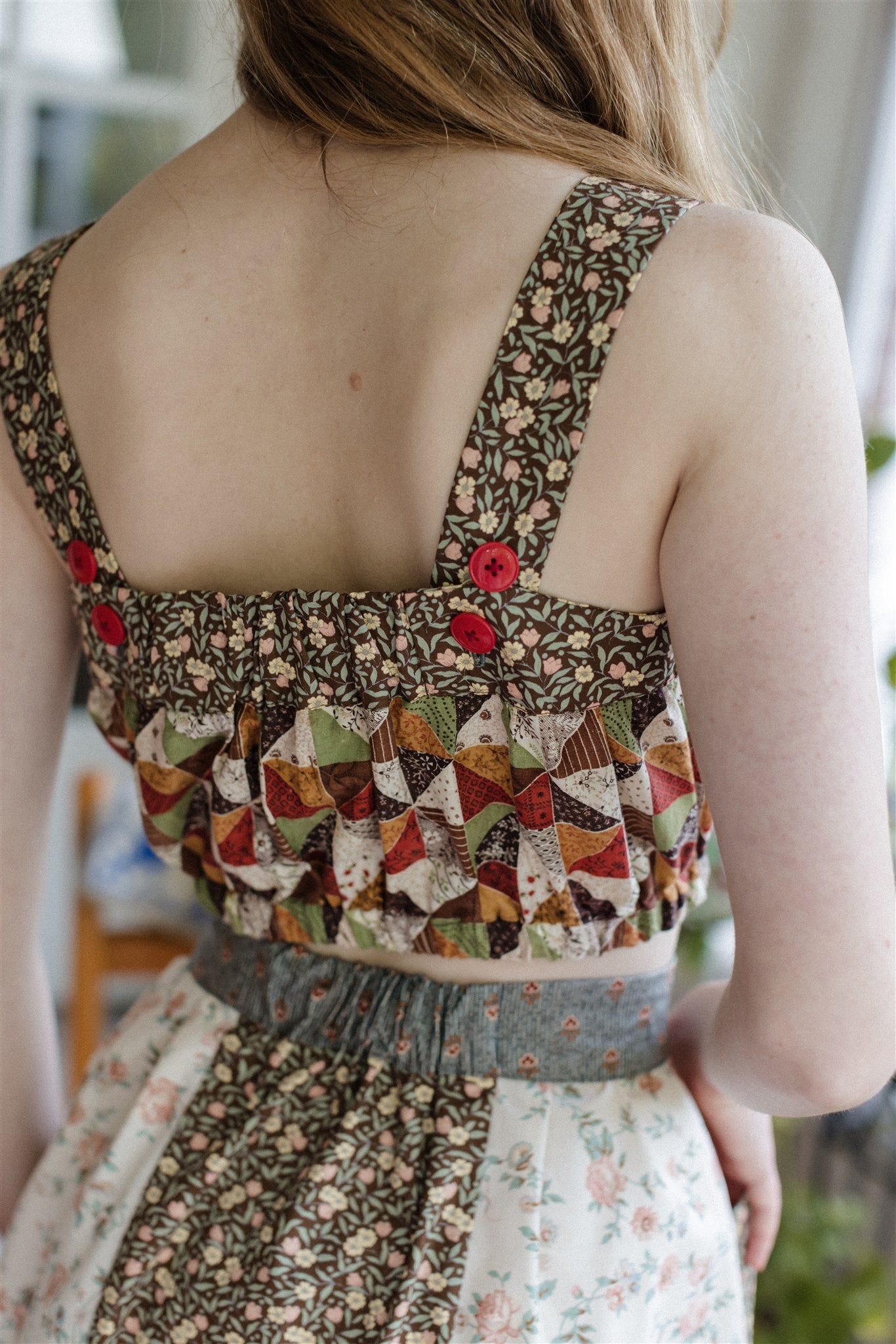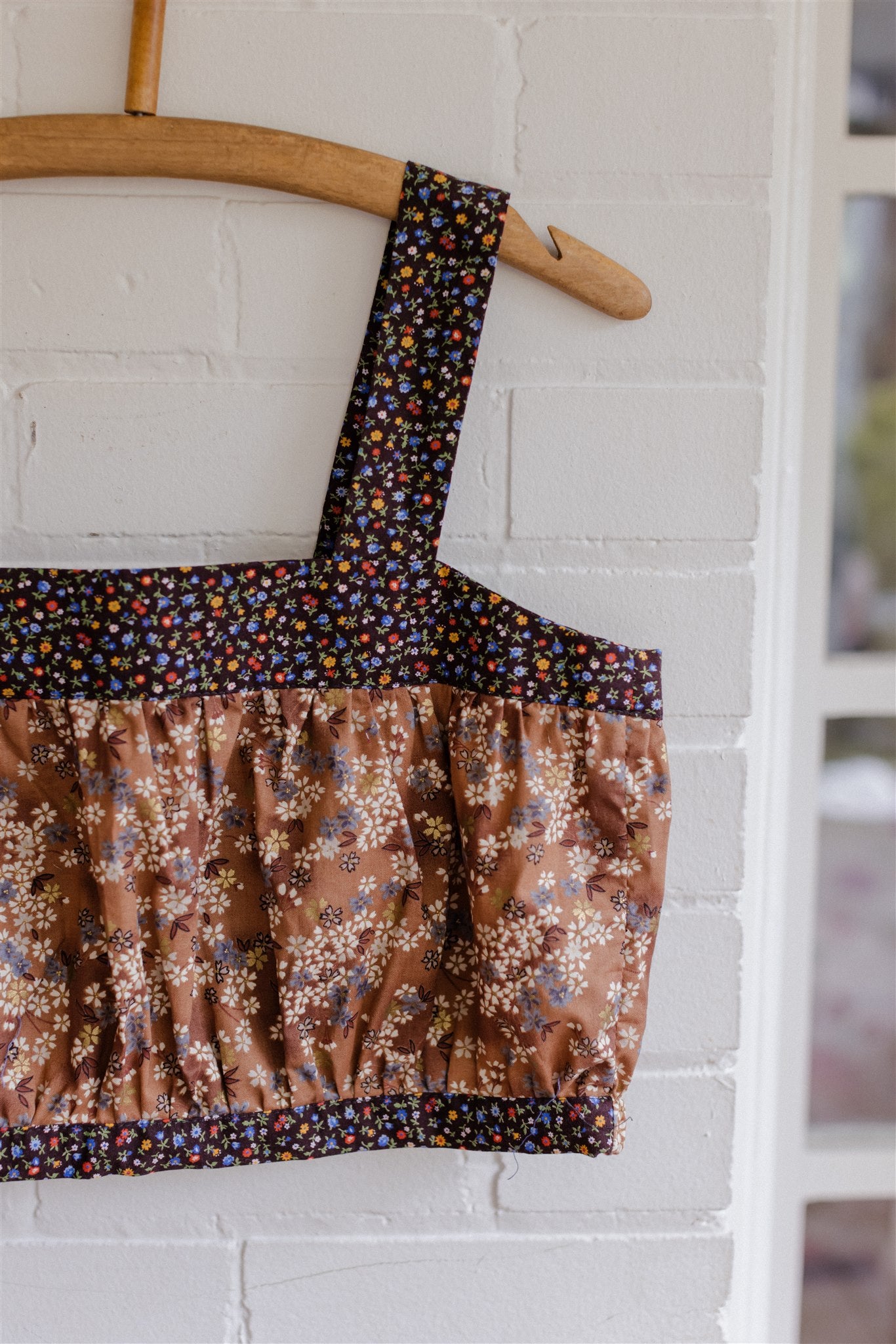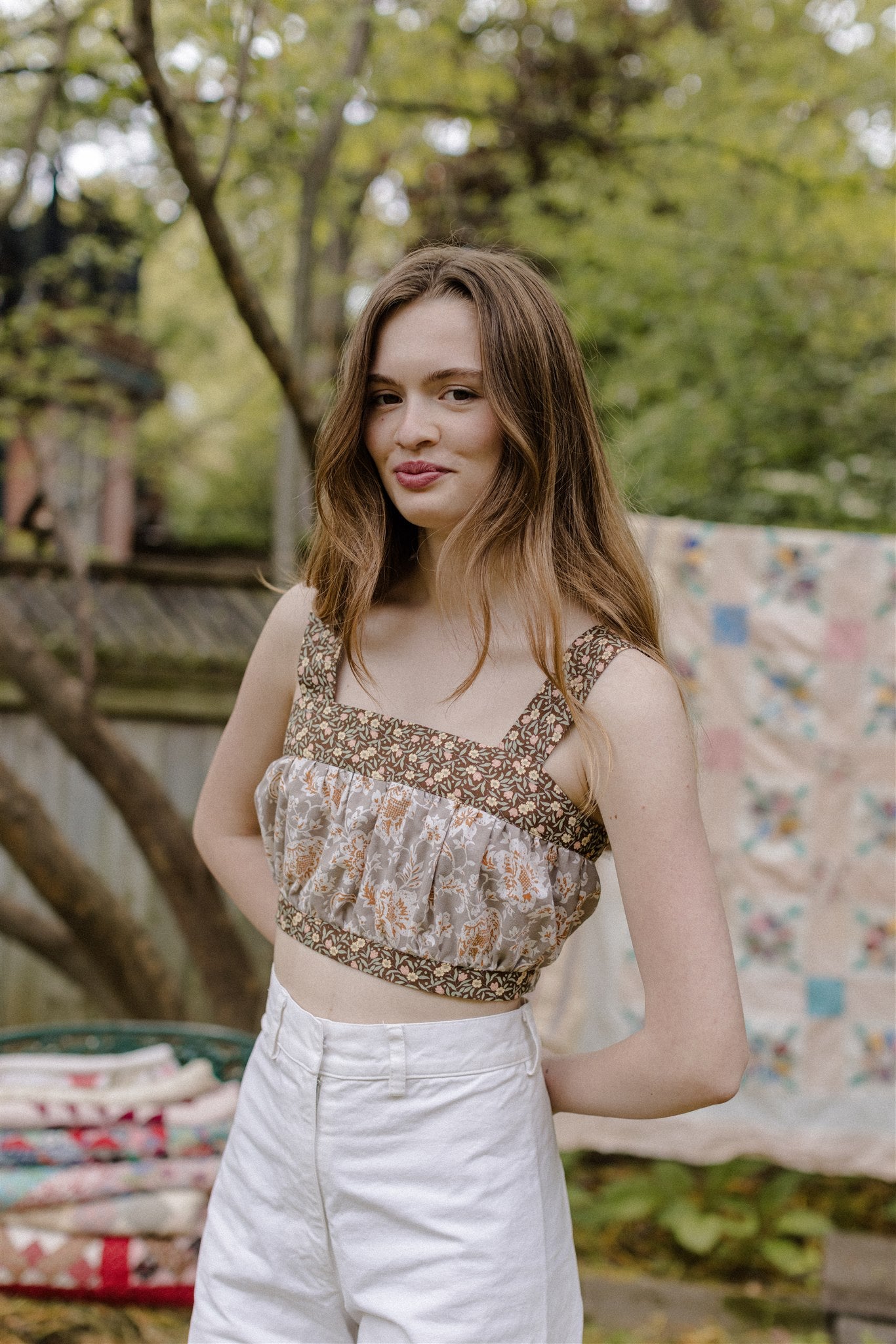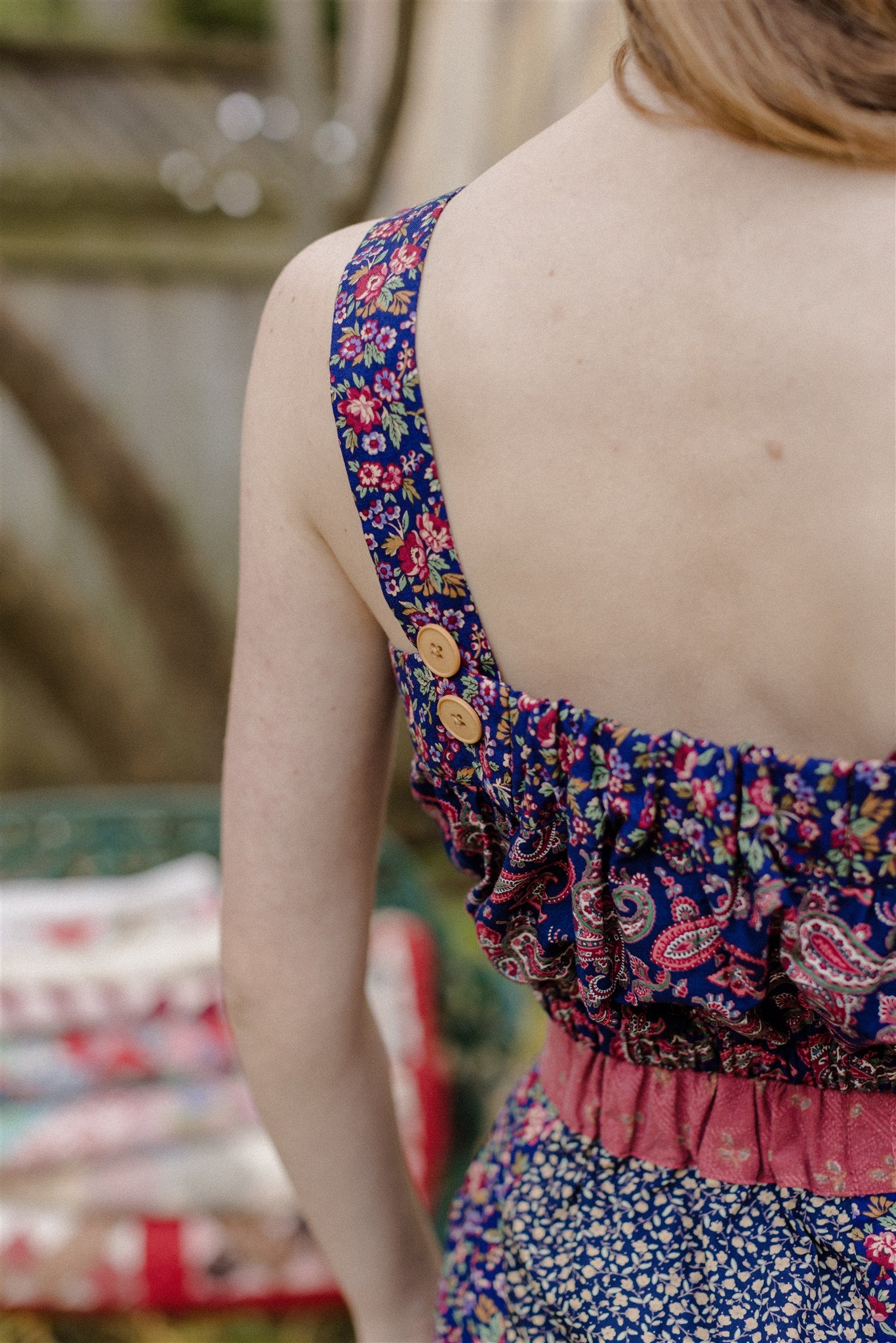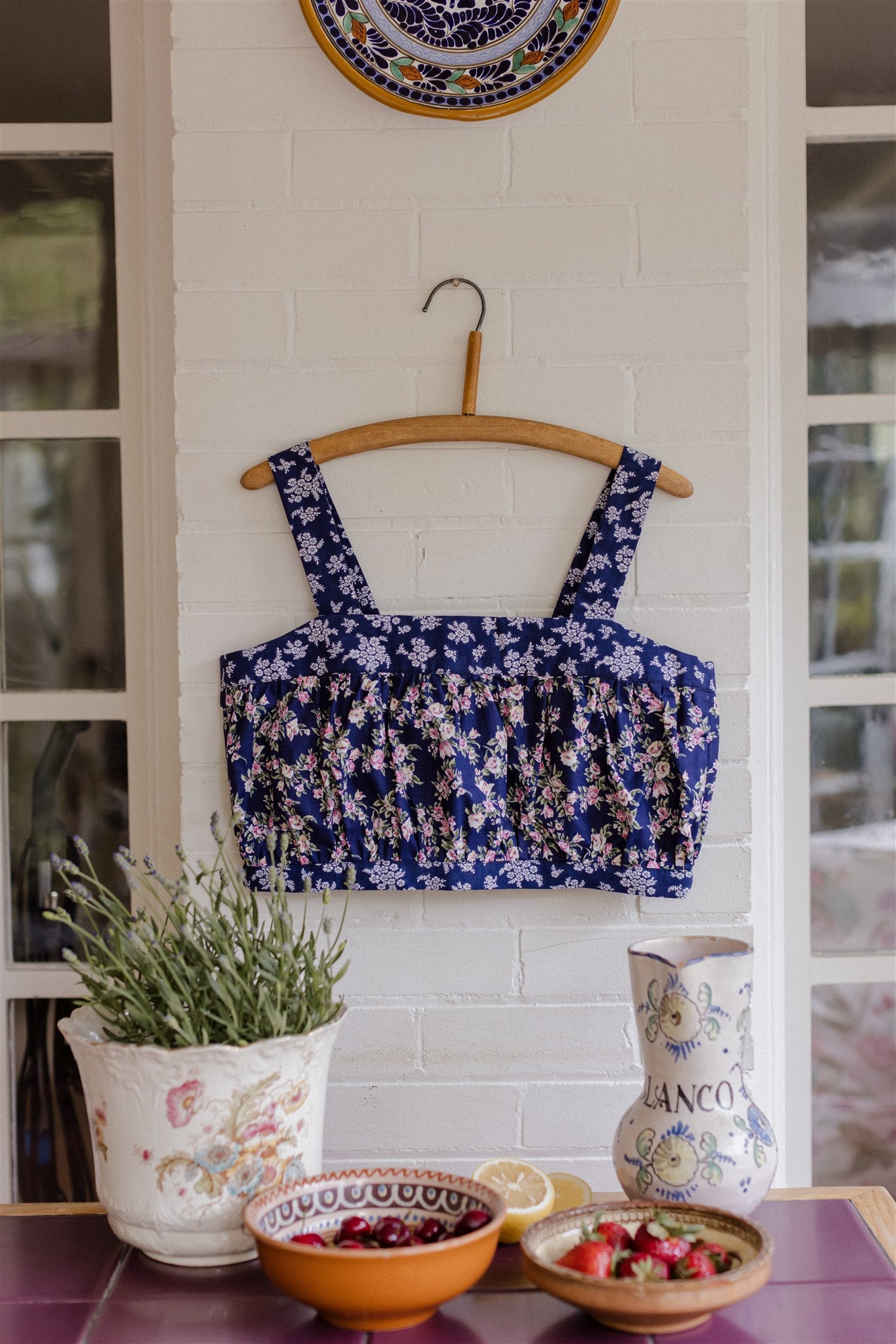 Quite possibly my favourite Honeybea piece of all time, the Zinnia Top is an endlessly versatile go-to with long skirts, white sailor pants, vintage overalls and high-waisted denim. Inspired by 1940s farmwear with wide straps and a boxy cut, it sits just above the bottom of the ribcage and is made for the perfect midriff moment. Cut and sewn in a once in a lifetime stash of gritty vintage gold and designed with an elasticated back for easy wearing and a flexible fit, we have introduced an adjustable strap with two big buttons in the back to make this small but mighty beauty even better than ever.