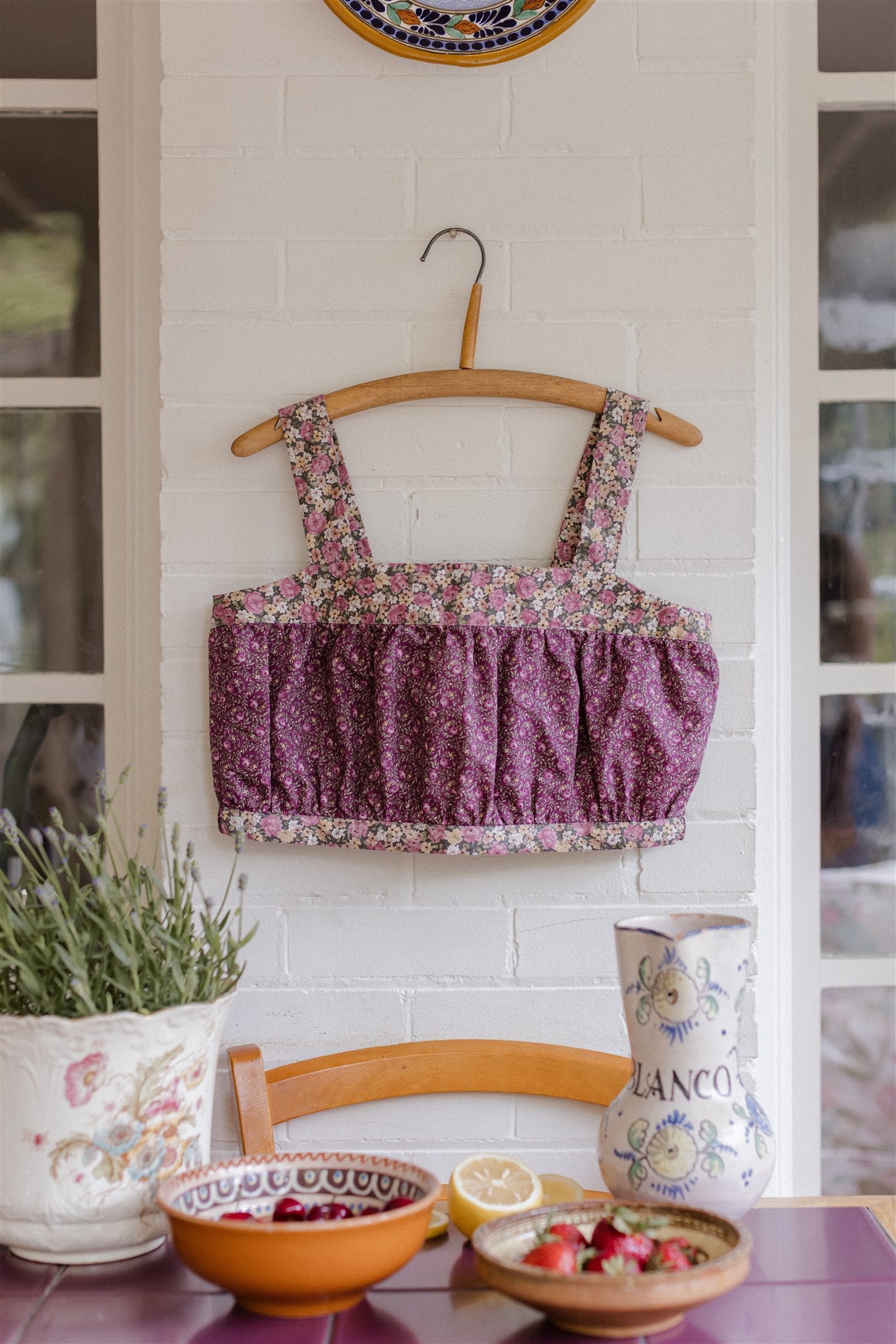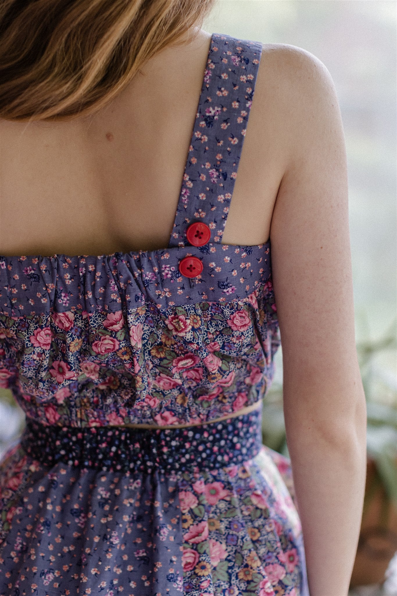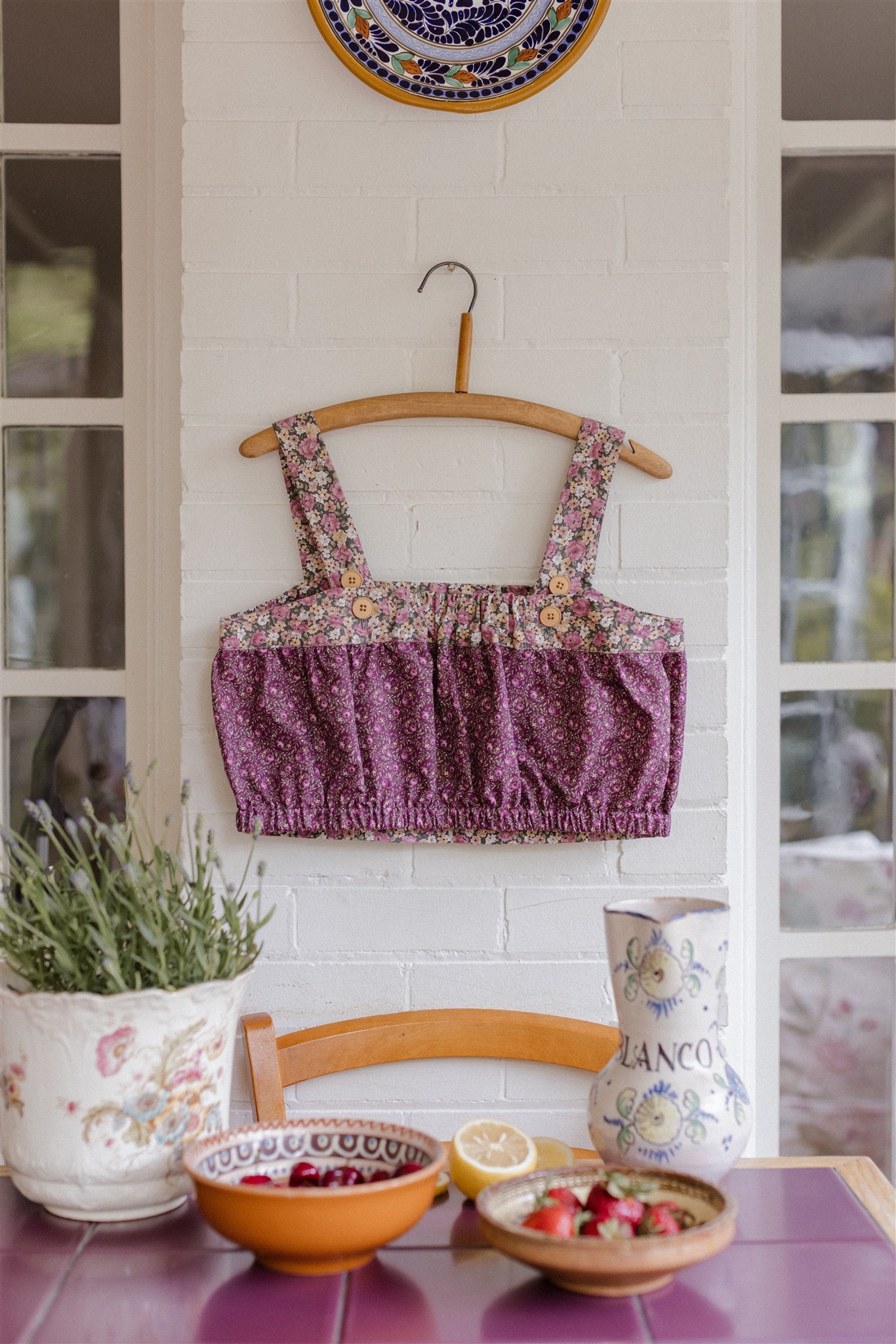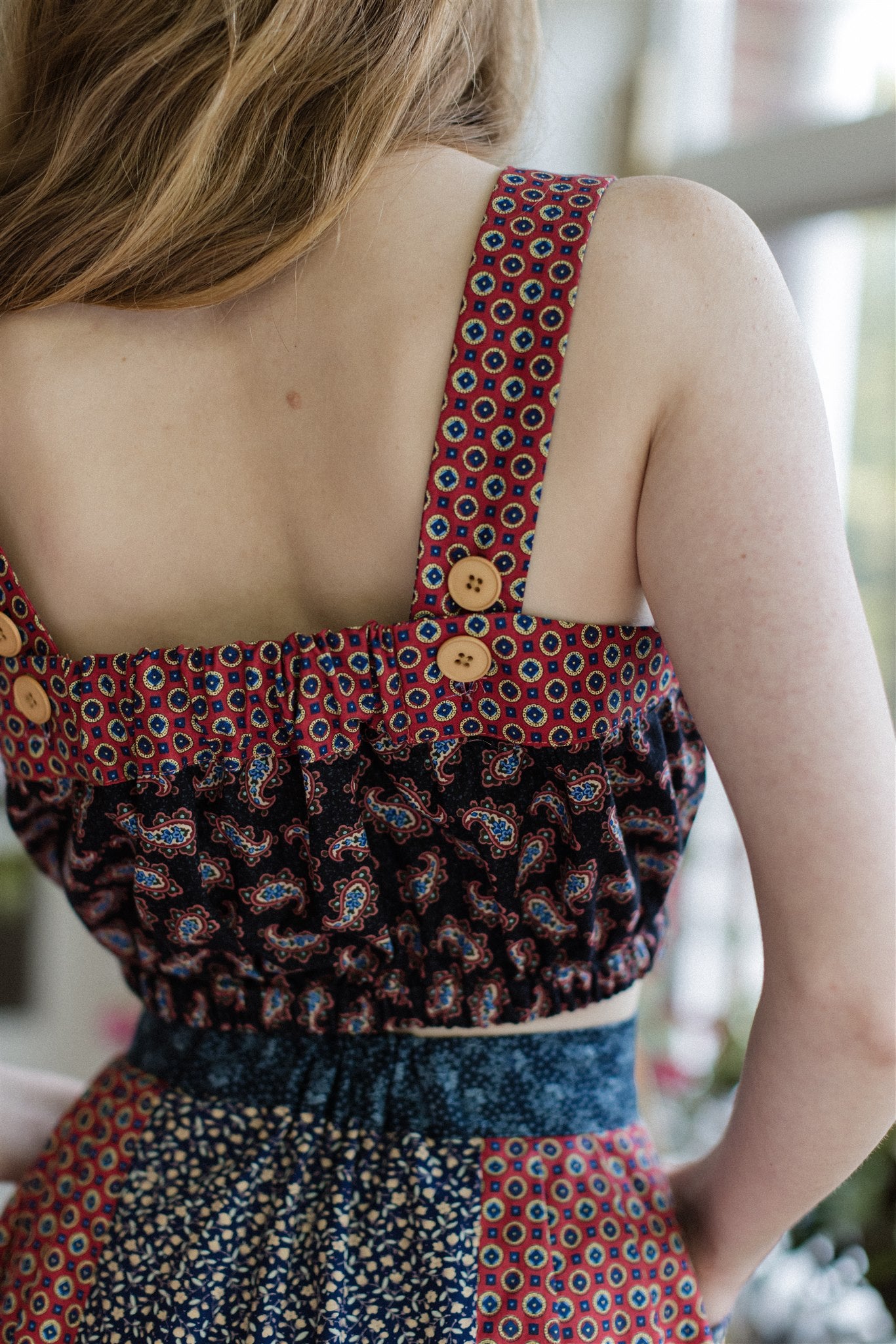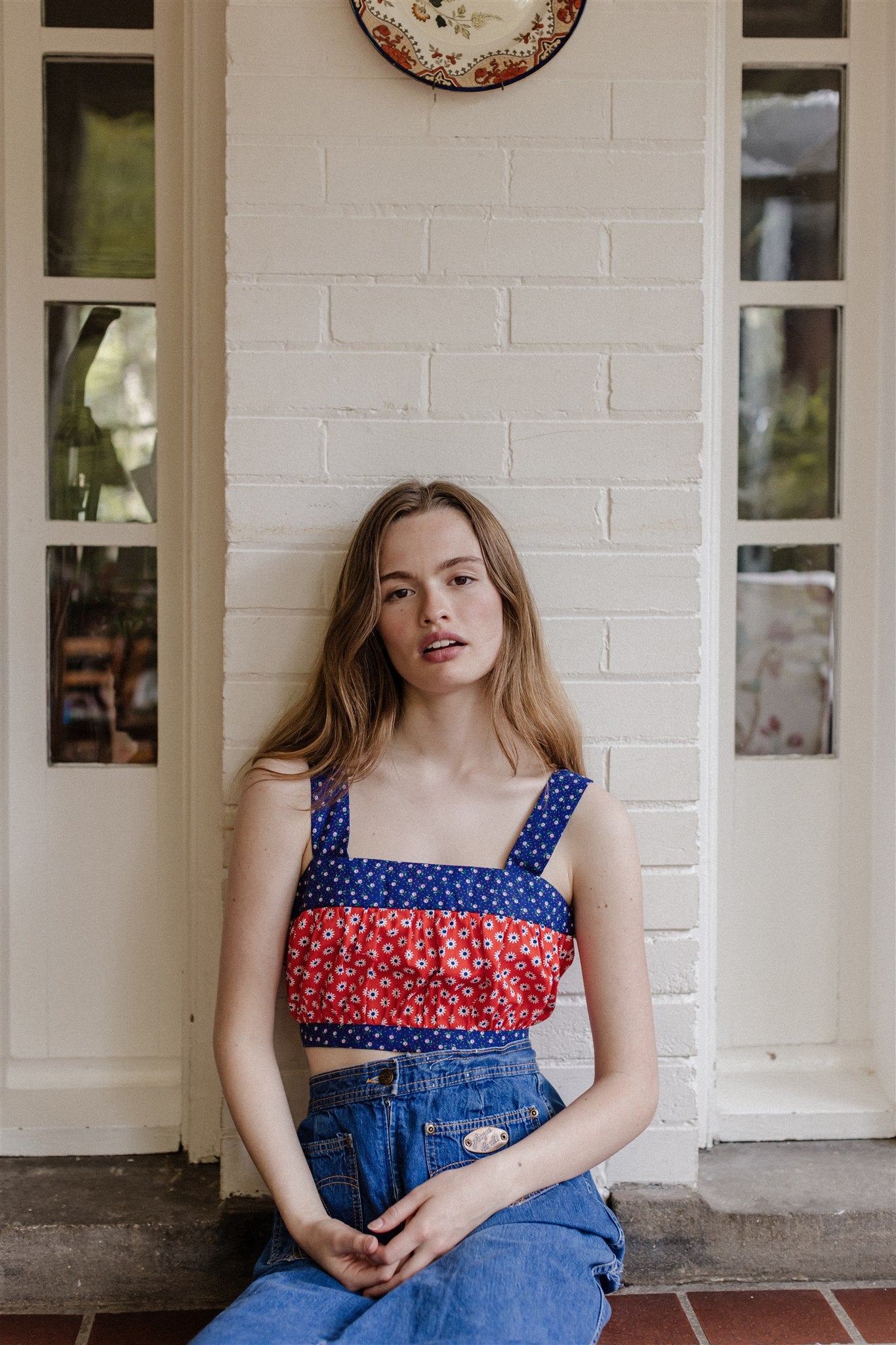 Quite possibly my favourite Honeybea piece of all time, the Zinnia Top is an endlessly versatile go-to with long skirts, white sailor pants, vintage overalls and high-waisted denim. Inspired by 1940s farmwear with wide straps and a boxy cut, it sits just above the bottom of the ribcage and is made for the perfect midriff moment. Cut and sewn in a once in a lifetime stash of gritty vintage gold and designed with an elasticated back for easy wearing and a flexible fit, we have introduced an adjustable strap with two big buttons in the back to make this small but mighty beauty even better than ever.