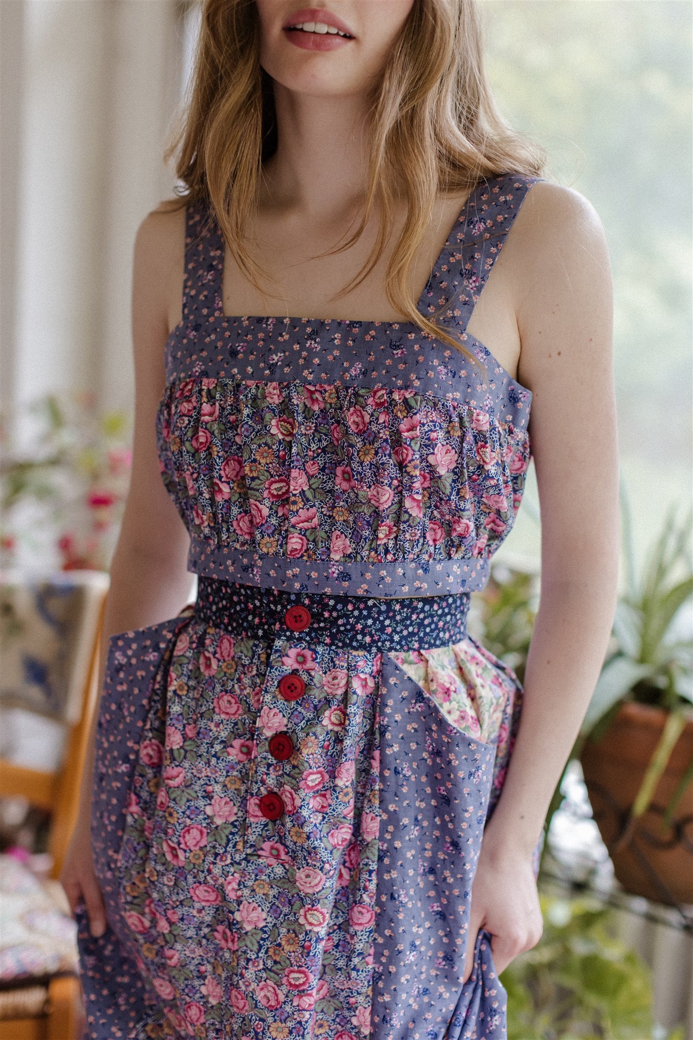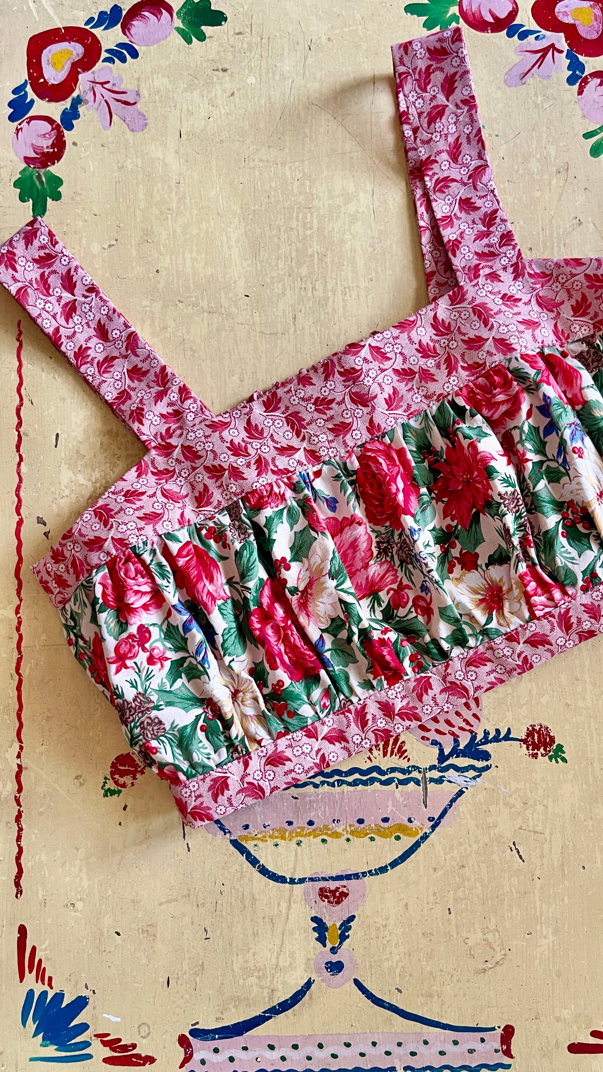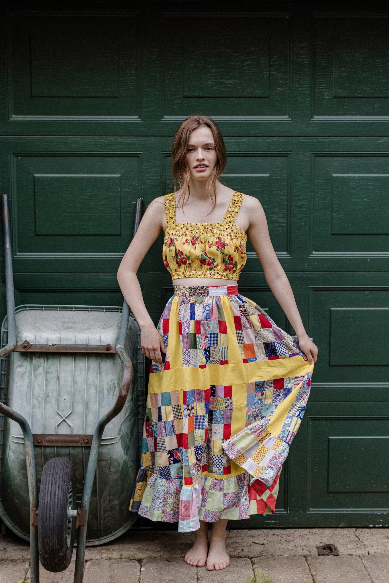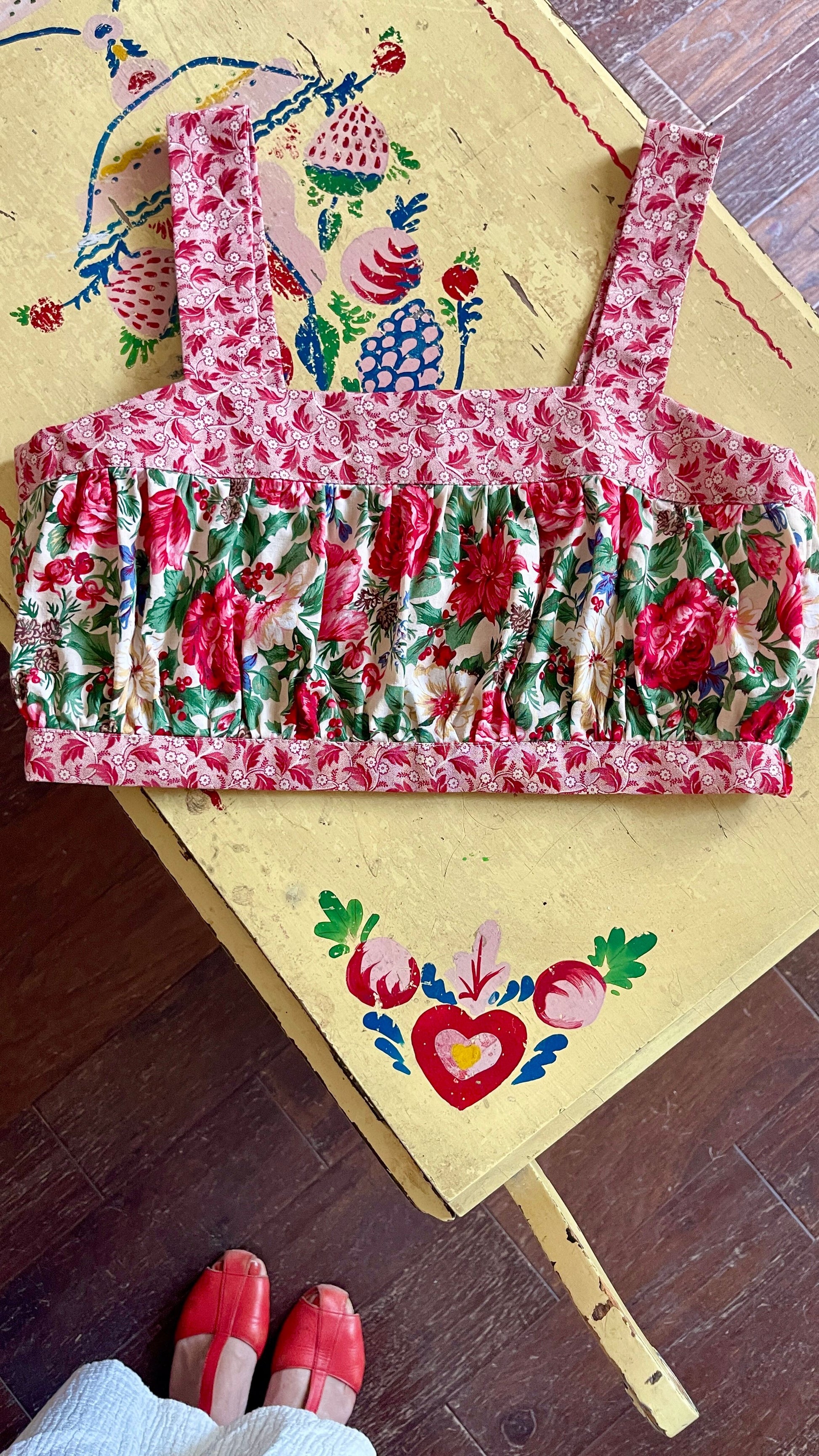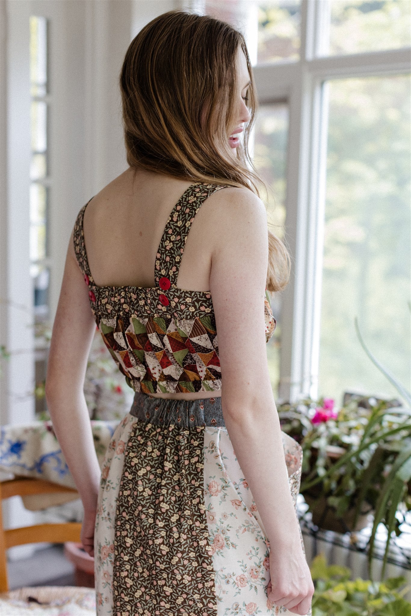 Quite possibly my favourite Honeybea piece of all time, the Zinnia Top is an endlessly versatile go-to with long skirts, white sailor pants, vintage overalls and high-waisted denim. Inspired by 1940s farmwear with wide straps and a boxy cut, it sits just above the bottom of the ribcage and is made for the perfect midriff moment. Cut and sewn in a once in a lifetime stash of gritty vintage gold and designed with an elasticated back for easy wearing and a flexible fit, we have introduced an adjustable strap with two big buttons in the back to make this small but mighty beauty even better than ever.