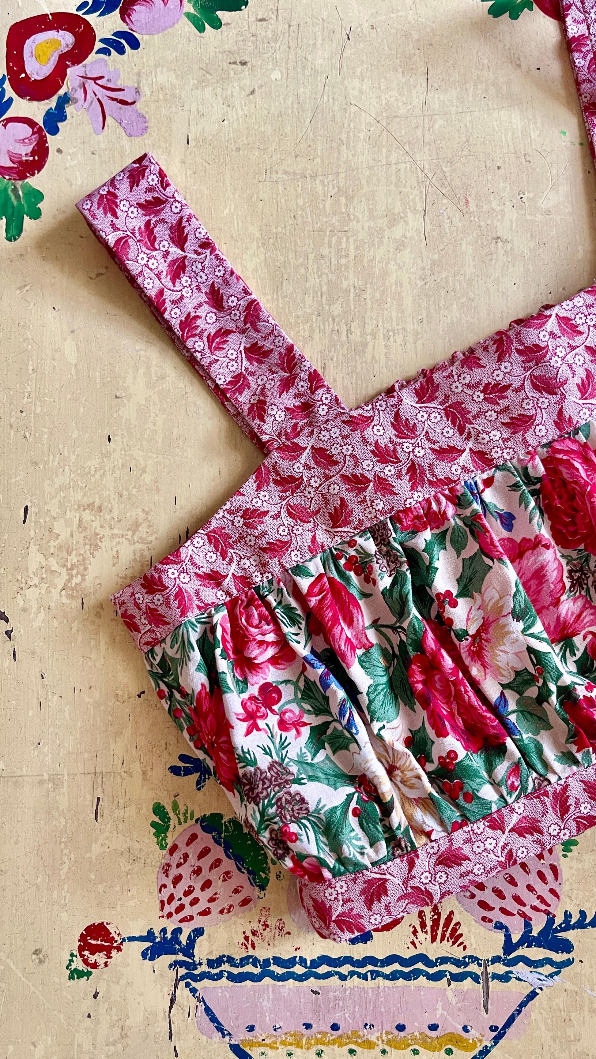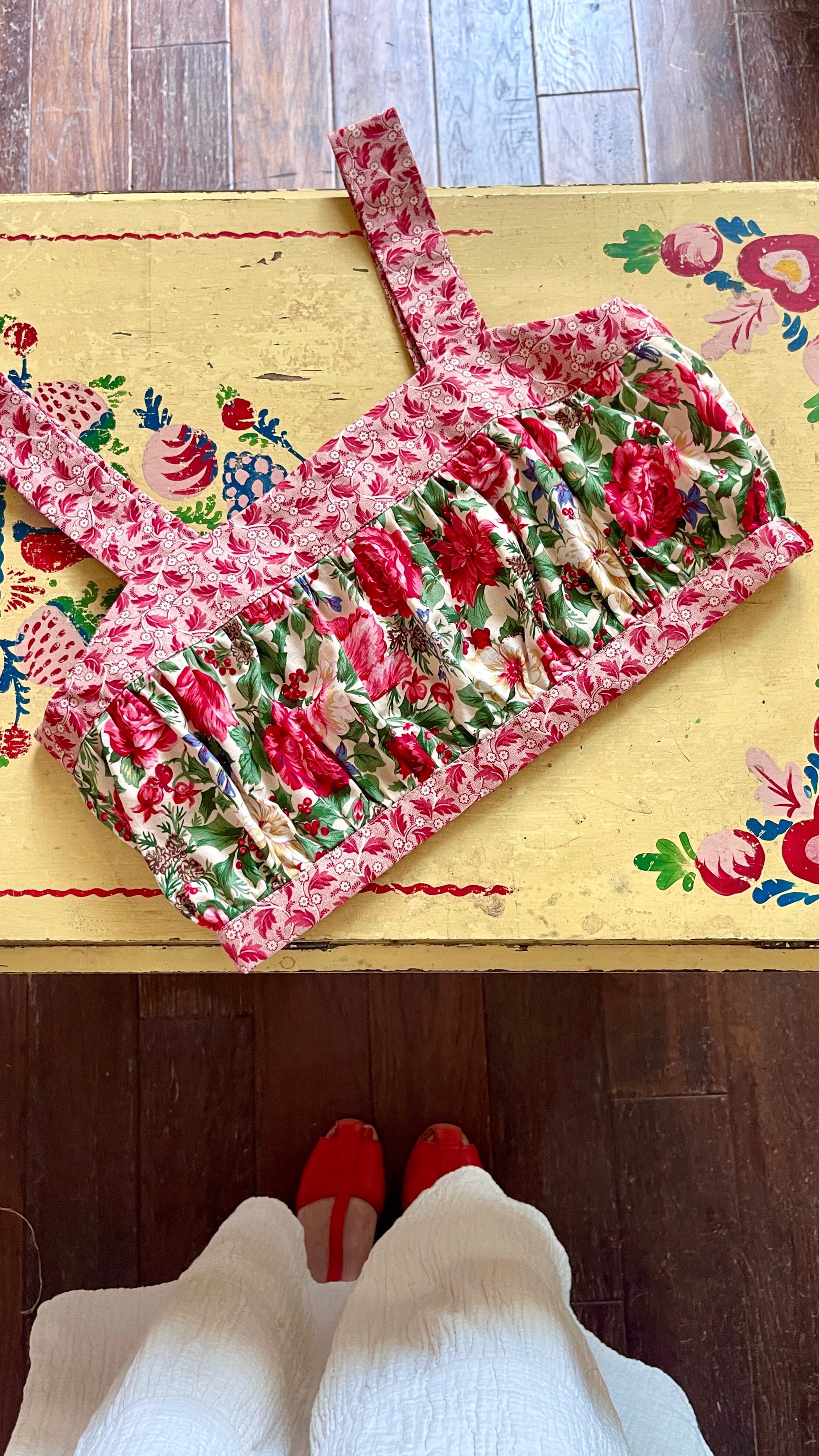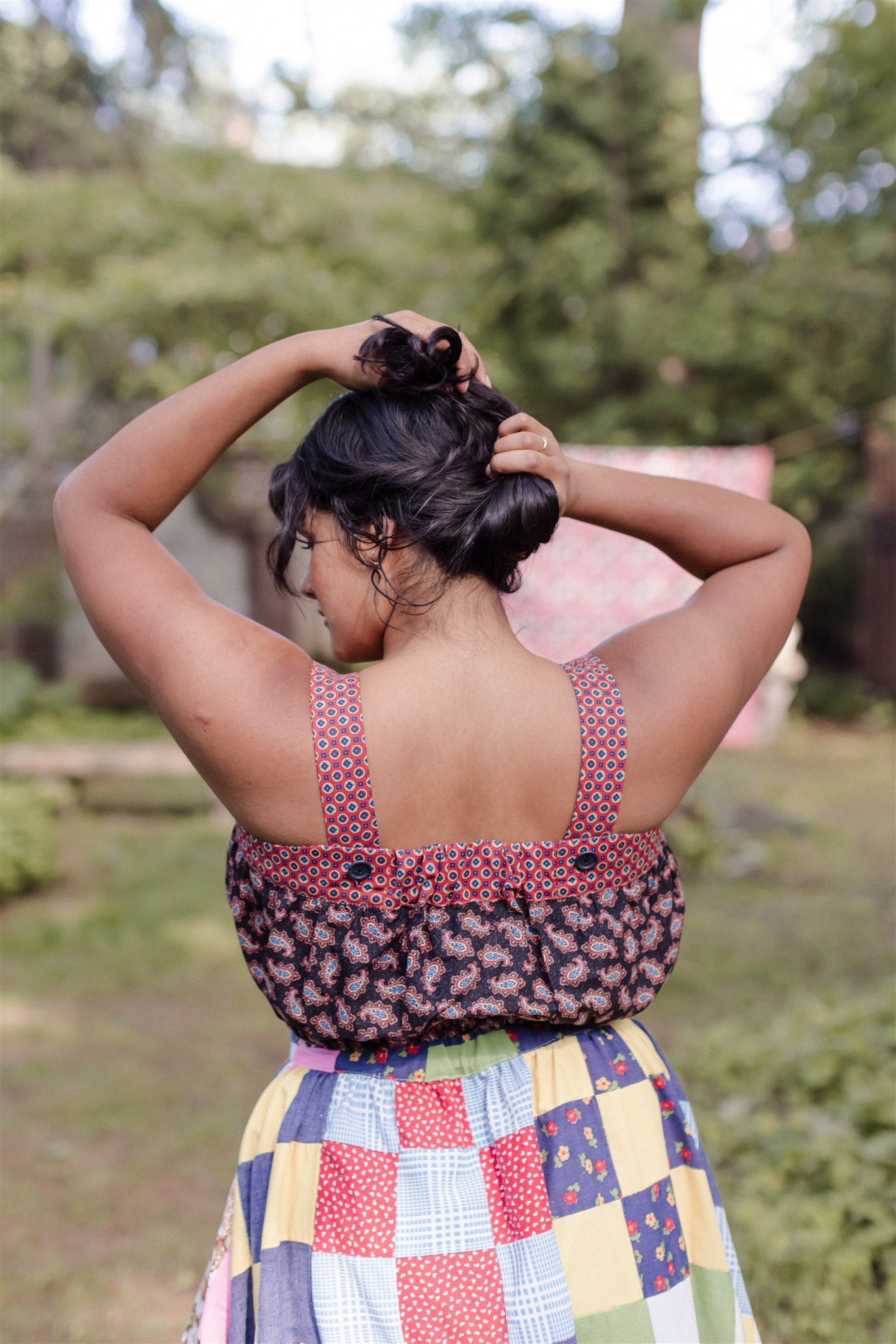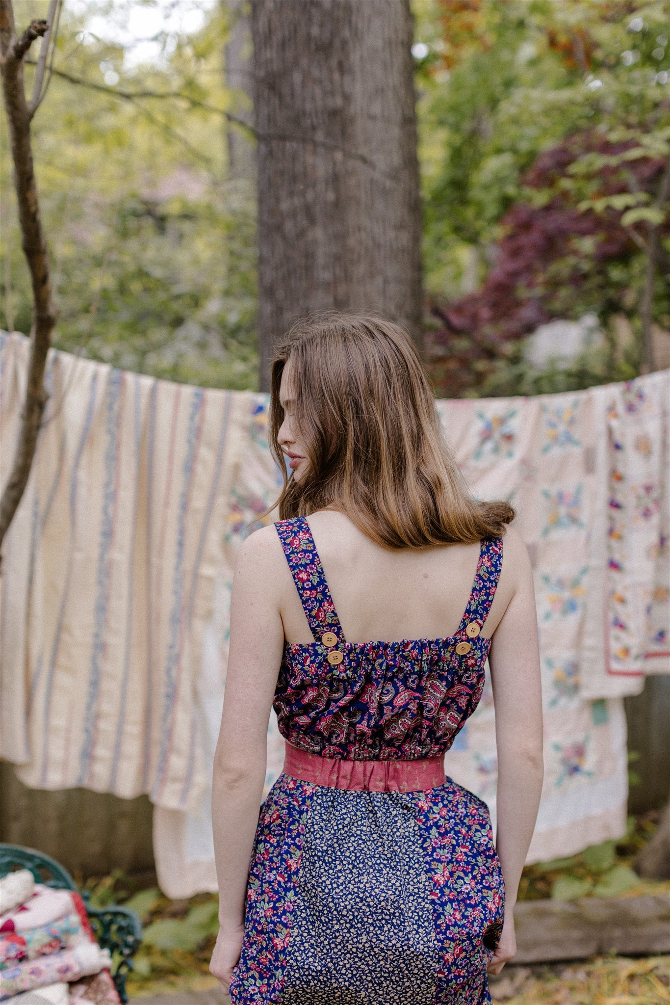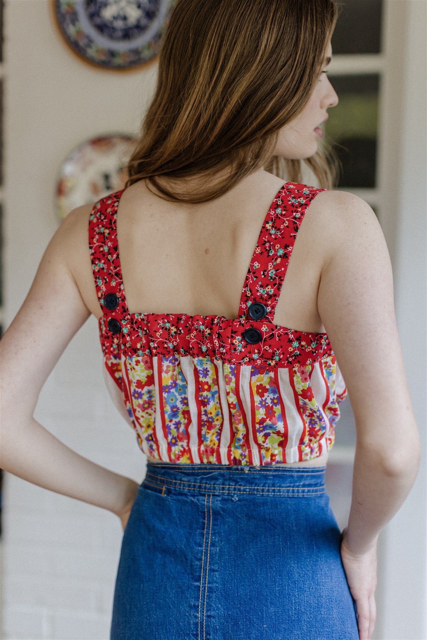 Quite possibly my favourite Honeybea piece of all time, the Zinnia Top is an endlessly versatile go-to with long skirts, white sailor pants, vintage overalls and high-waisted denim. Inspired by 1940s farmwear with wide straps and a boxy cut, it sits just above the bottom of the ribcage and is made for the perfect midriff moment. Cut and sewn in a once in a lifetime stash of gritty vintage gold and designed with an elasticated back for easy wearing and a flexible fit, we have introduced an adjustable strap with two big buttons in the back to make this small but mighty beauty even better than ever.