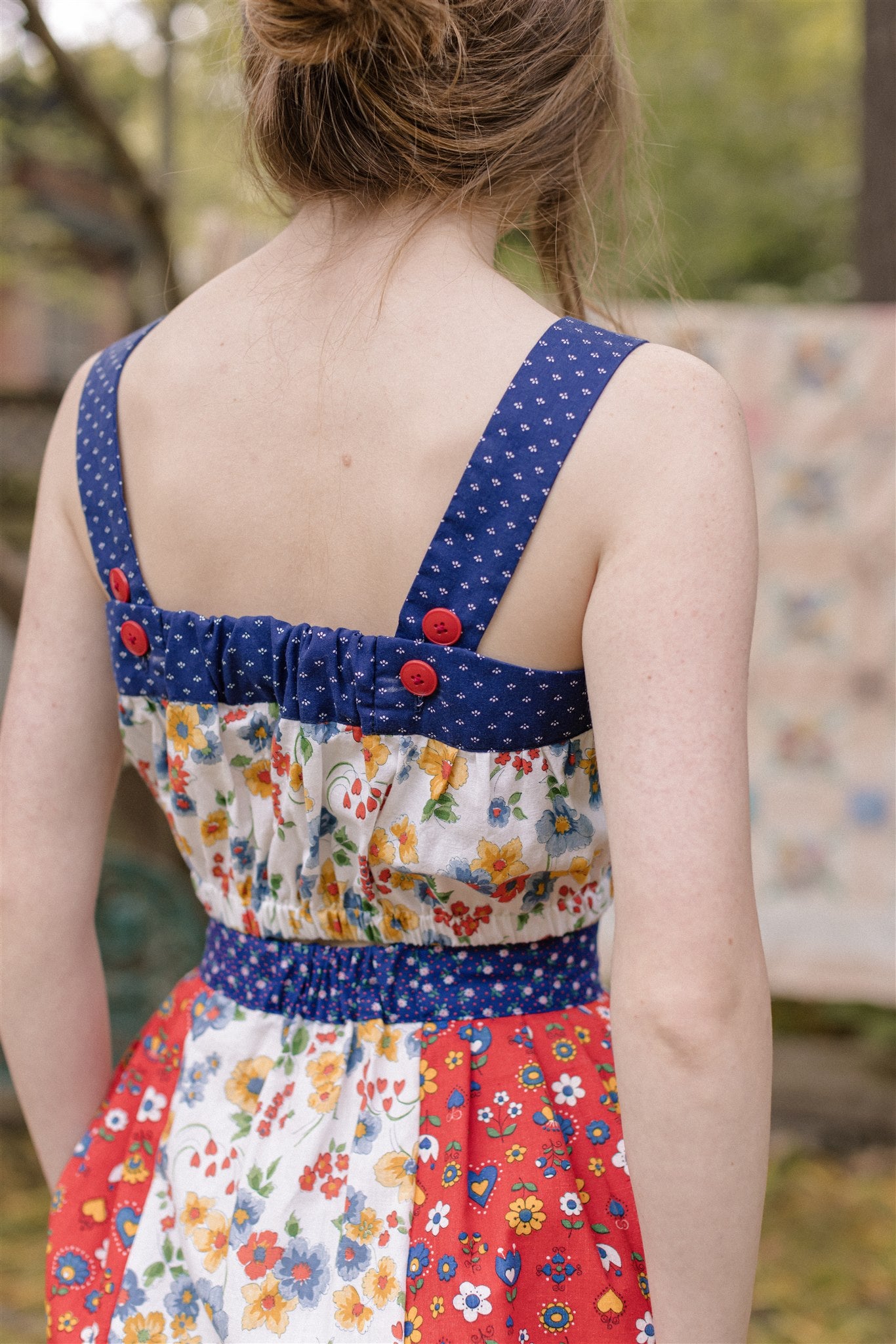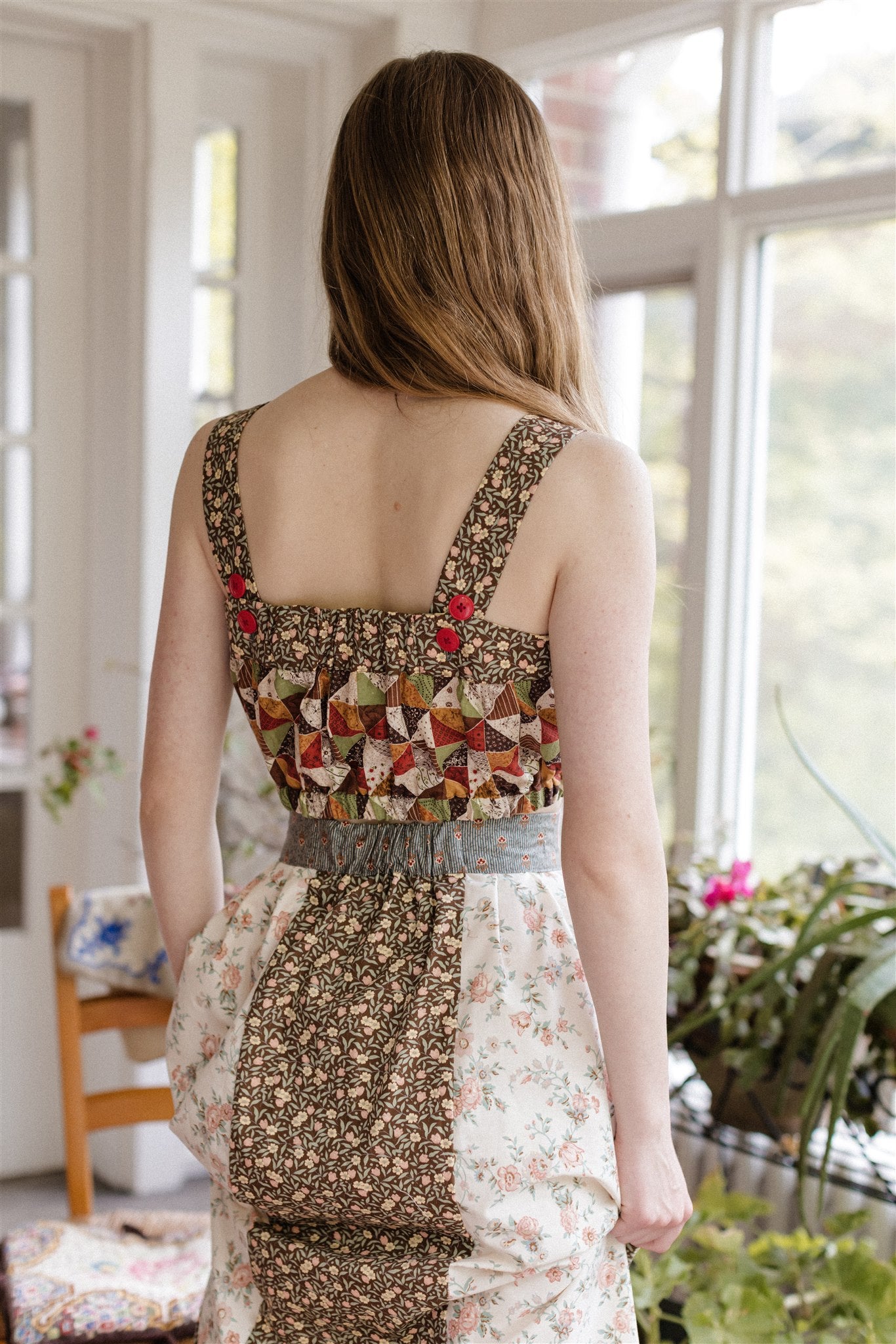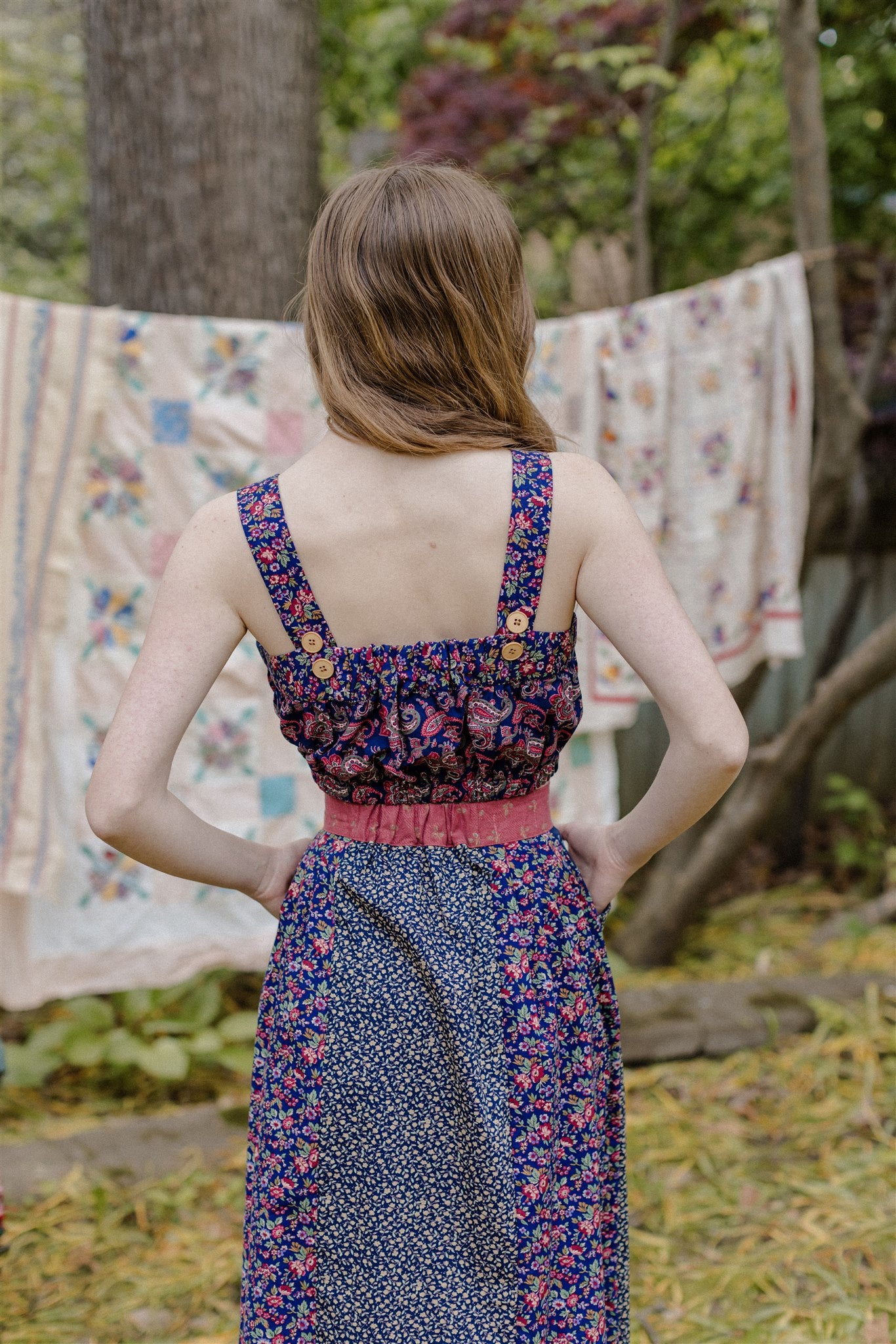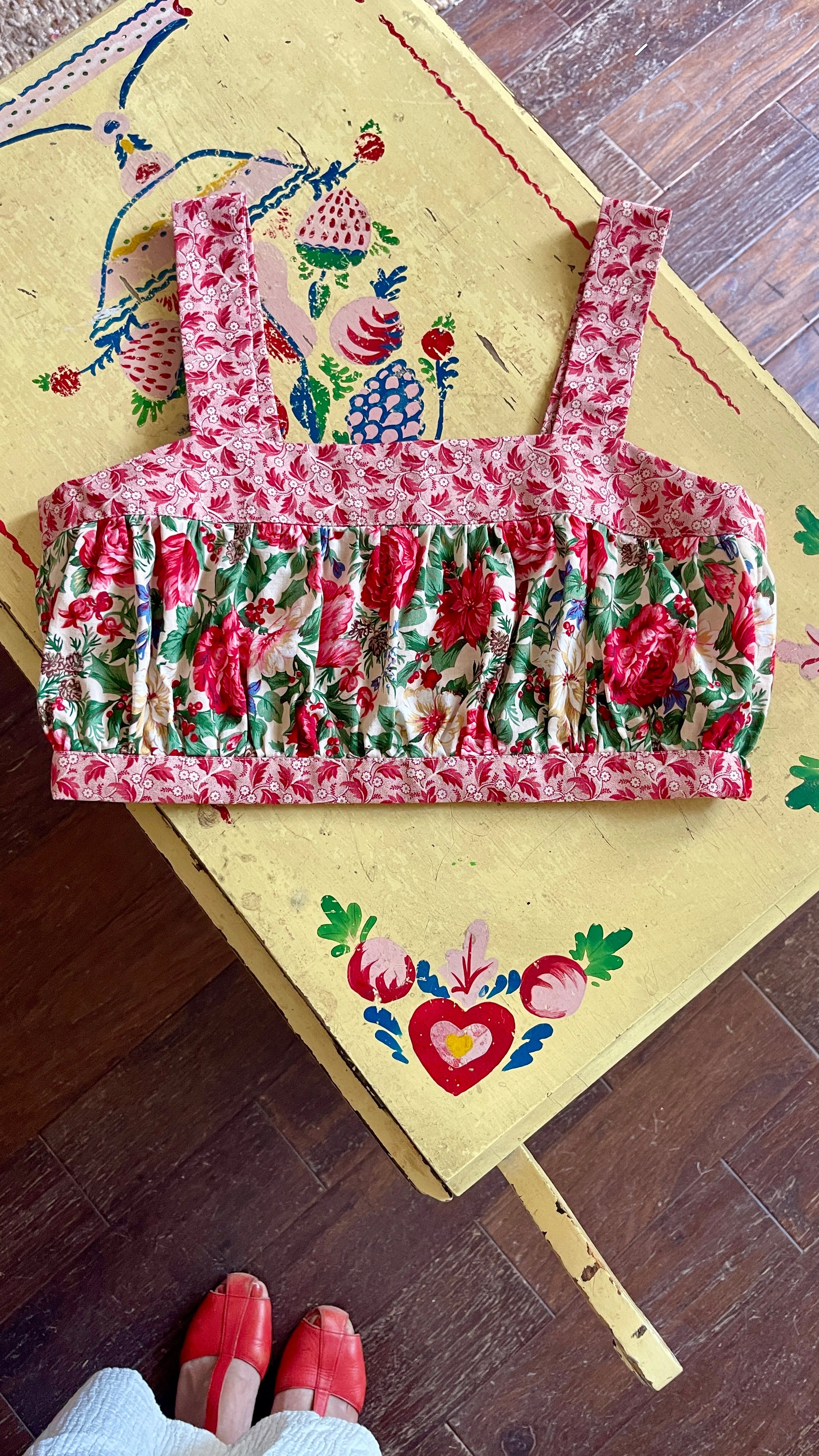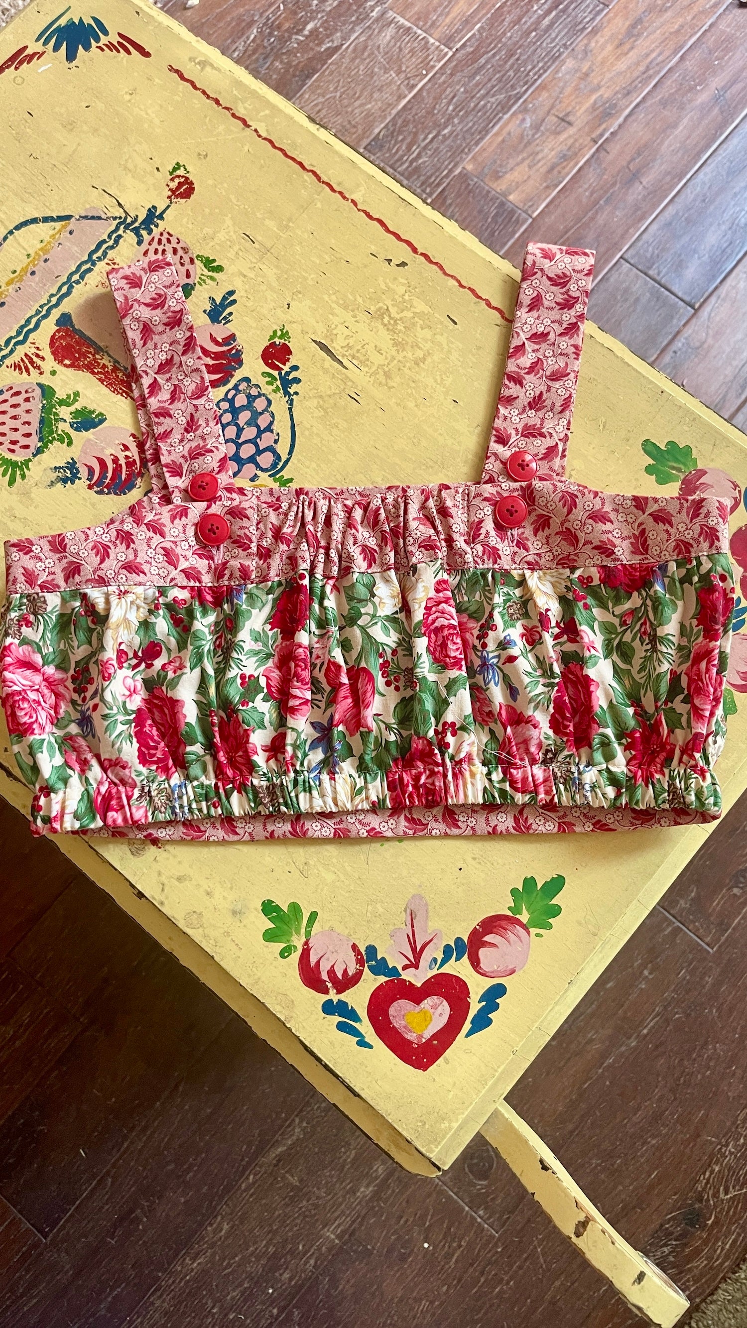 Quite possibly my favourite Honeybea piece of all time, the Zinnia Top is an endlessly versatile go-to with long skirts, white sailor pants, vintage overalls and high-waisted denim. Inspired by 1940s farmwear with wide straps and a boxy cut, it sits just above the bottom of the ribcage and is made for the perfect midriff moment. Cut and sewn in a once in a lifetime stash of gritty vintage gold and designed with an elasticated back for easy wearing and a flexible fit, we have introduced an adjustable strap with two big buttons in the back to make this small but mighty beauty even better than ever.
