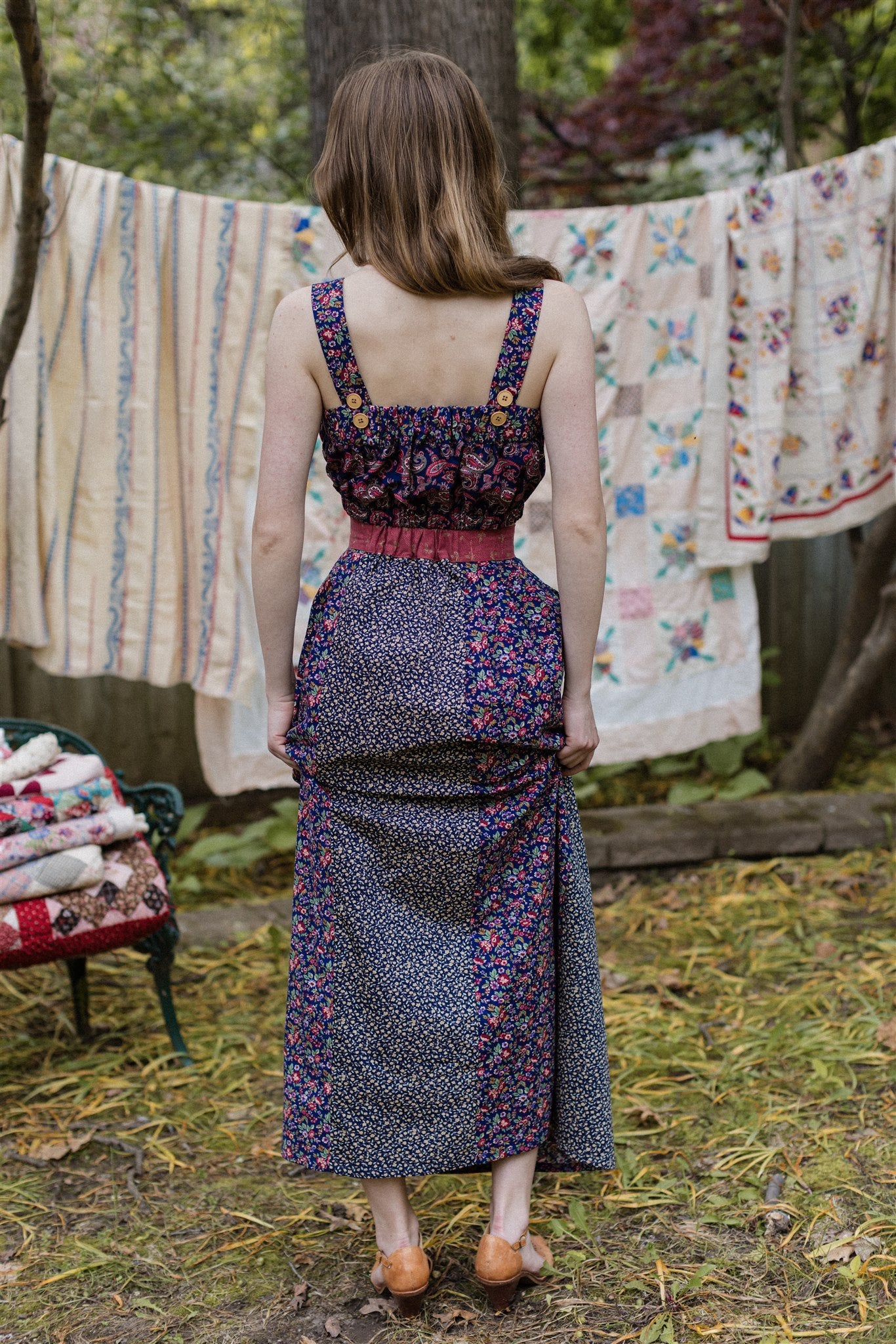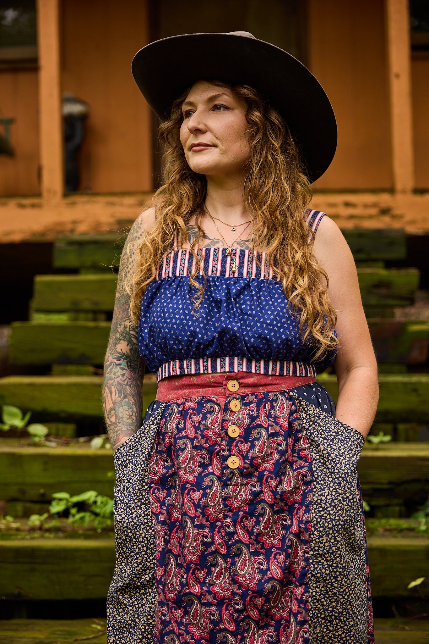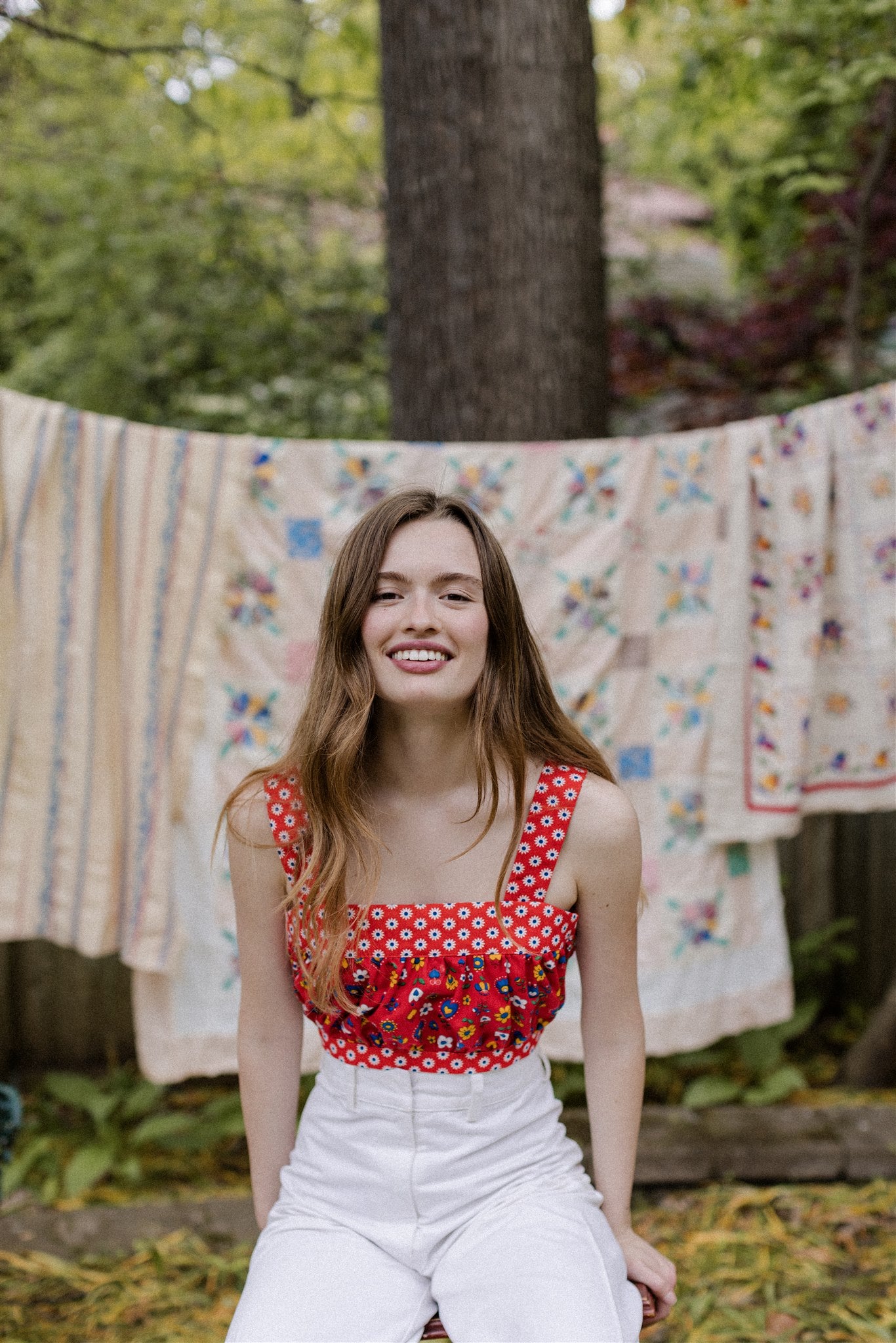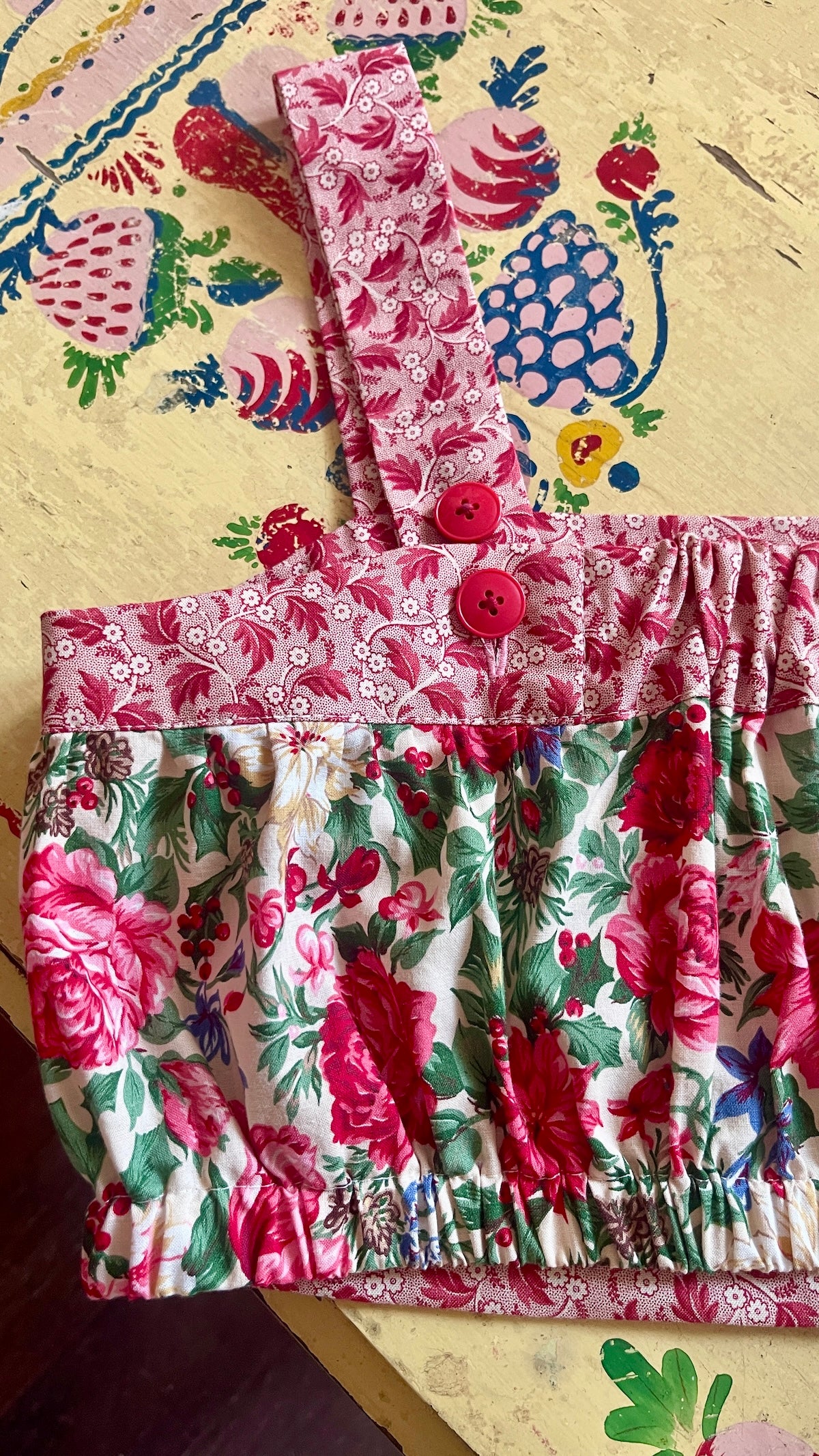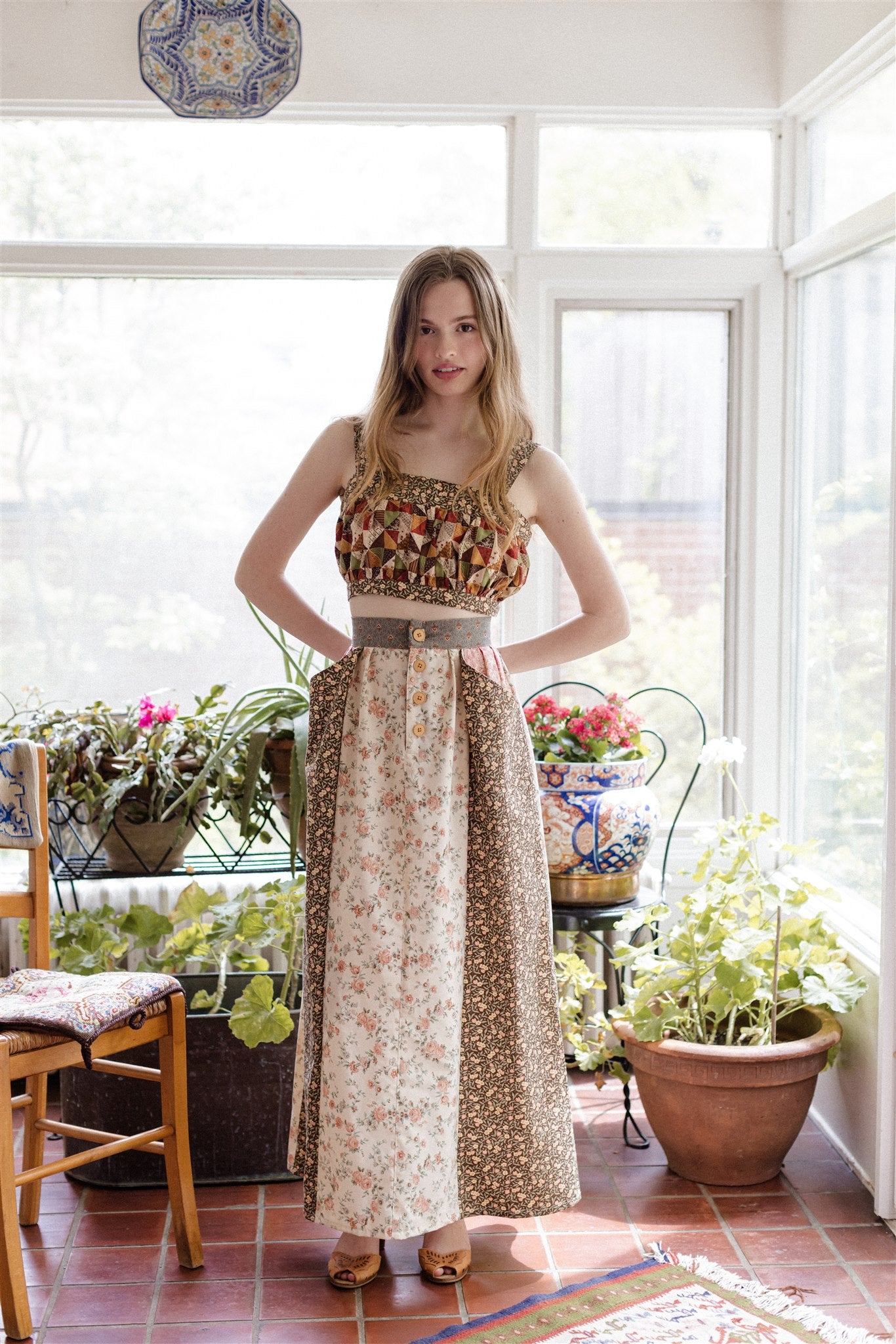 Quite possibly my favourite Honeybea piece of all time, the Zinnia Top is an endlessly versatile go-to with long skirts, white sailor pants, vintage overalls and high-waisted denim. Inspired by 1940s farmwear with wide straps and a boxy cut, it sits just above the bottom of the ribcage and is made for the perfect midriff moment. Cut and sewn in a once in a lifetime stash of gritty vintage gold and designed with an elasticated back for easy wearing and a flexible fit, we have introduced an adjustable strap with two big buttons in the back to make this small but mighty beauty even better than ever.