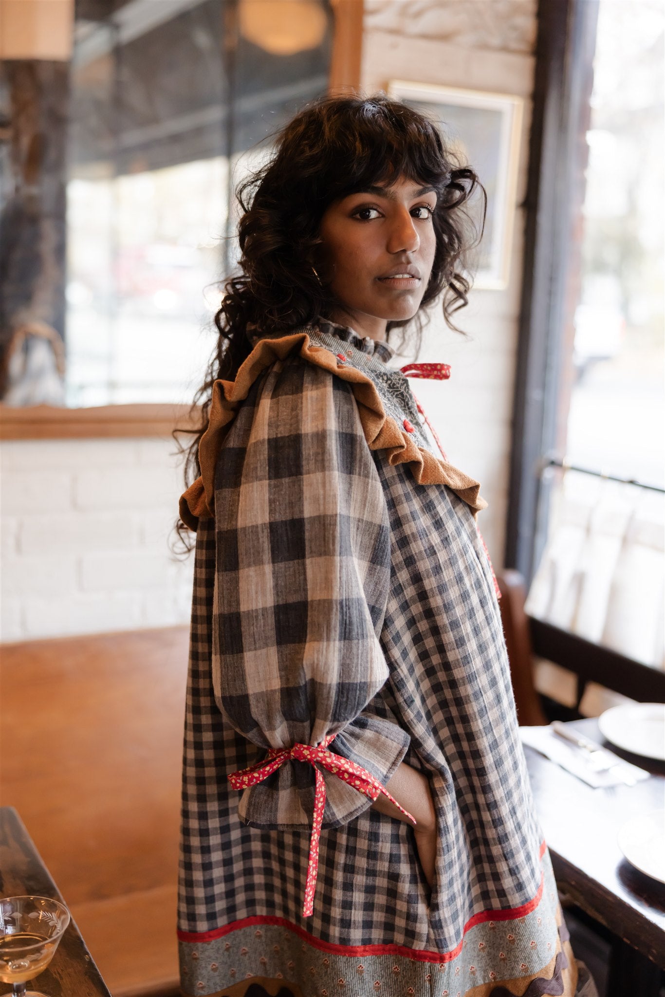 Sewn in a decadent double gauze check with a mix of deadstock textiles and antique trimmings, this limited edition collection consists of only 8 sustainably made pieces.